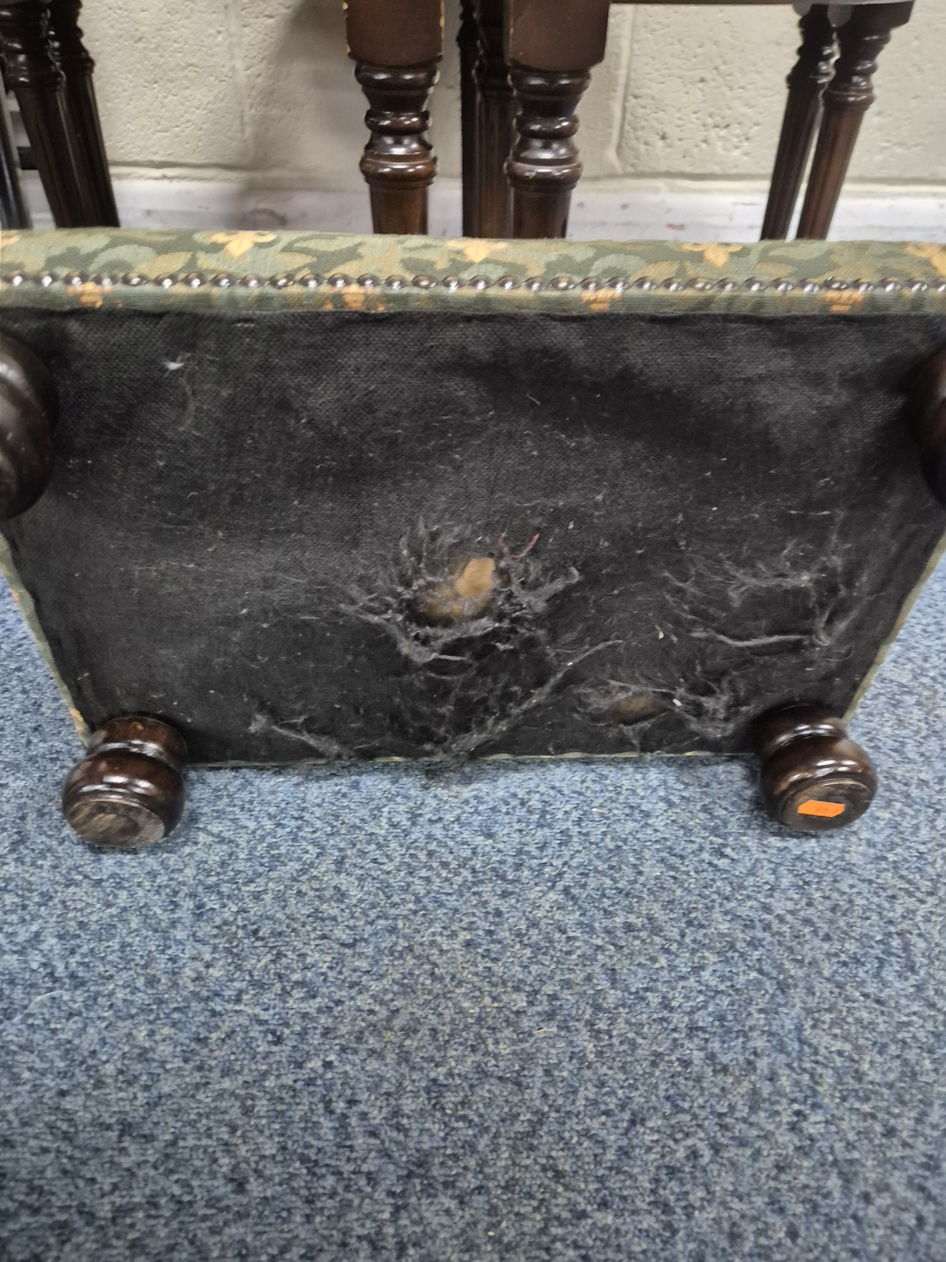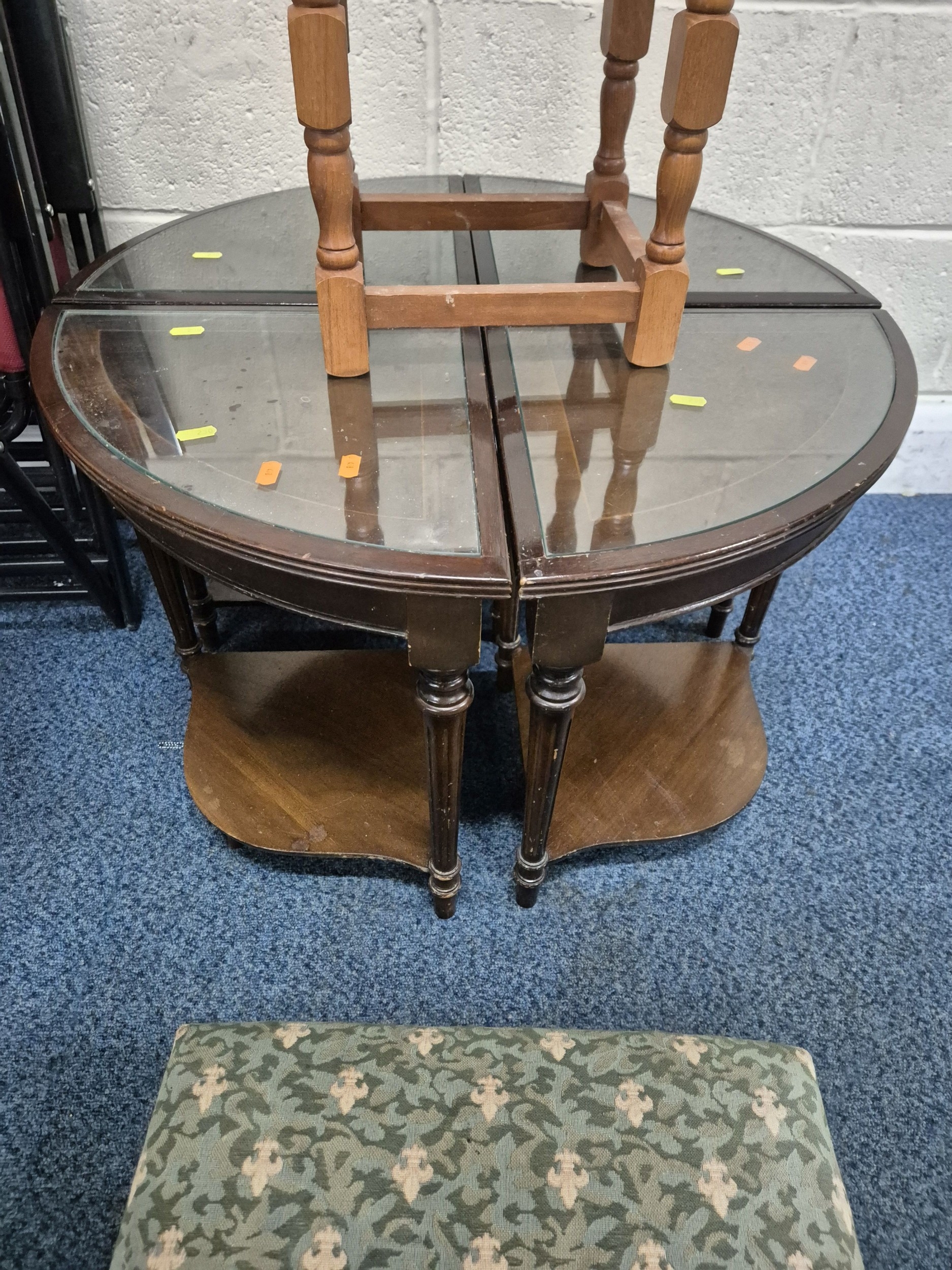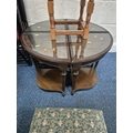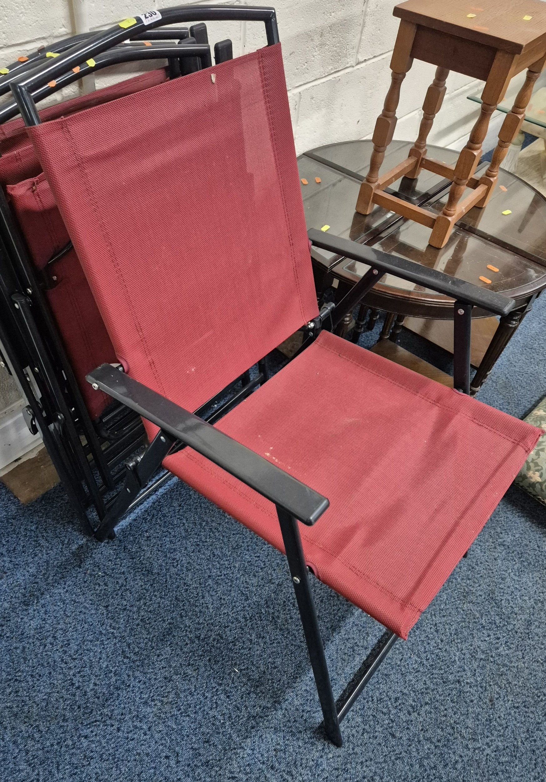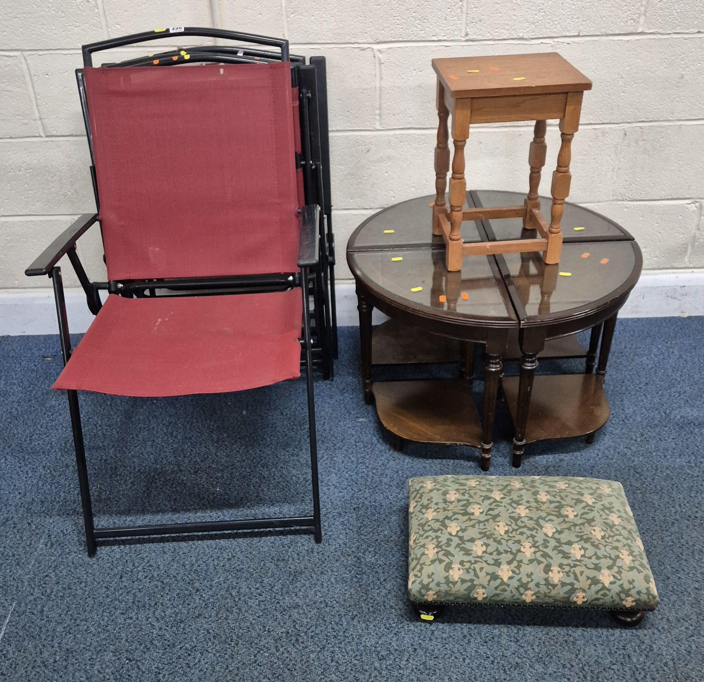 A SET OF FOUR FOLDING GARDEN CHAIRS, a set of four mahogany corner chairs, along with a stool and another table, condition report: marks, scuffs, other wear and usage (10)