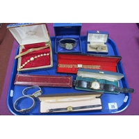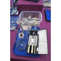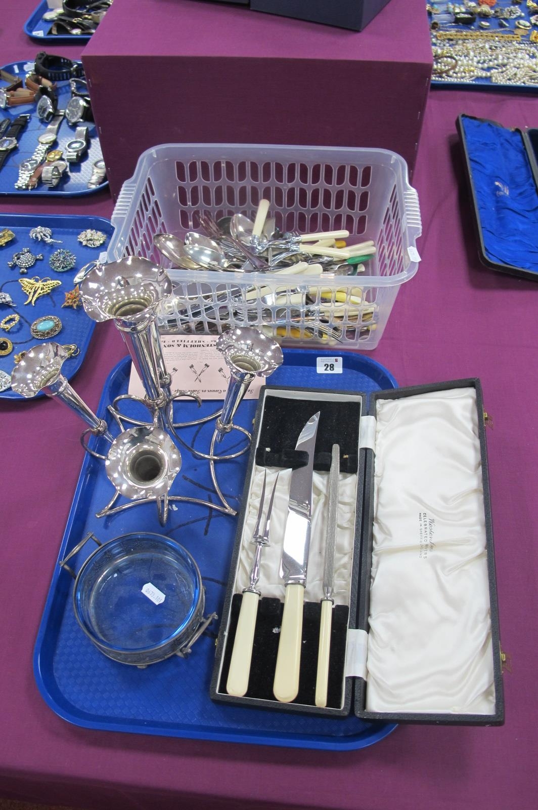 A Hallmarked Silver Twin Handled Dish, GN RH, Chester 1900, of pierced design with angular twin handles and shallow blue glass liner, on bun feet, overall width over handles 15.3cm; together with a plated five flute epergne, a cased meat carving set and assorted plated cutlery :- One Tray
