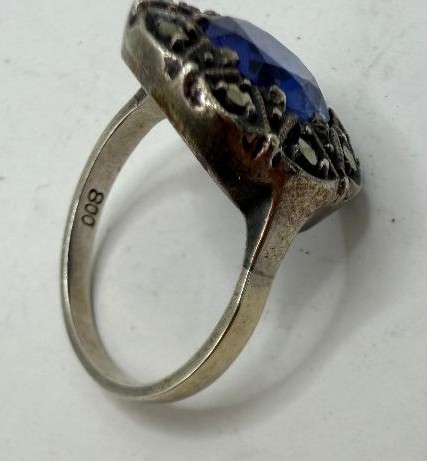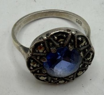 Jewellery : Vintage continental Silver ring size O with central blue stone 4.7g