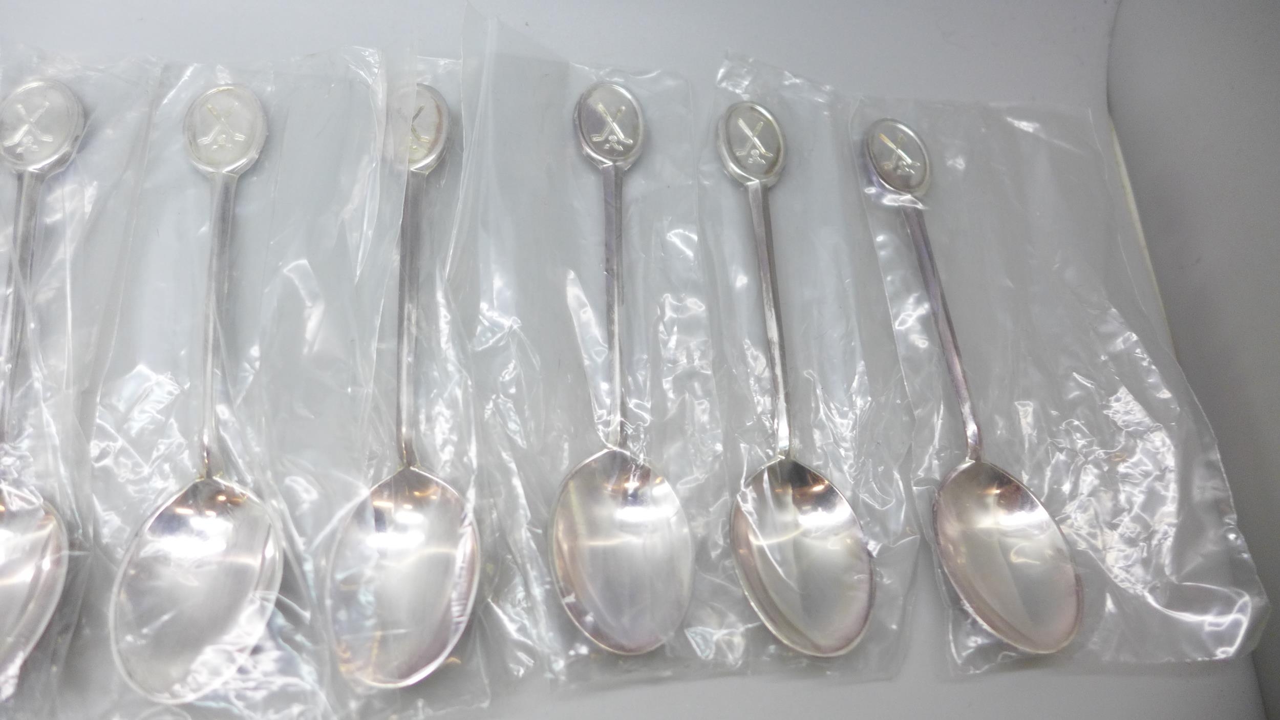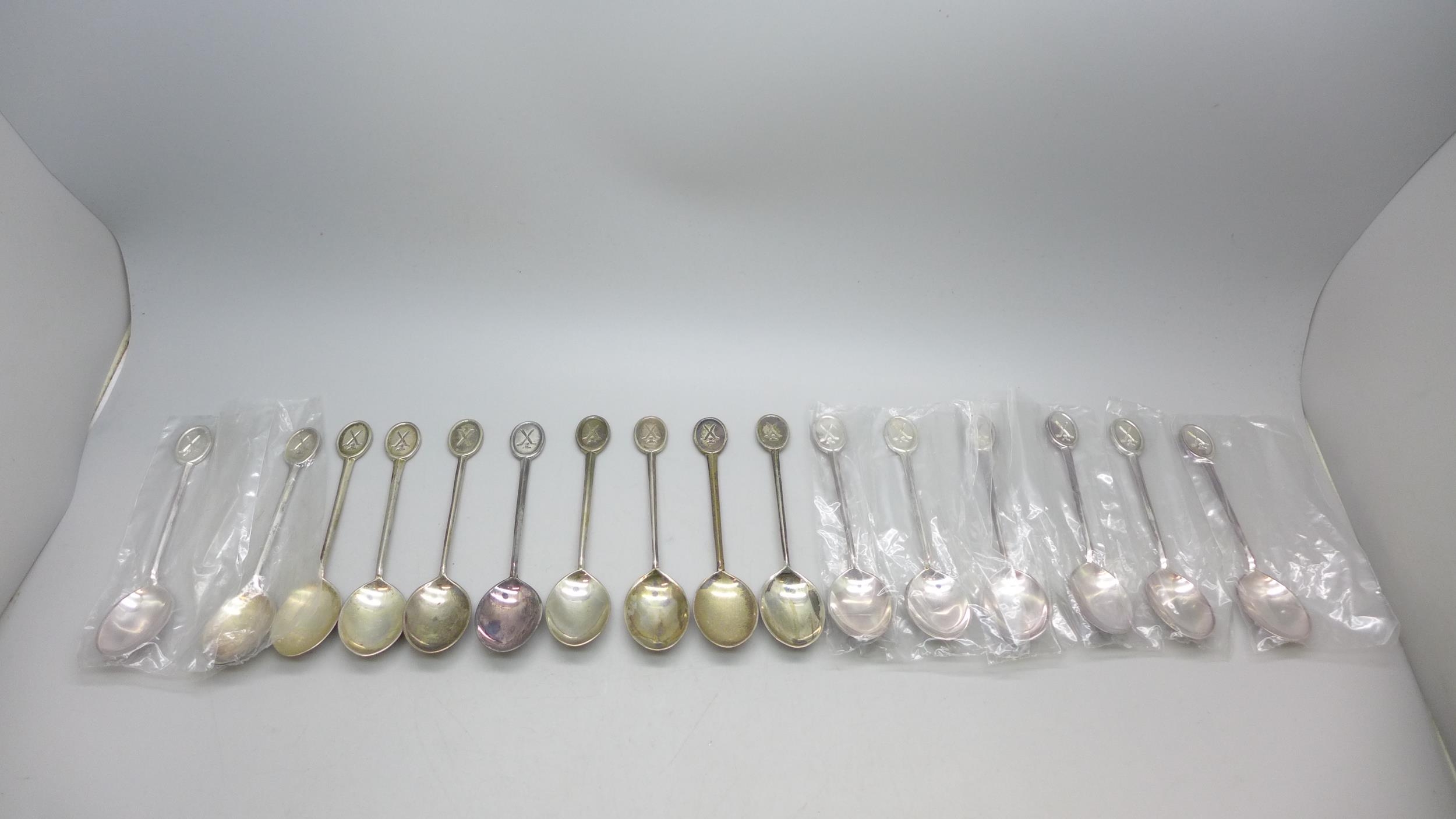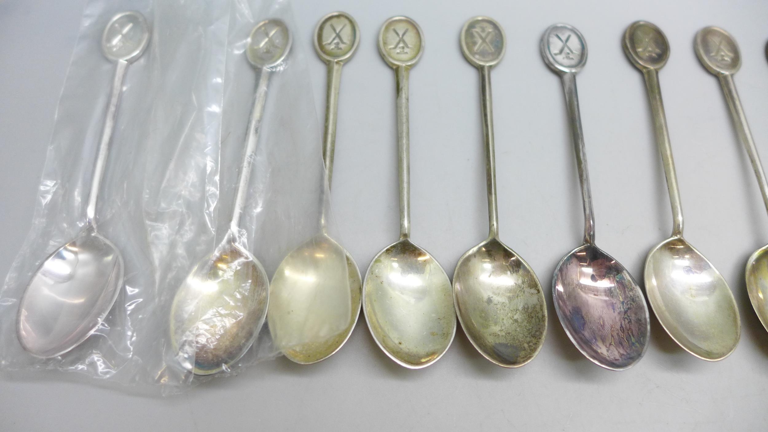 A set of sixteen silver spoons with golf monogram, all the same maker but different years, some sealed, 180g