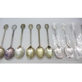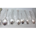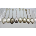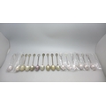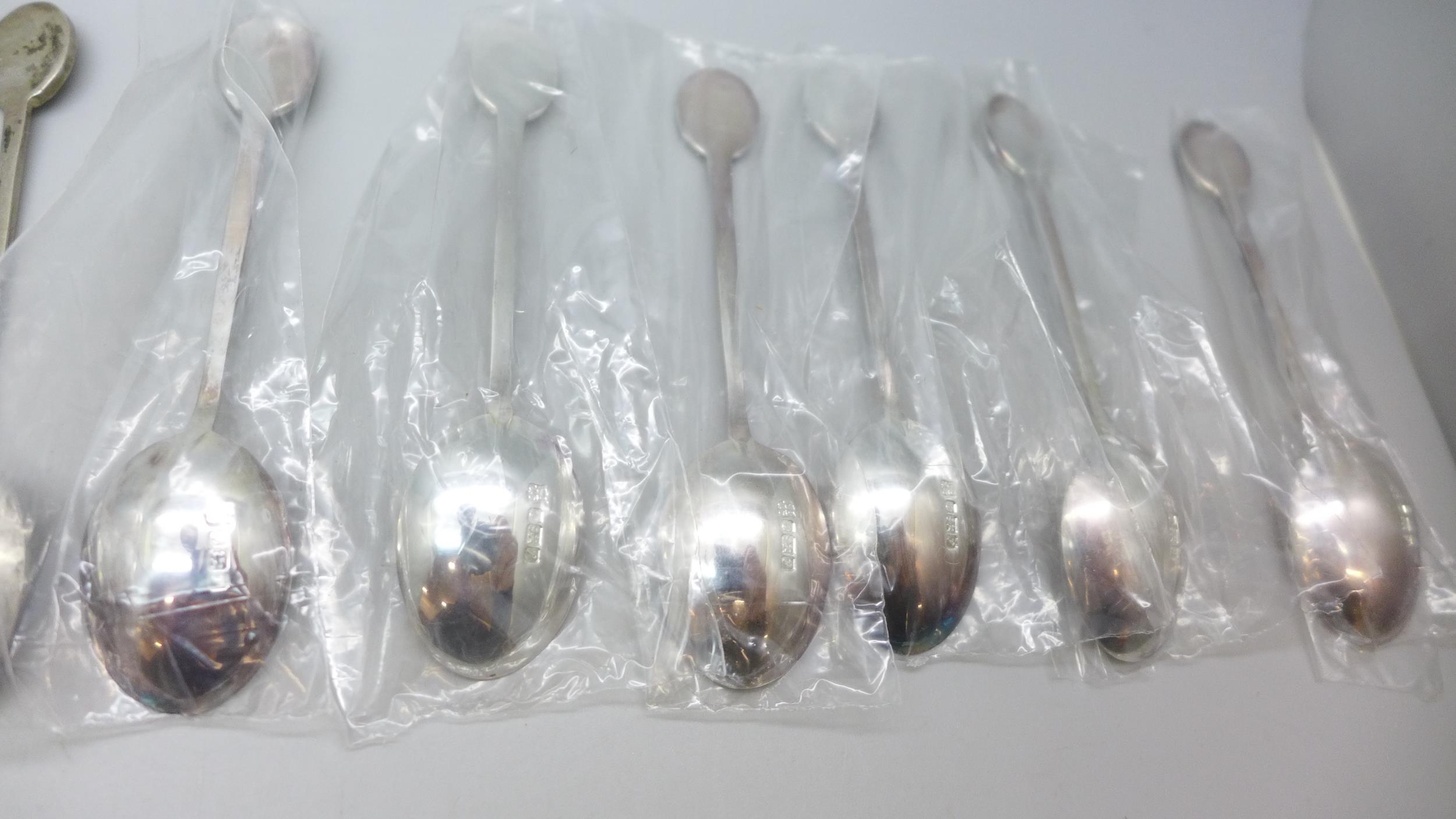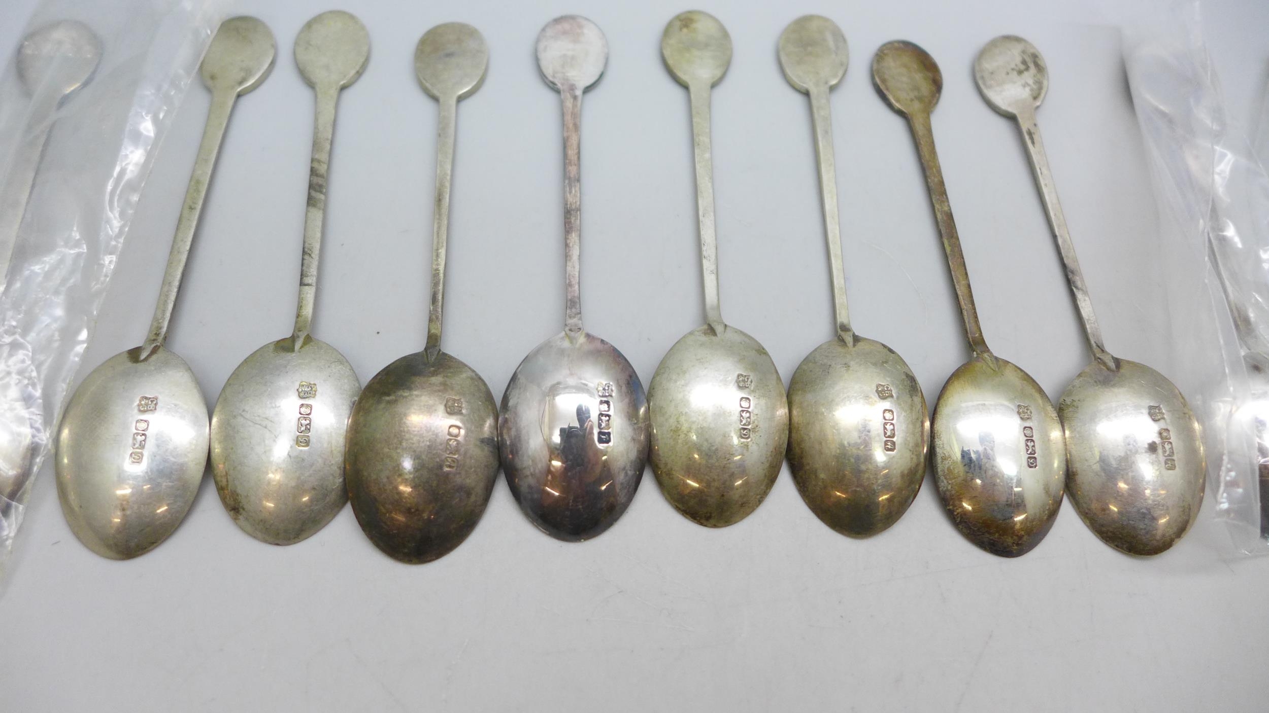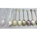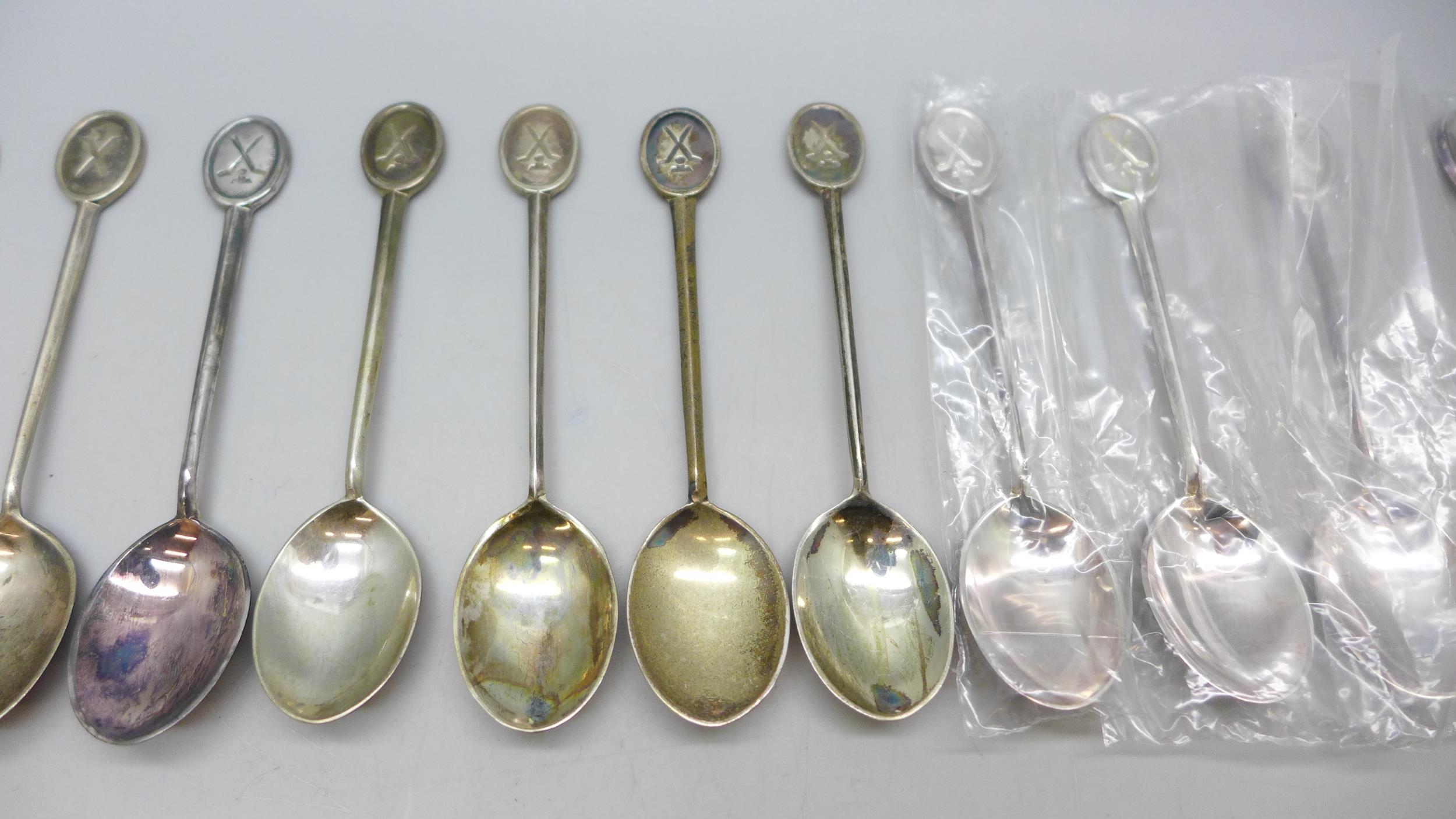 A set of sixteen silver spoons with golf monogram, all the same maker but different years, some sealed, 180g