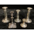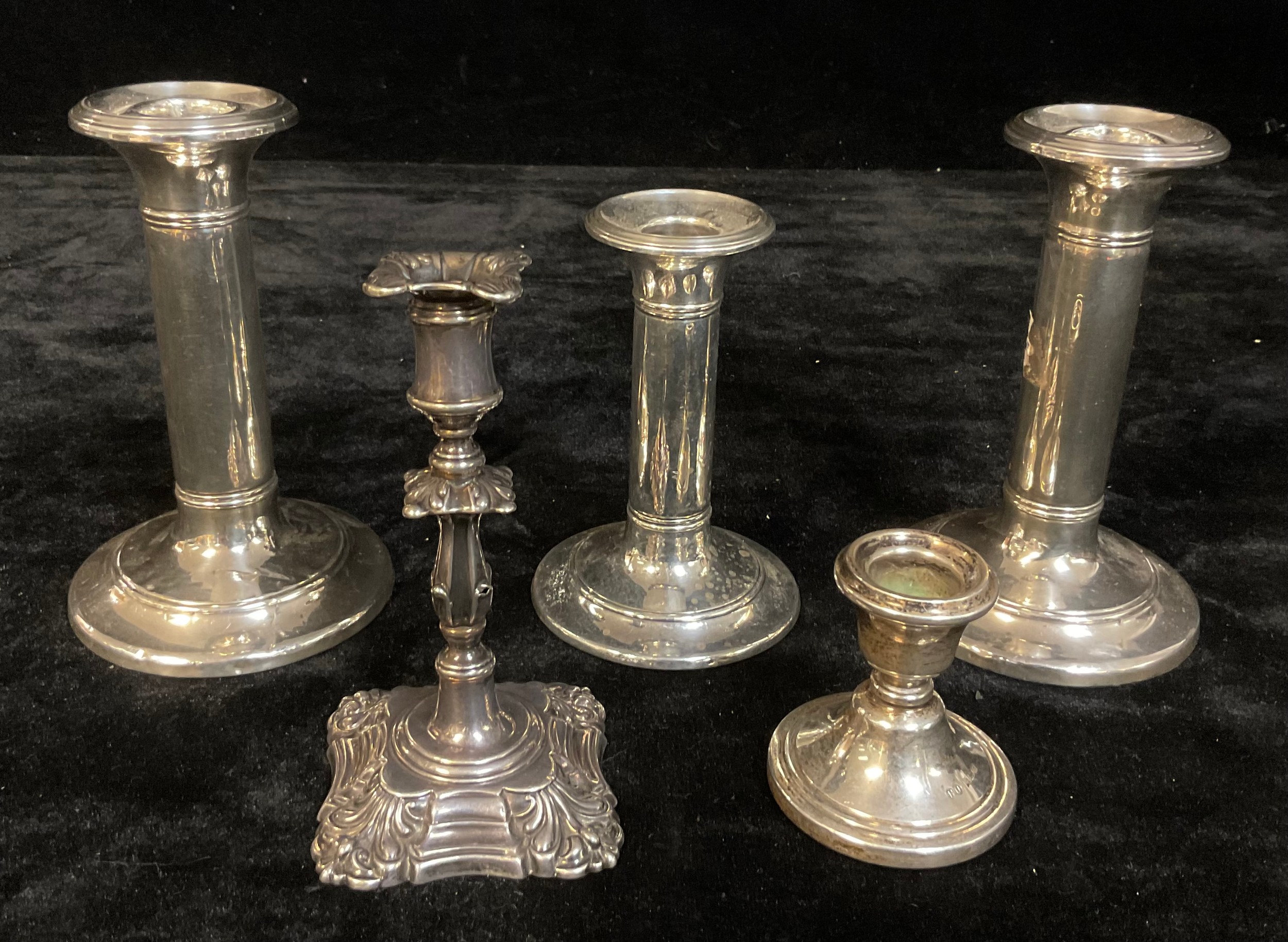 A pair of Edwardian silver candlesticks, 13.5cm high, Birmingham 1905; other silver candlesticks; a Victorian silver taper stick, London 1890 (5)