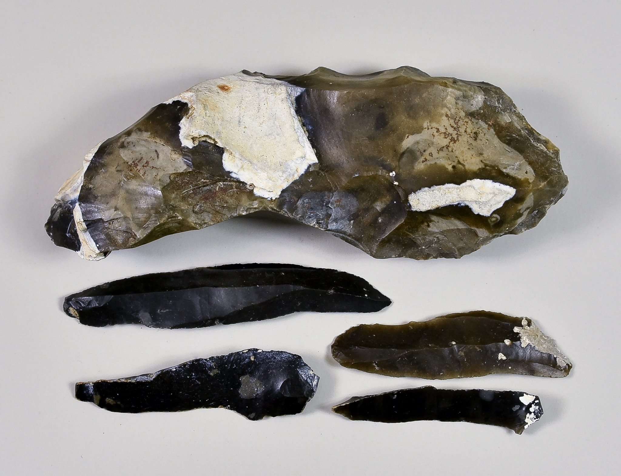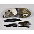 A Small Collection of Neolithic Flint Tools, comprising, four blades, varying in size from 4.5ins to 3ins overall, and a knapped handaxe, 7ins overall, all discovered at Seasalter, Whitstable, Kent, England