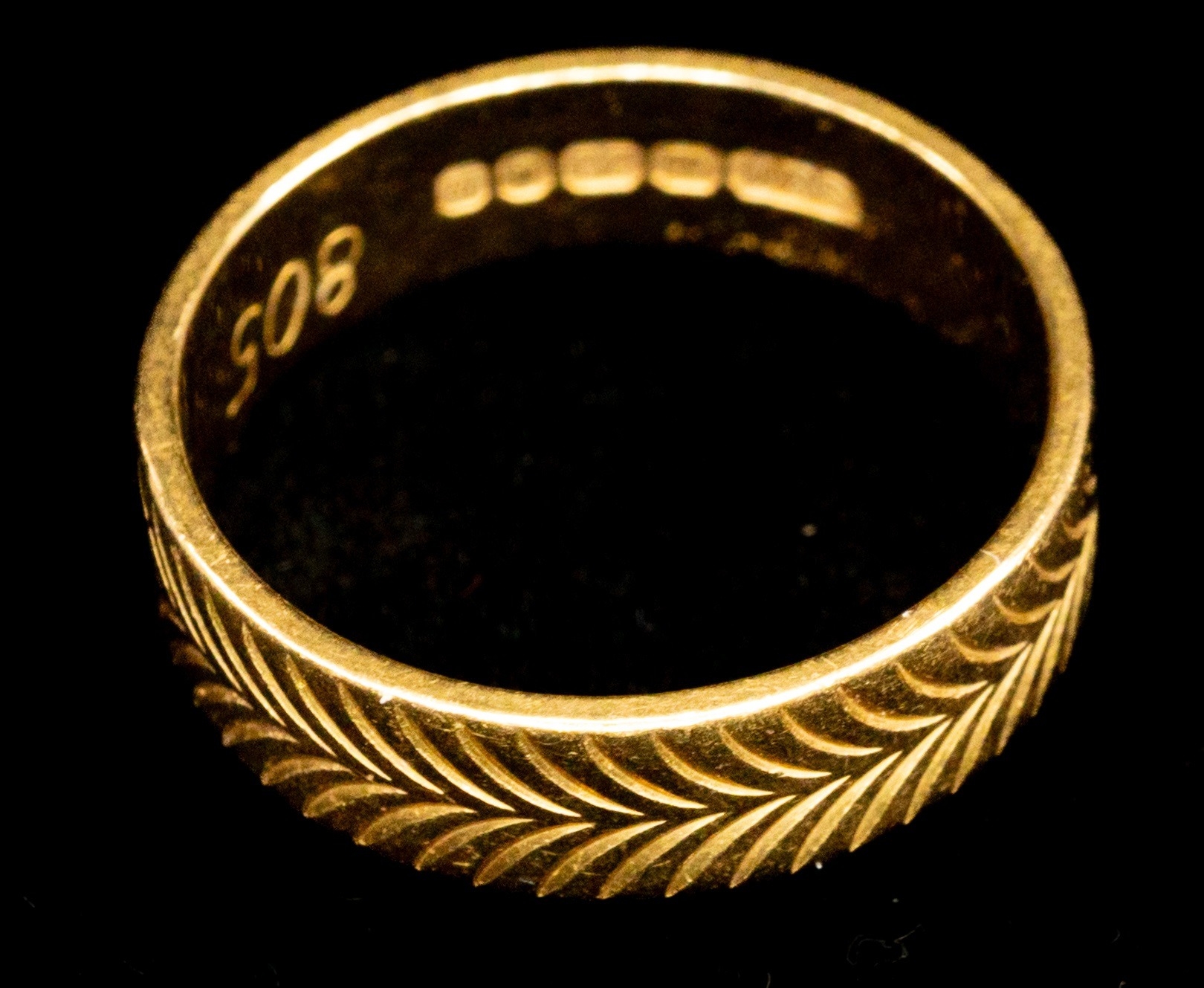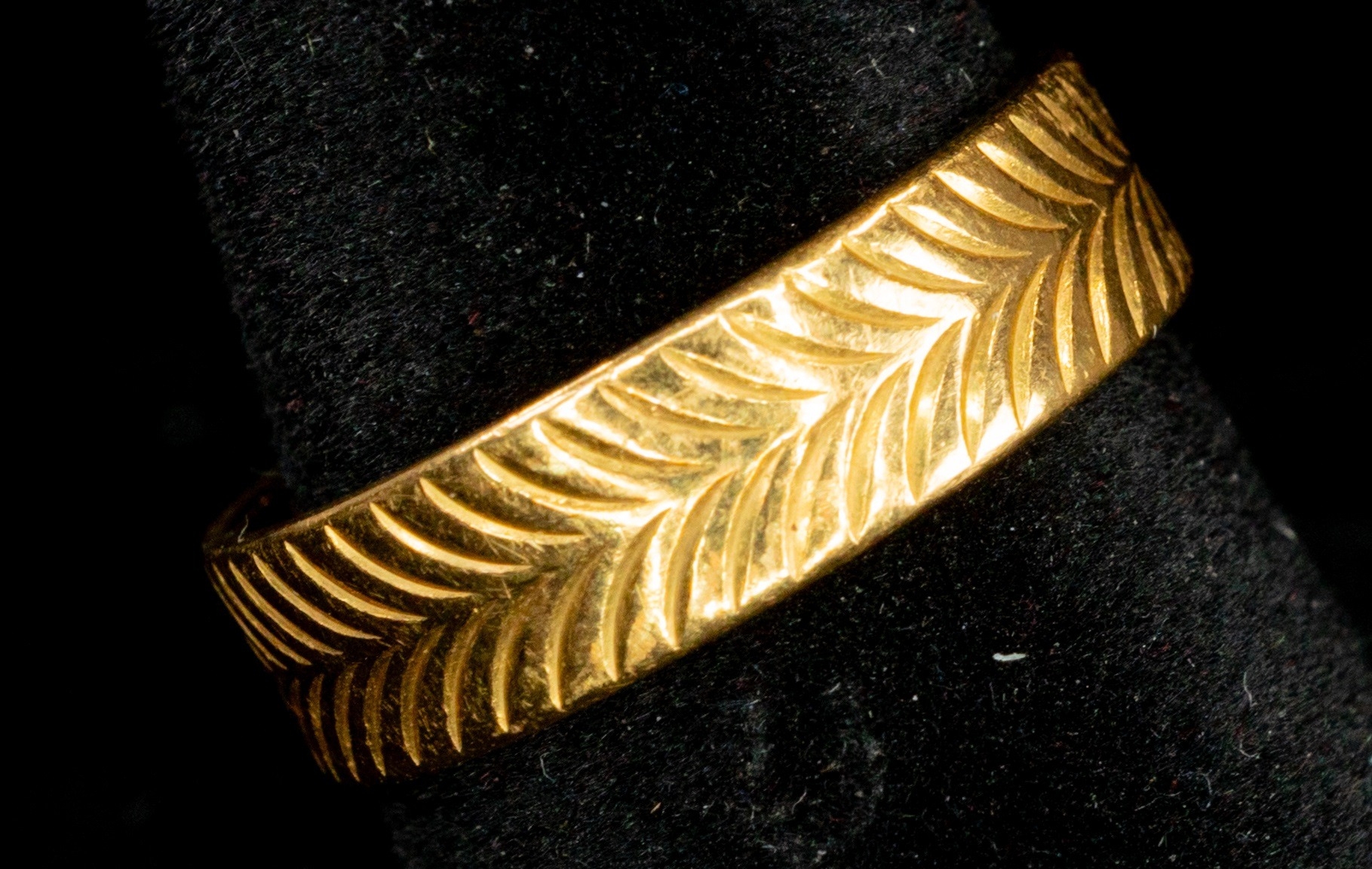 Jewellery: 22ct gold 4.5mm band with chevron pattern, ring size L, 4.3g.