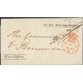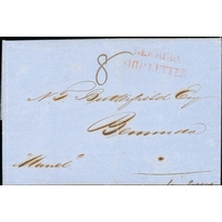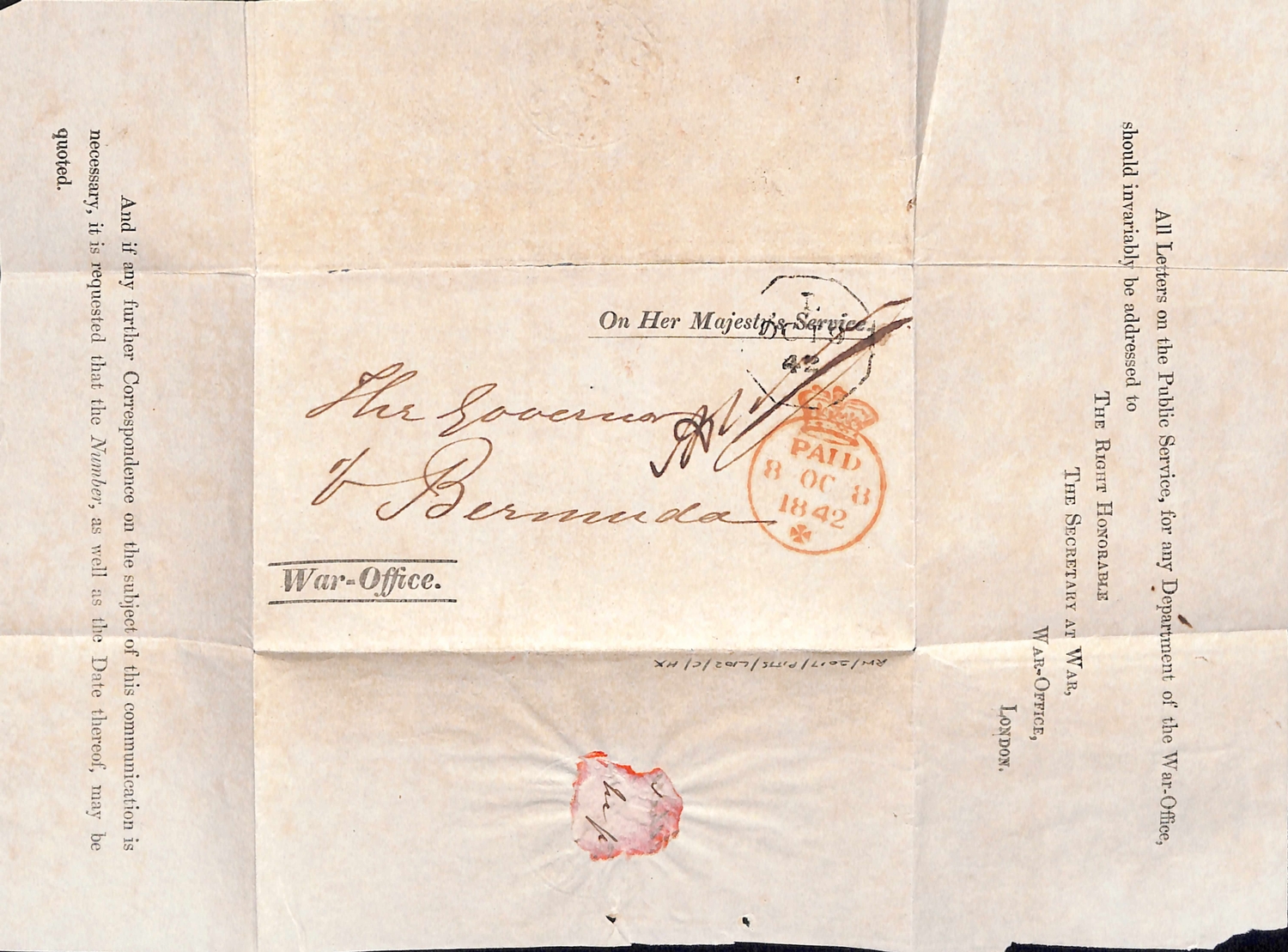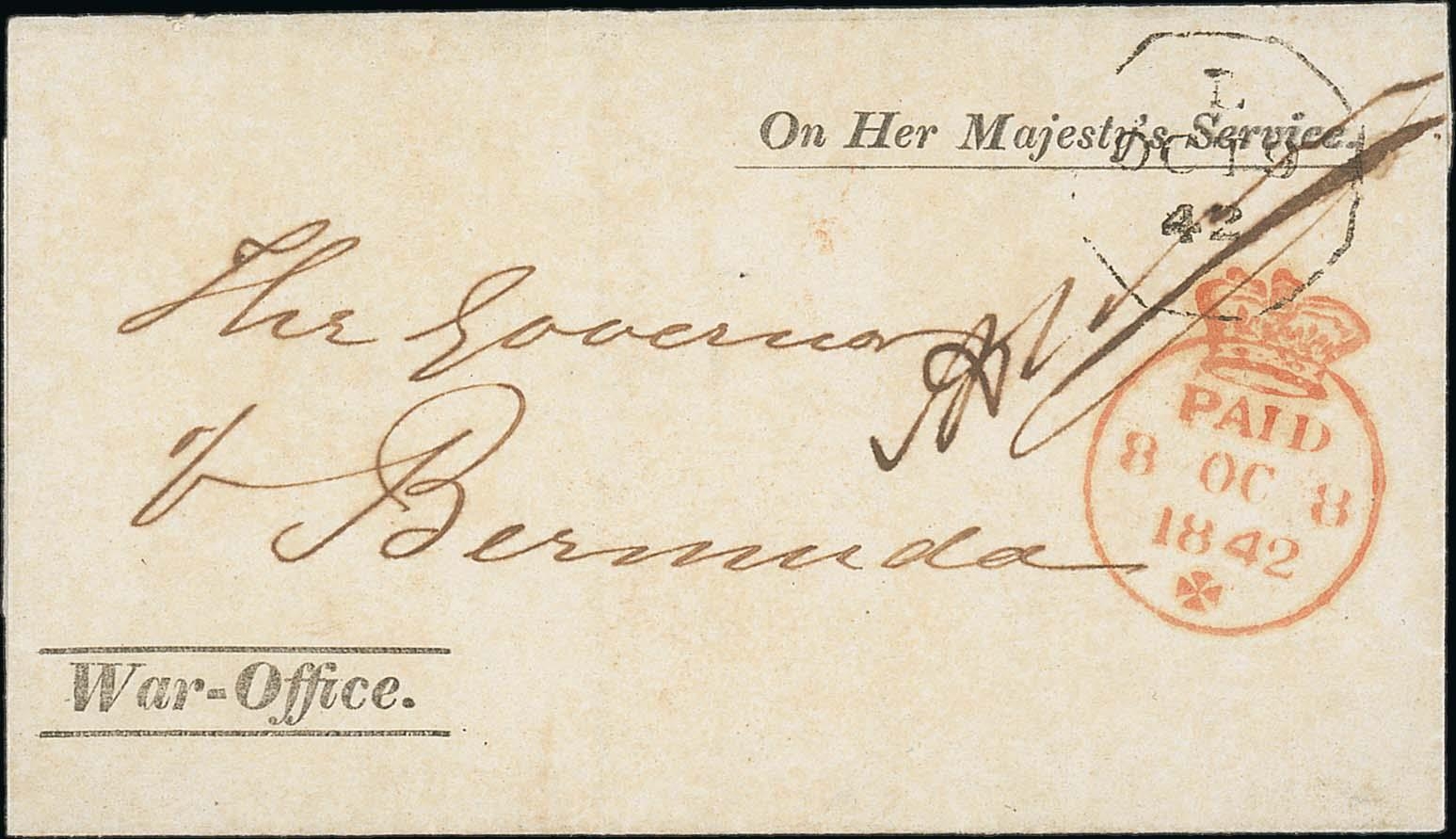 1842 (Oct 8) Printed O.H.M.S War-Office entire with red crowned Paid datestamp, addressed to "The Governor of Bermuda", with scarce octagonal "L / OC 19 / 42" datestamp of Liverpool used on Cunard packet letters. Carried on the "Caledonia" to Halifax and then by the "Lady Ogle". An unusual official letter. Photo on Page 12.