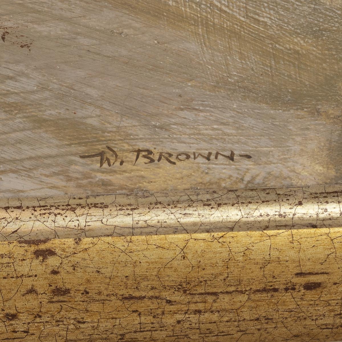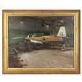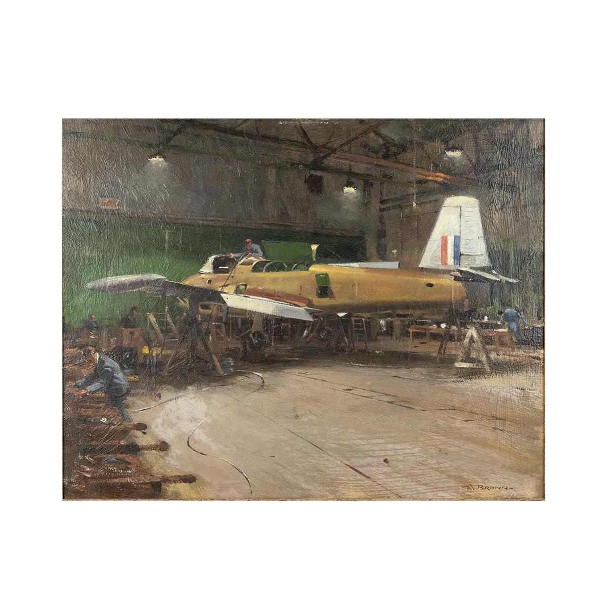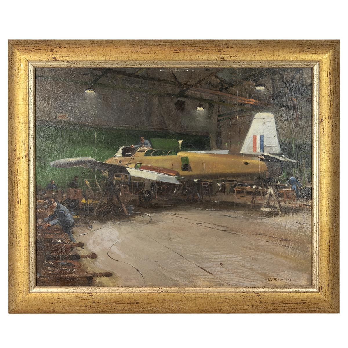 W Brown circa 1950 mechanics tending a military aircraft, a Hunting Percival Jet Provost, with tricolour to tail fin, in a hangar, oil on board, framed. Signed lower right. Opening 44.5cm x 34.5cm.