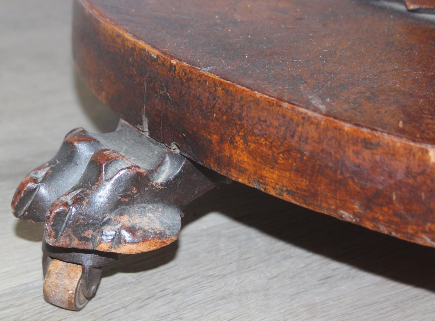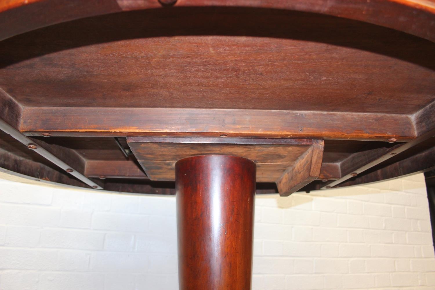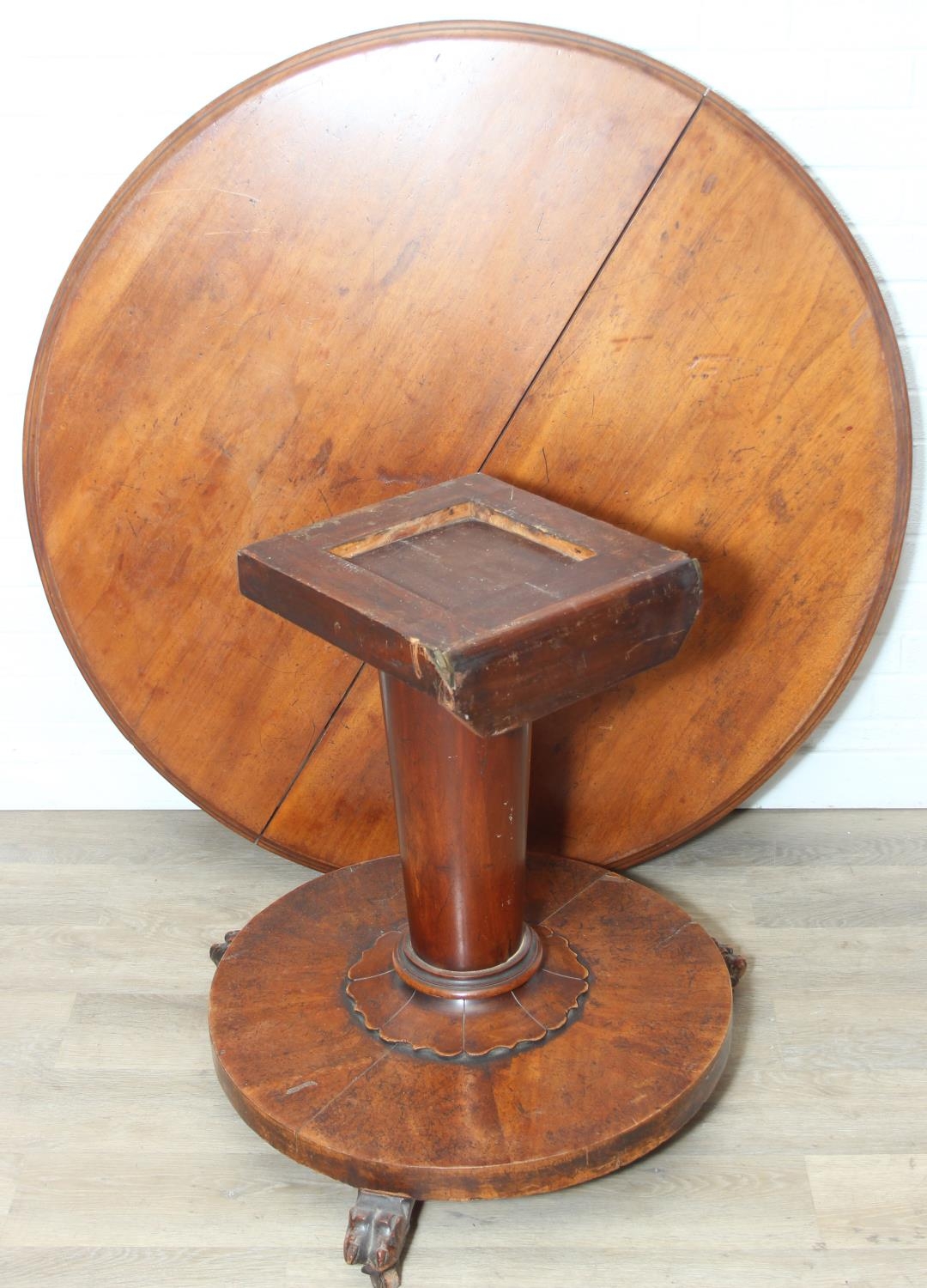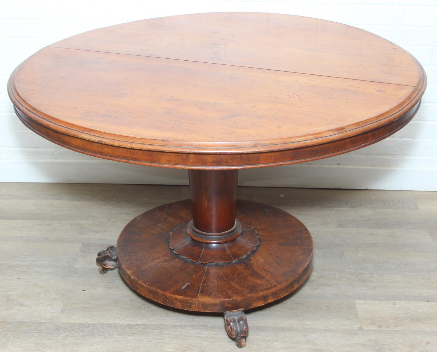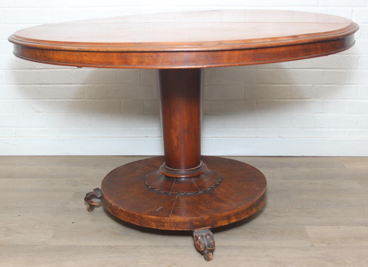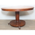 A Victorian tilt top breakfast table with decorative pillar and platform case, 116cm in diameter x 74cm tall