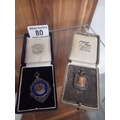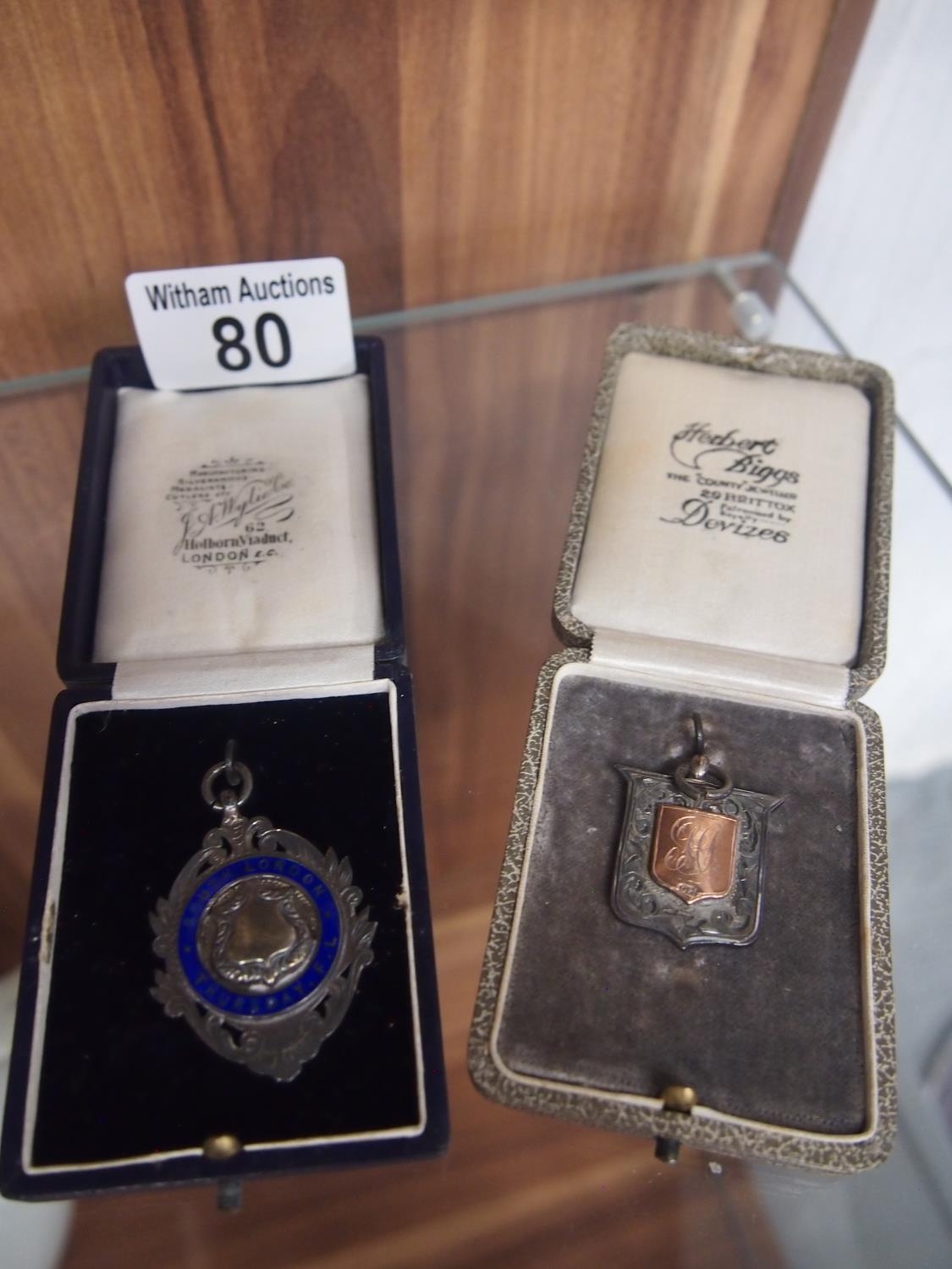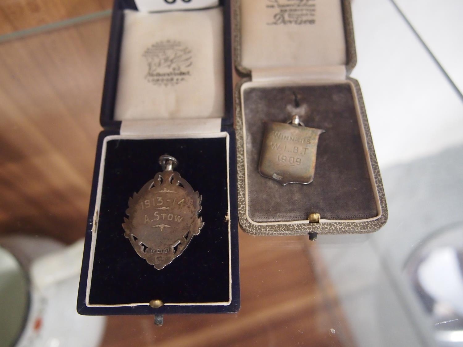 Antique silver and 9ct gold shield fob engraved Winners WLBT 1909 to reverse and Antique silver enamelled fob South London Thursday F.L 1913-14 A Stow hallmarked Birmingham 1913