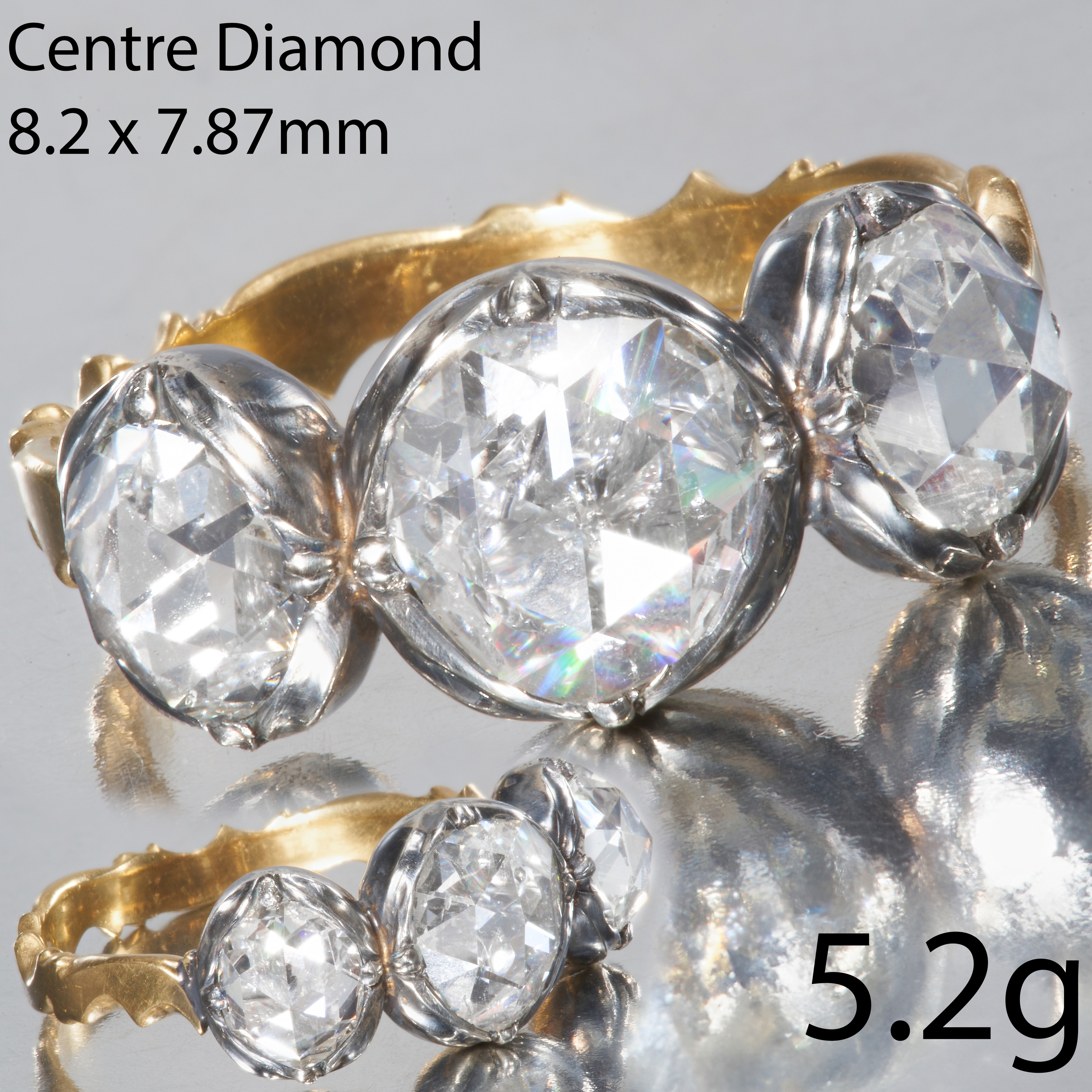 RARE AND LARGE ANTIQUE 3-STONE ROSE CUT DIAMOND RING,