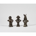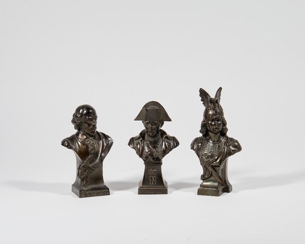 Three Continental patinated spelter busts, 20th century, to include Shakespeare, Napoleon, and Vercingetorix, the tallest 18cm high (3)