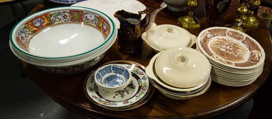 LUSTRE JUG, 2 BOWLS, TUREEN + SHIPPING PLATES