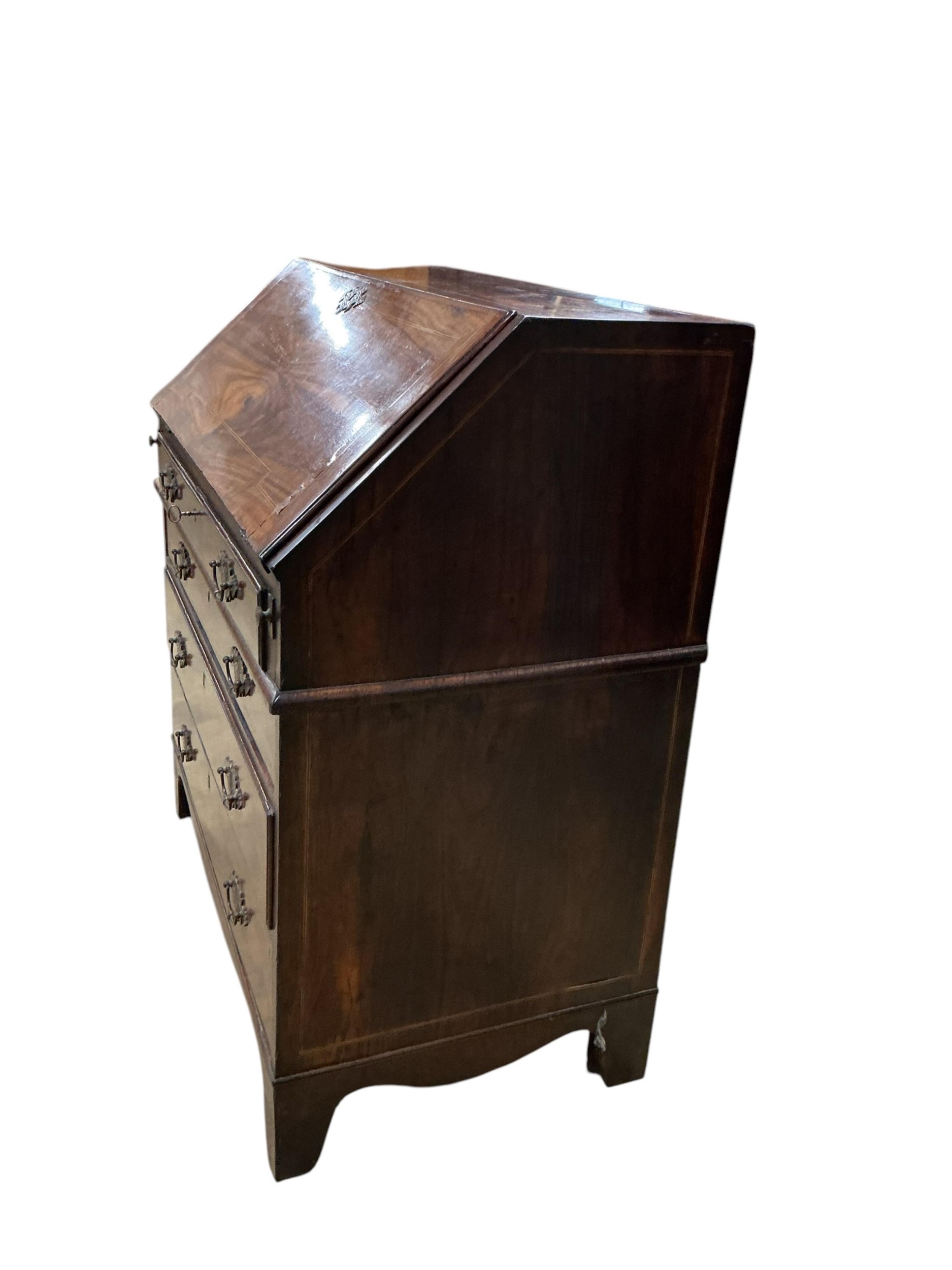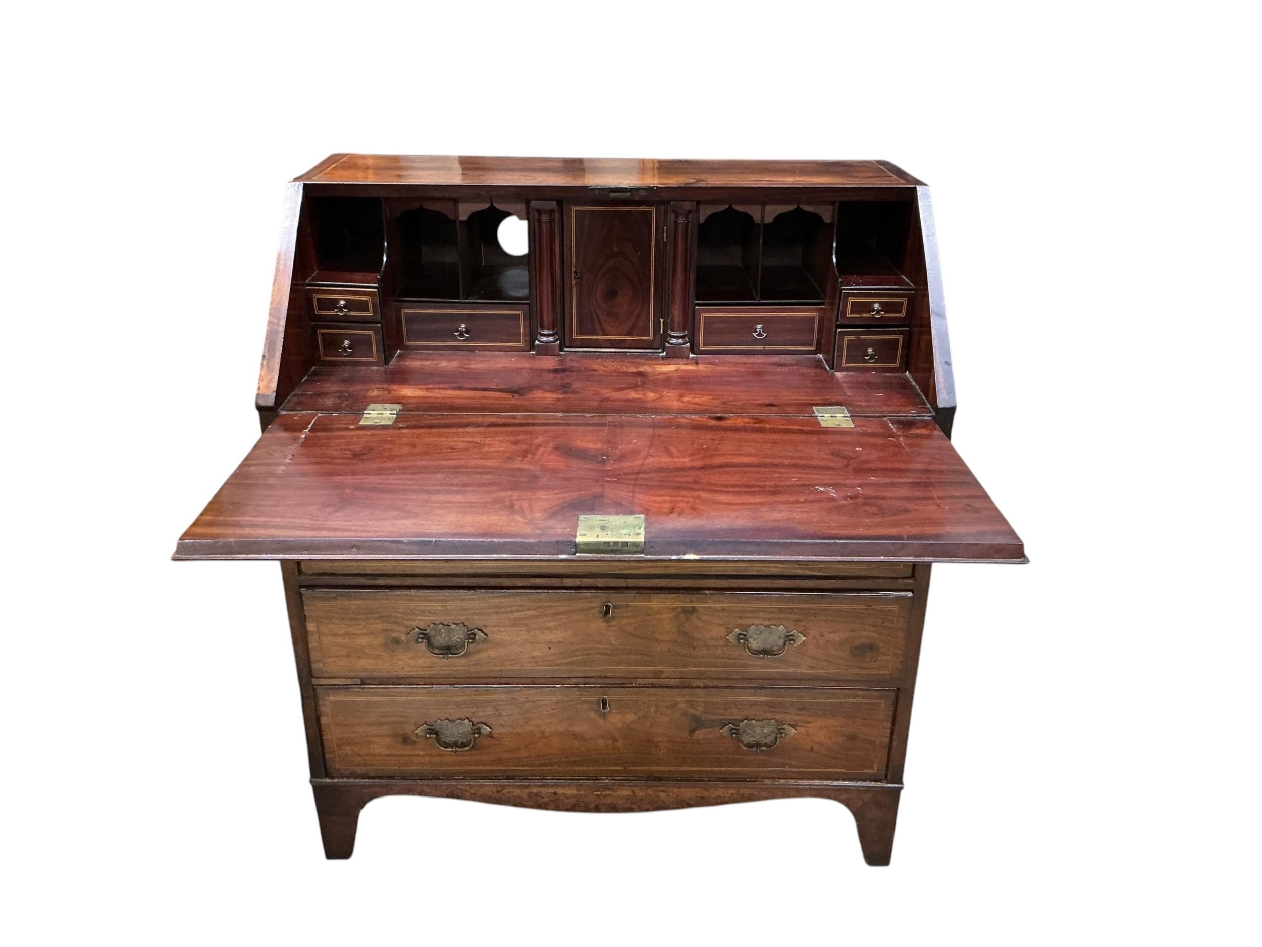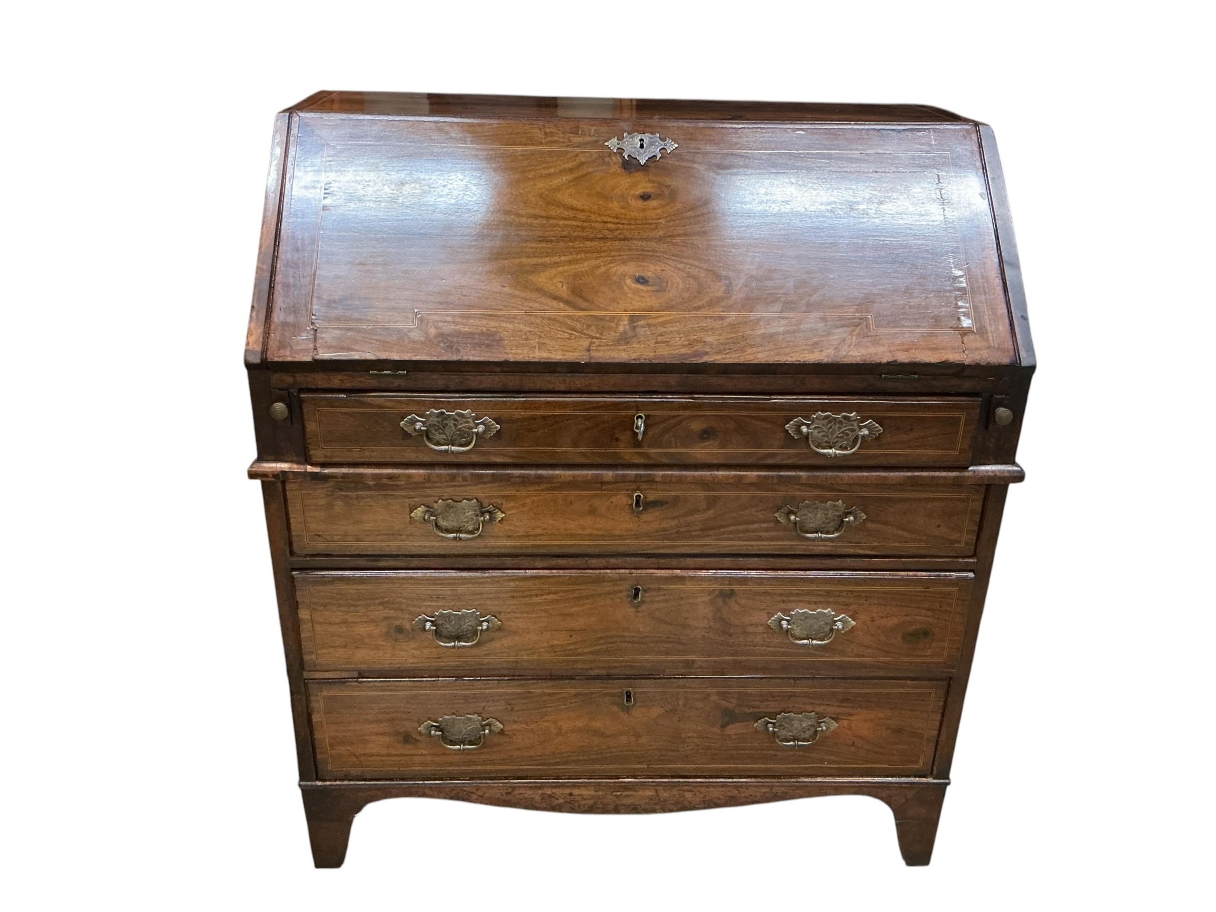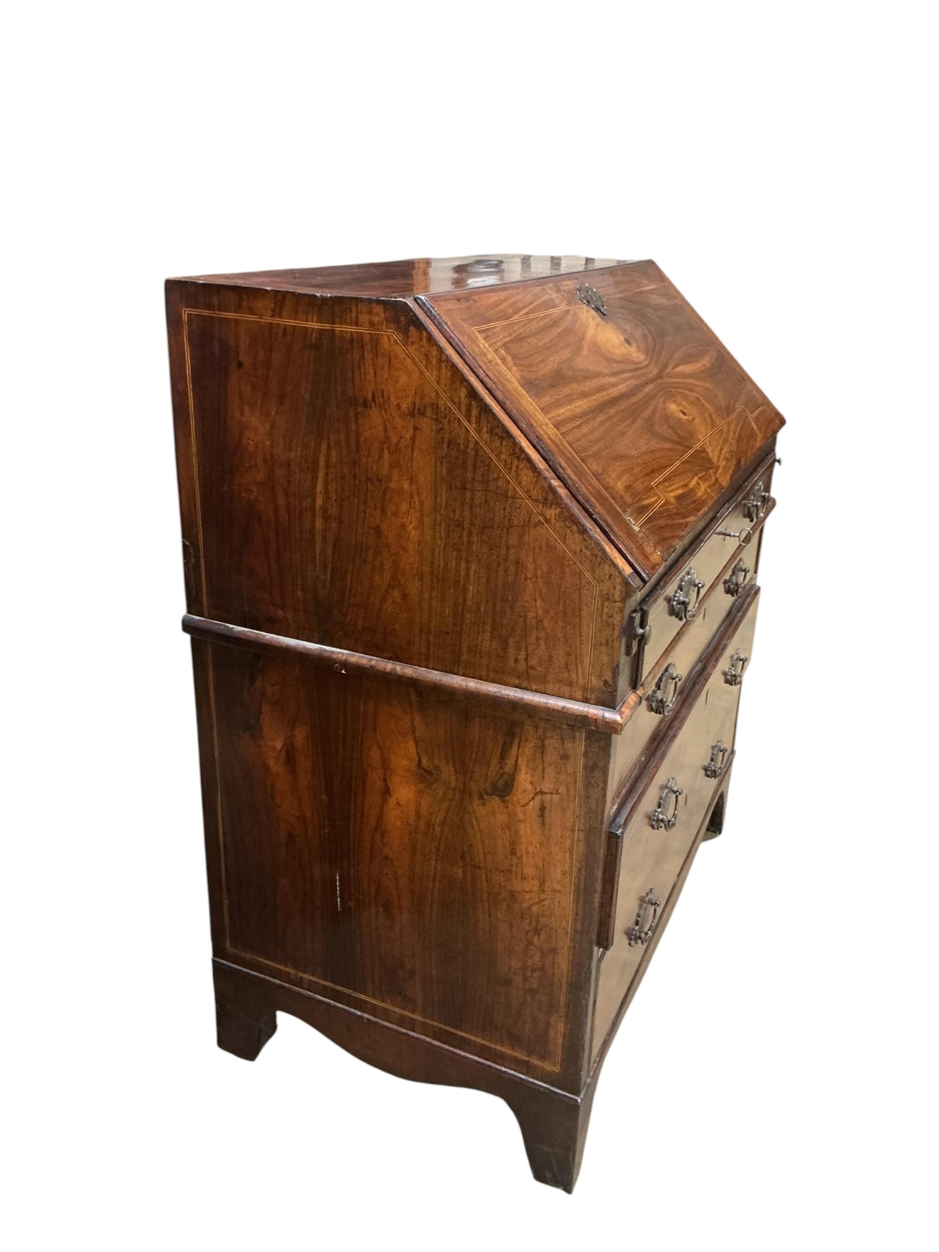 An 18th century inlaid walnut bureau, width 92cm, depth 53cm, height 103cm