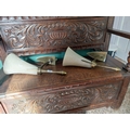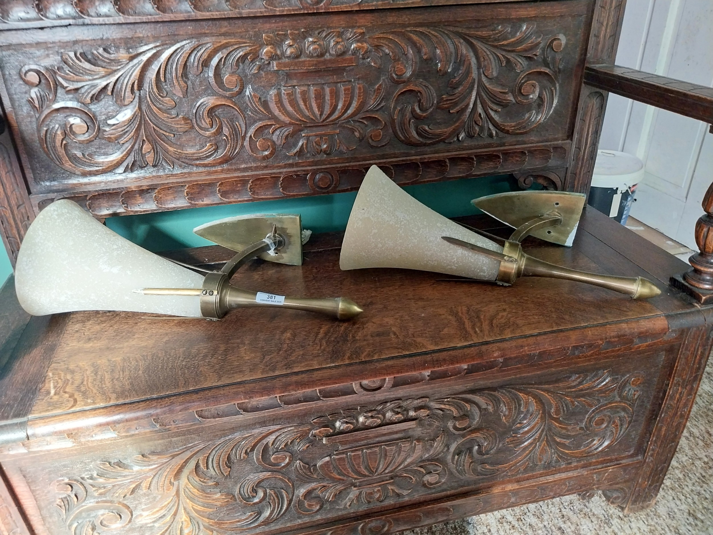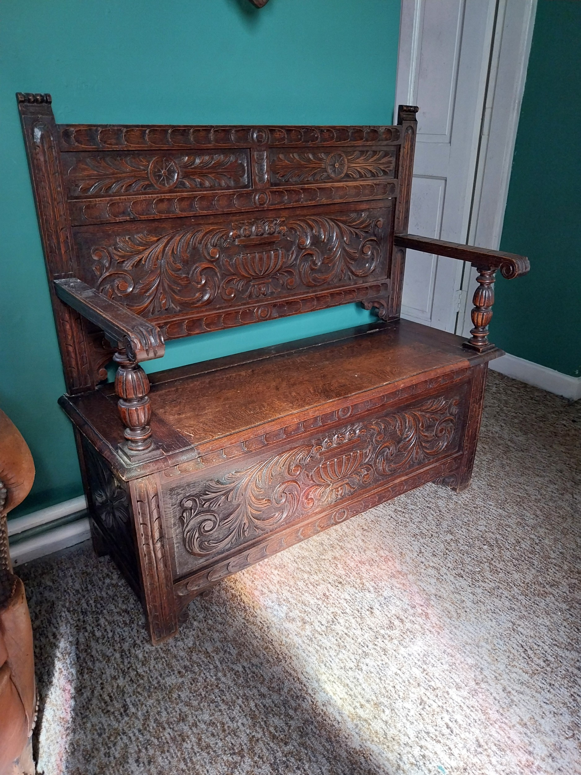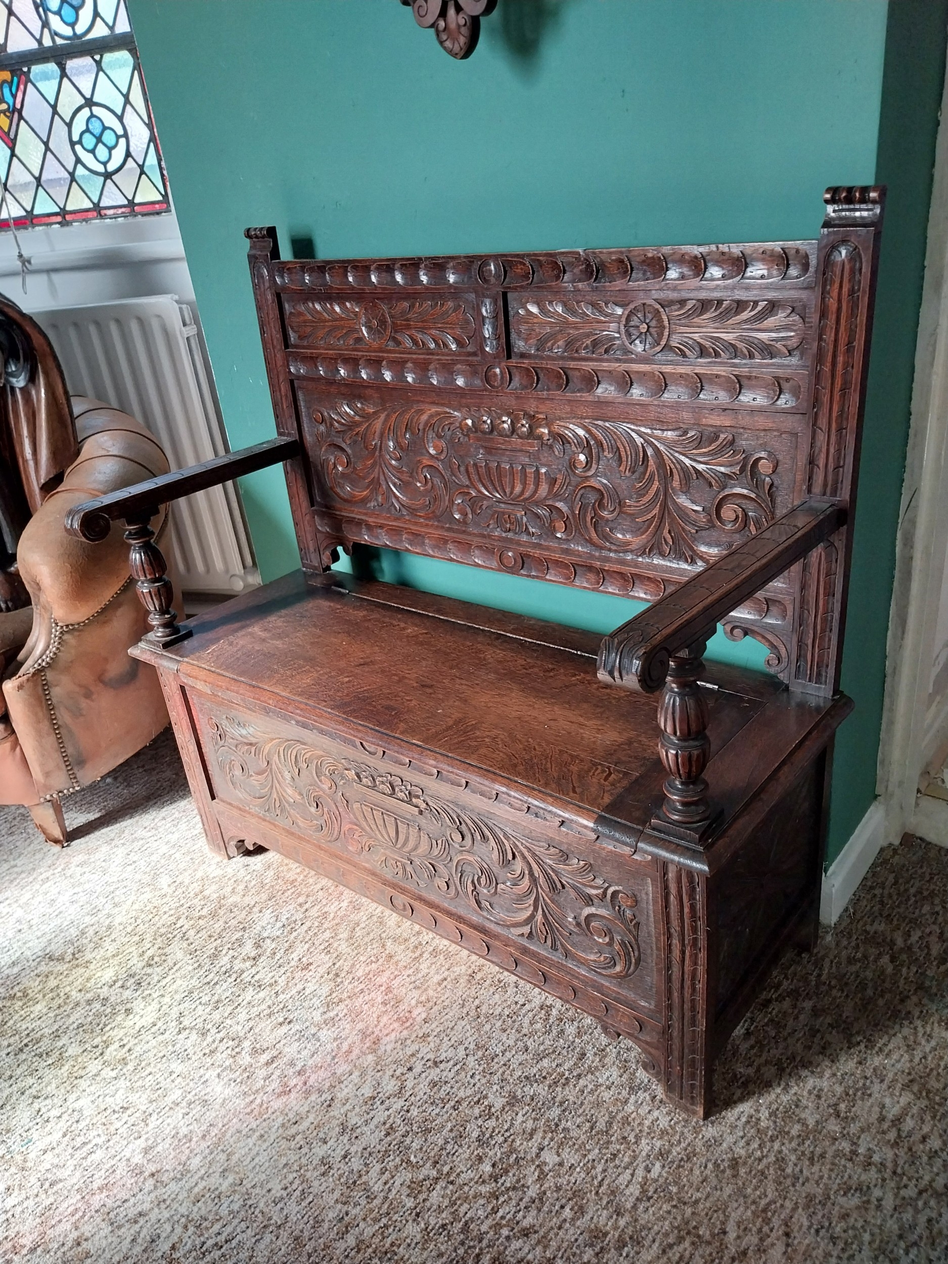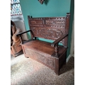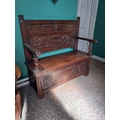 Edwardian carved oak monk's bench with lift up seat. { 107cm H X 110cm W X 48cm D }.
