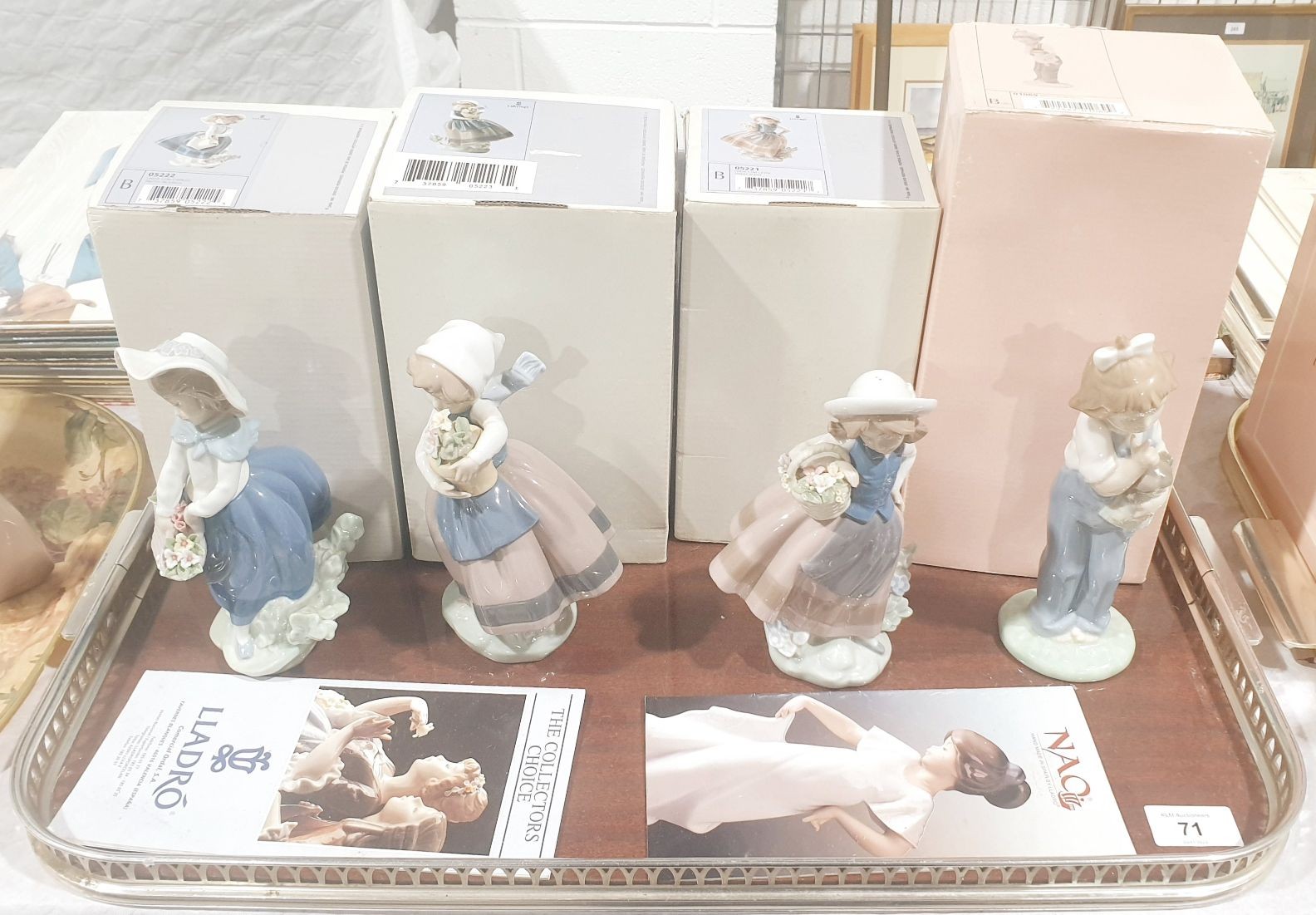 Four boxed Lladro and Nao figures, the tallest 7.5". No shipping. Arrange collection or your own packer and shipper, please.