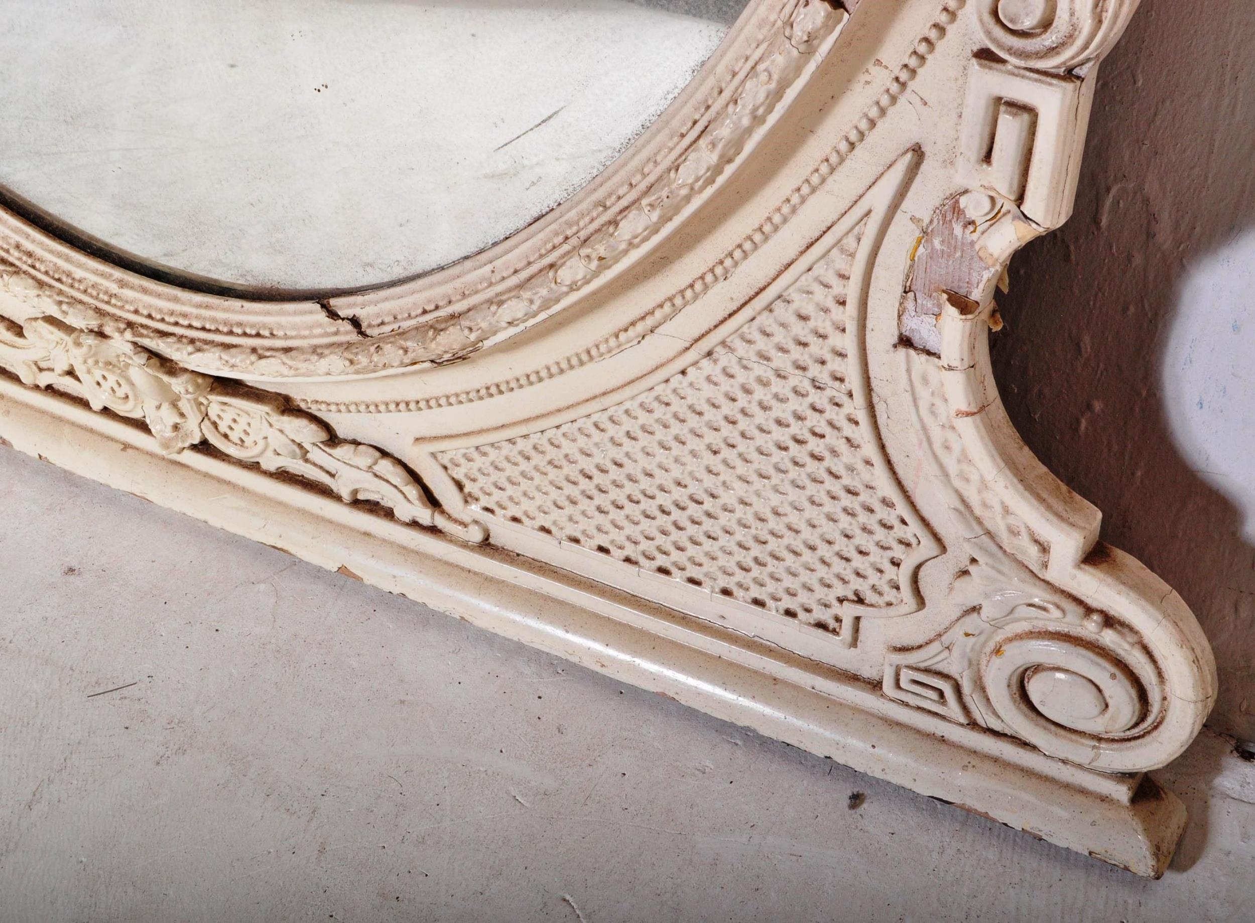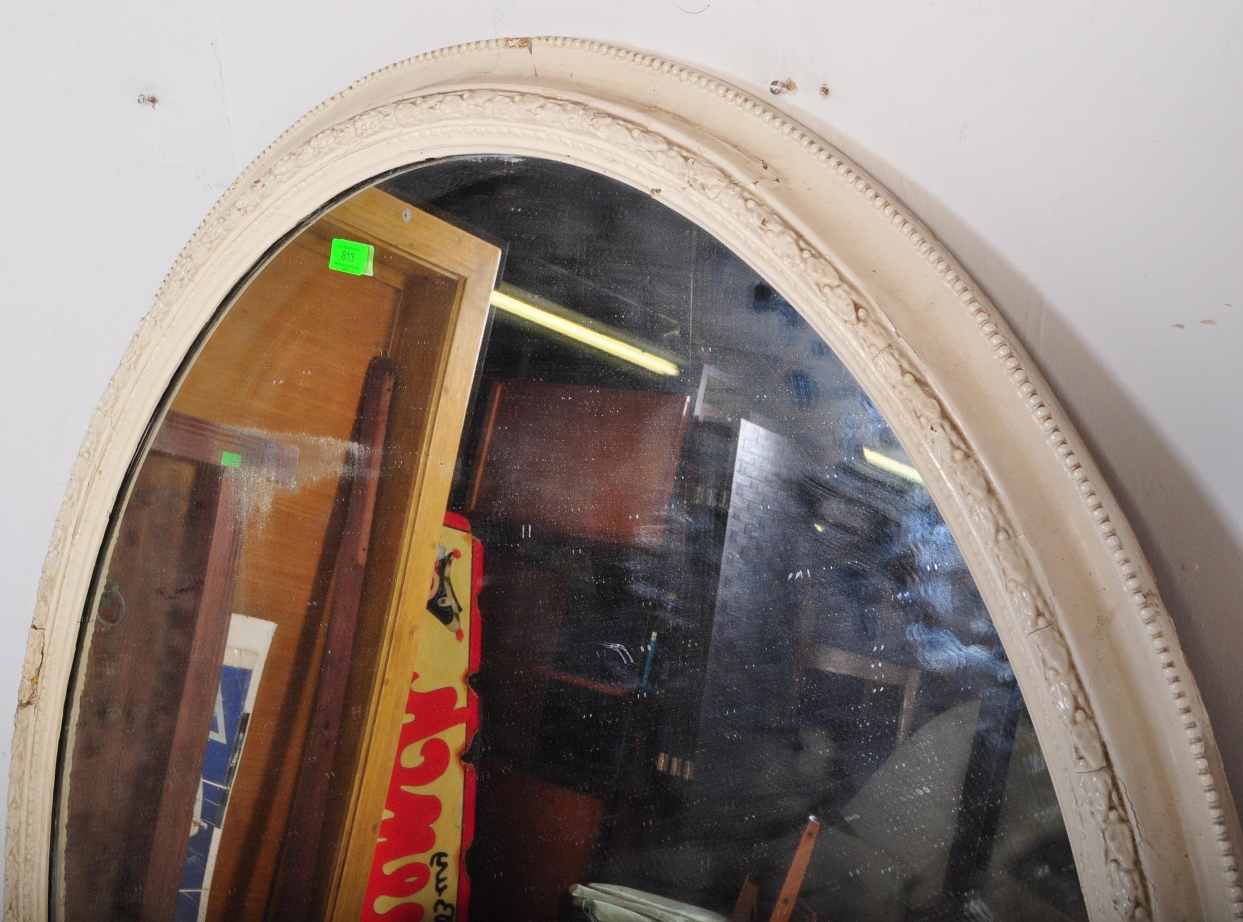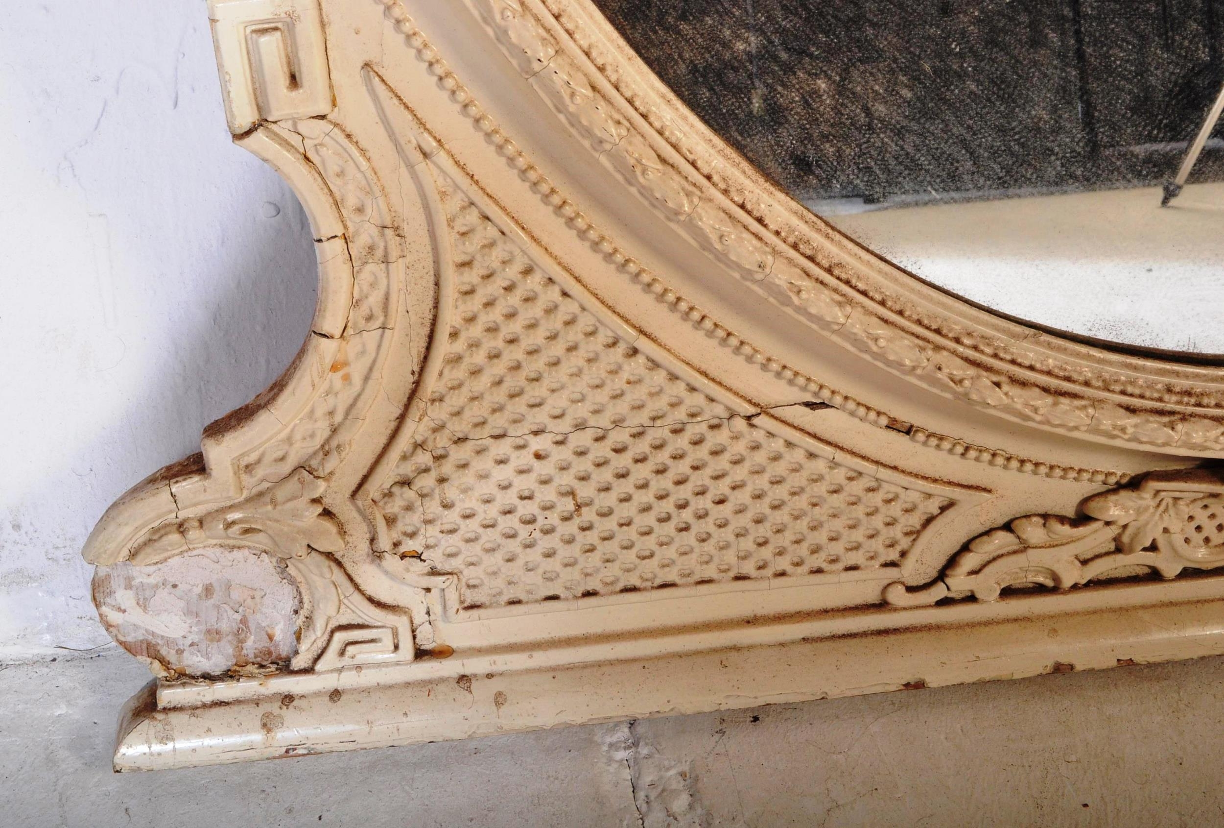 A 19th Century Victorian over mantel wall mirror of oval form having a large glass mirror panel set within a relief moulded white painted gesso frame. Raised on plinth base support. Measures approx; 146cm x 126cm.