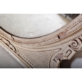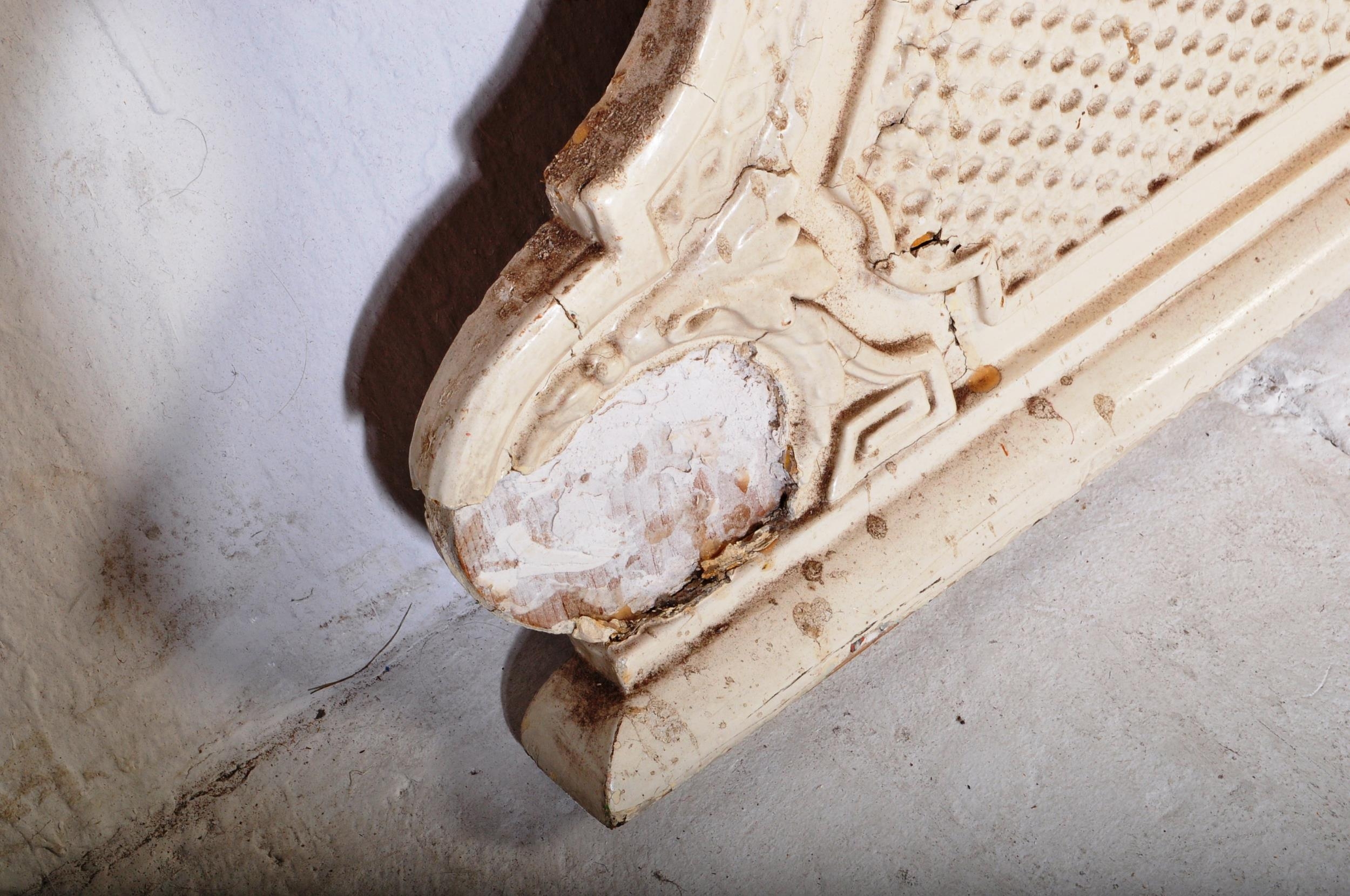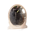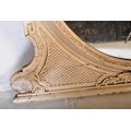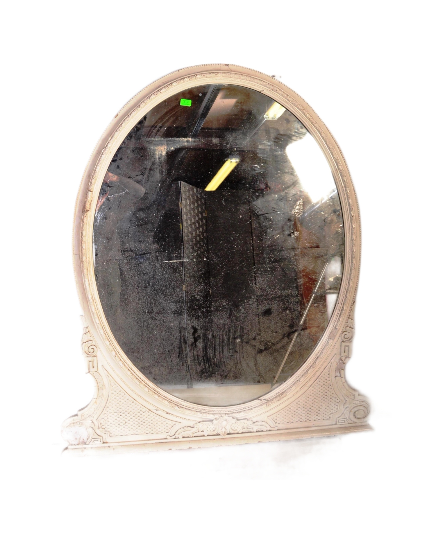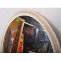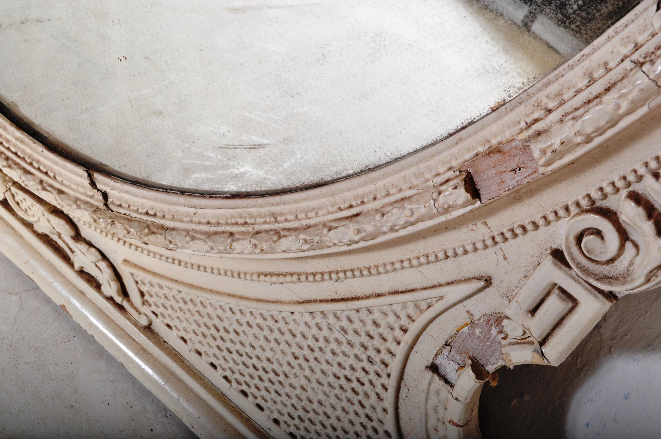 A 19th Century Victorian over mantel wall mirror of oval form having a large glass mirror panel set within a relief moulded white painted gesso frame. Raised on plinth base support. Measures approx; 146cm x 126cm.