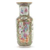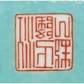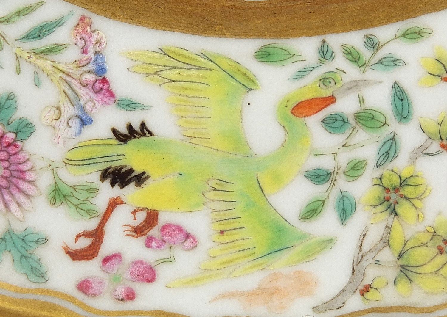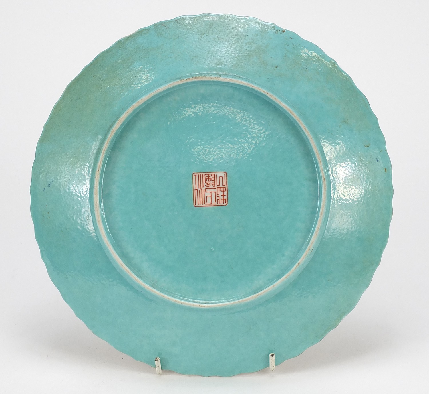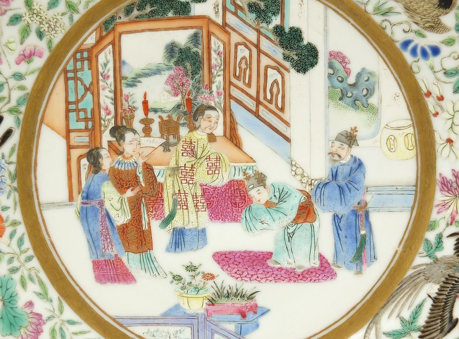 Chinese porcelain plate finely hand painted in the famille rose palette with figures in a palace within a border of birds amongst flowers, six figure iron red character marks to the reverse, 23.5cm in diameter