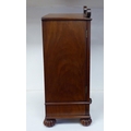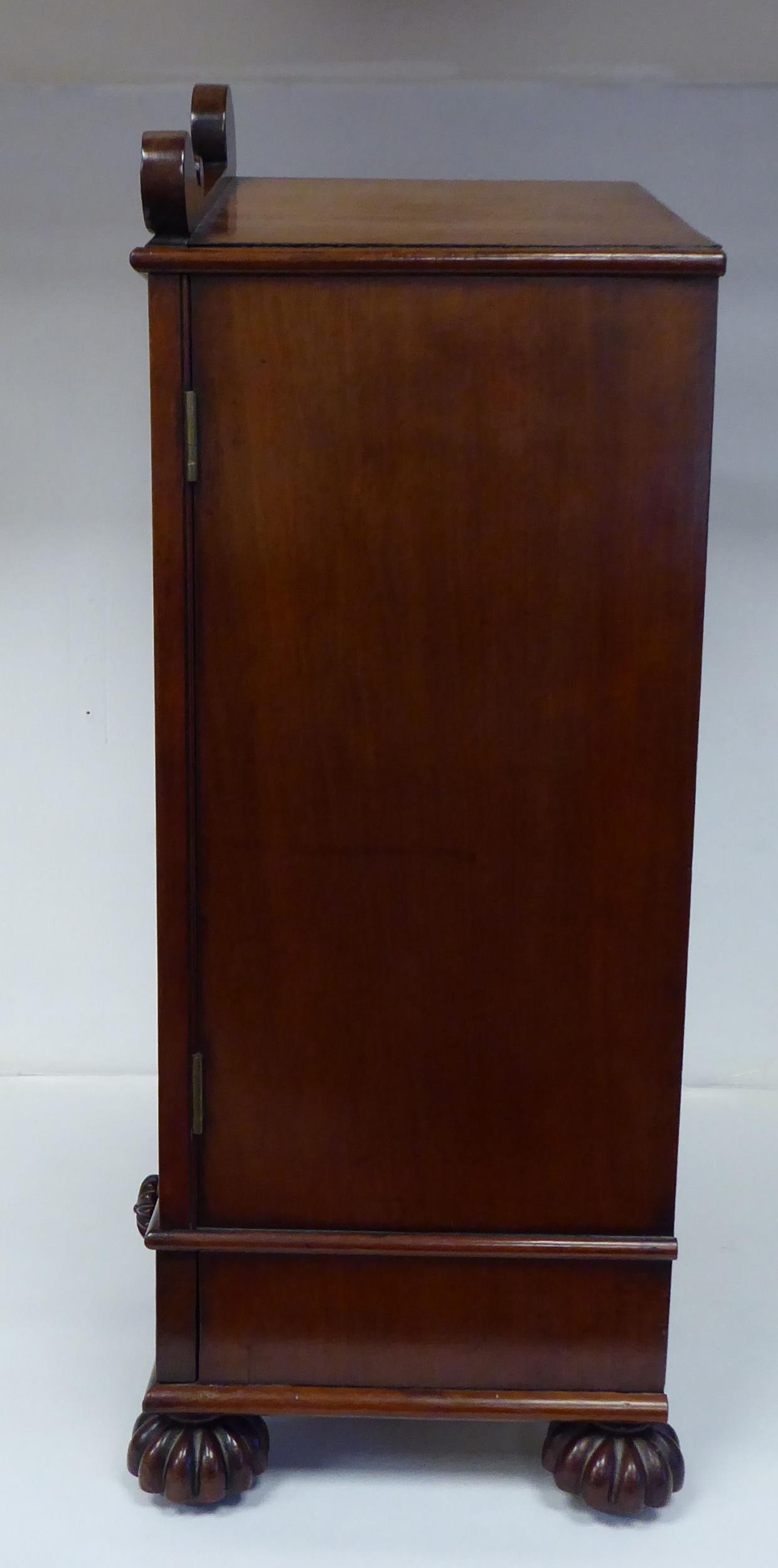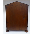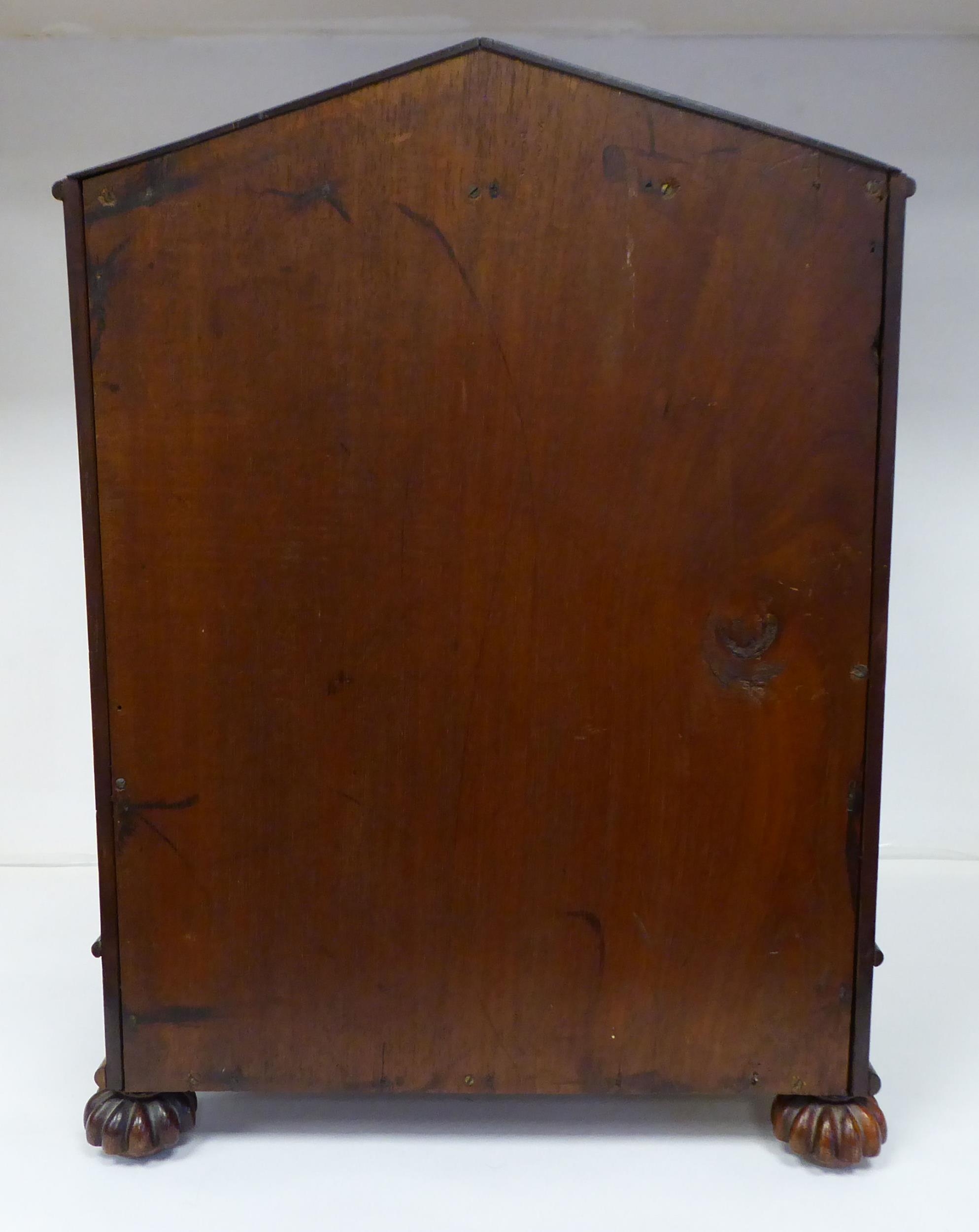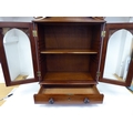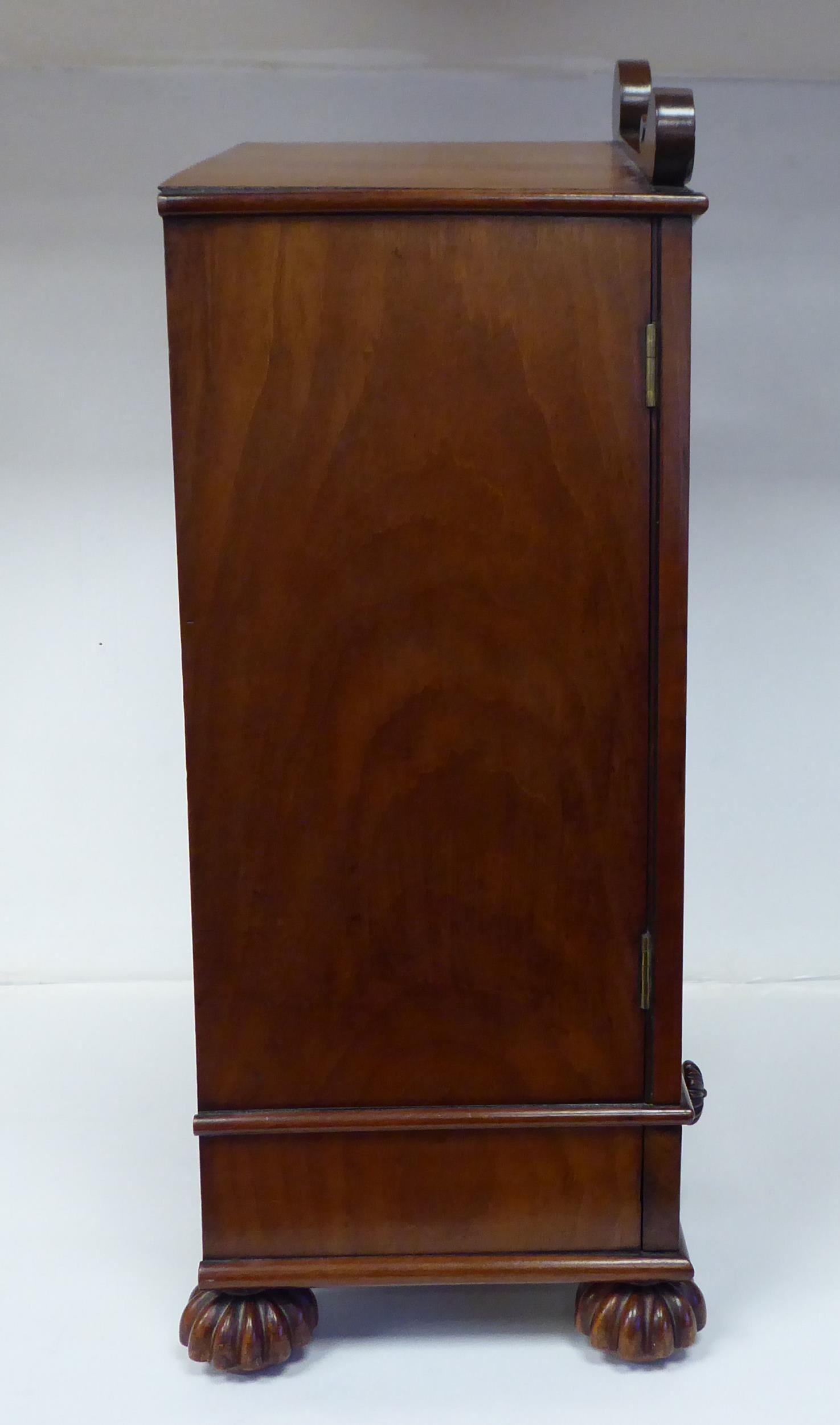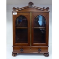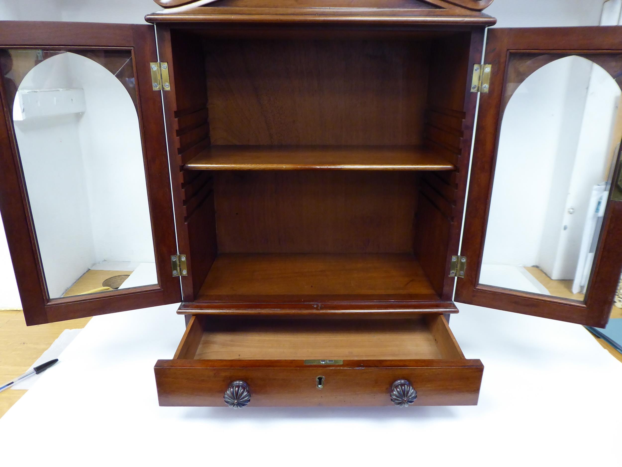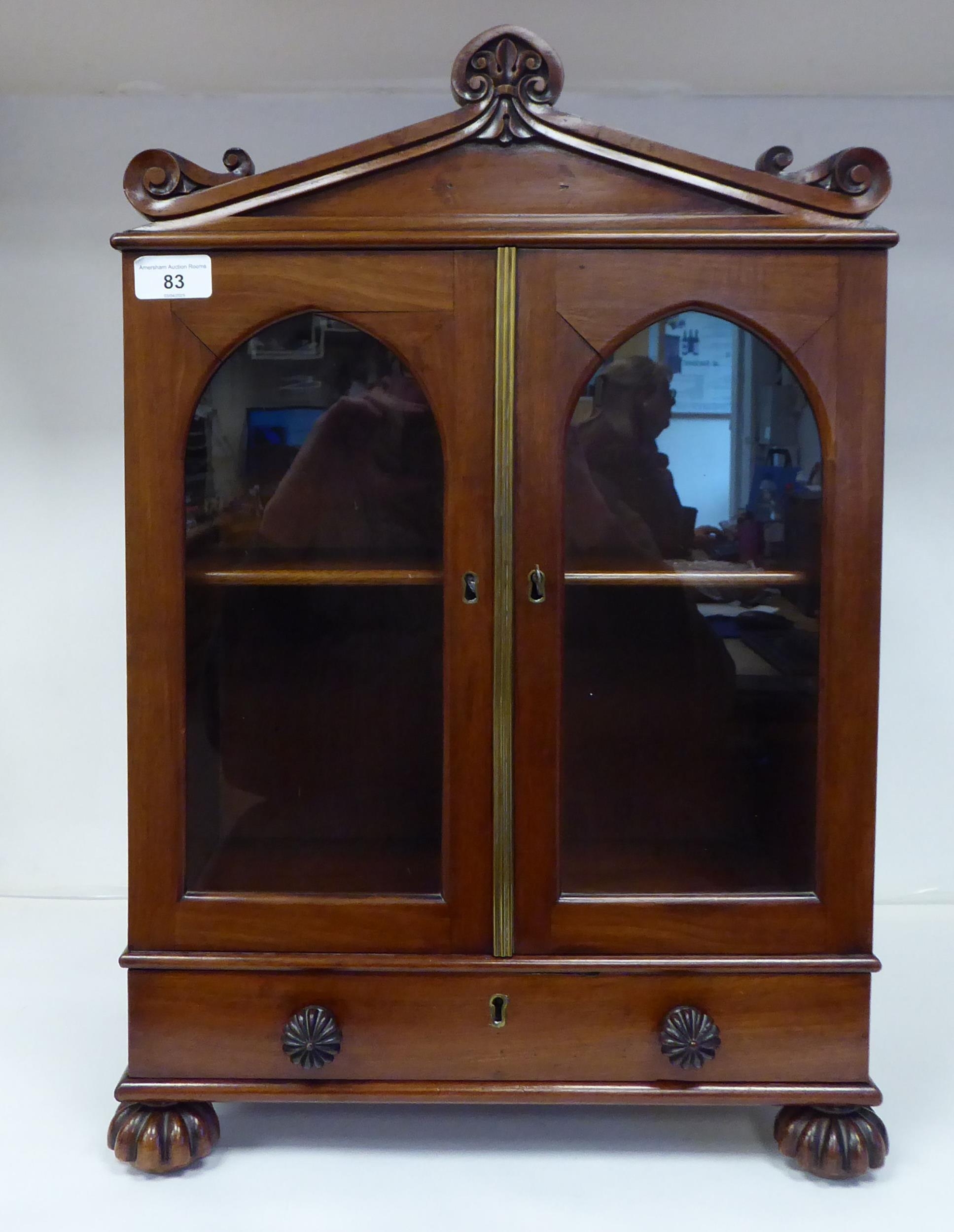 A William IV mahogany, lockable table cabinet, the pointed arched top with carved ornament, over a pair of three-quarter height, glazed panelled doors with a brass leading edge, over a shallow base drawer and carved bun feet 23"h 15"w