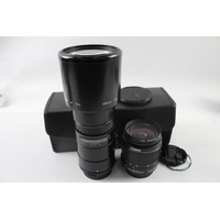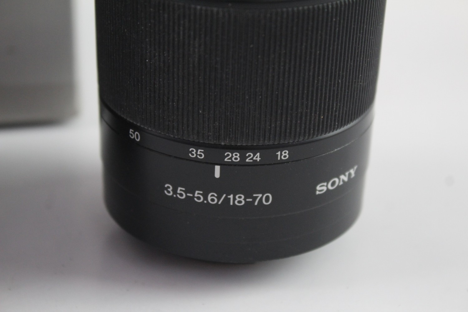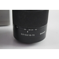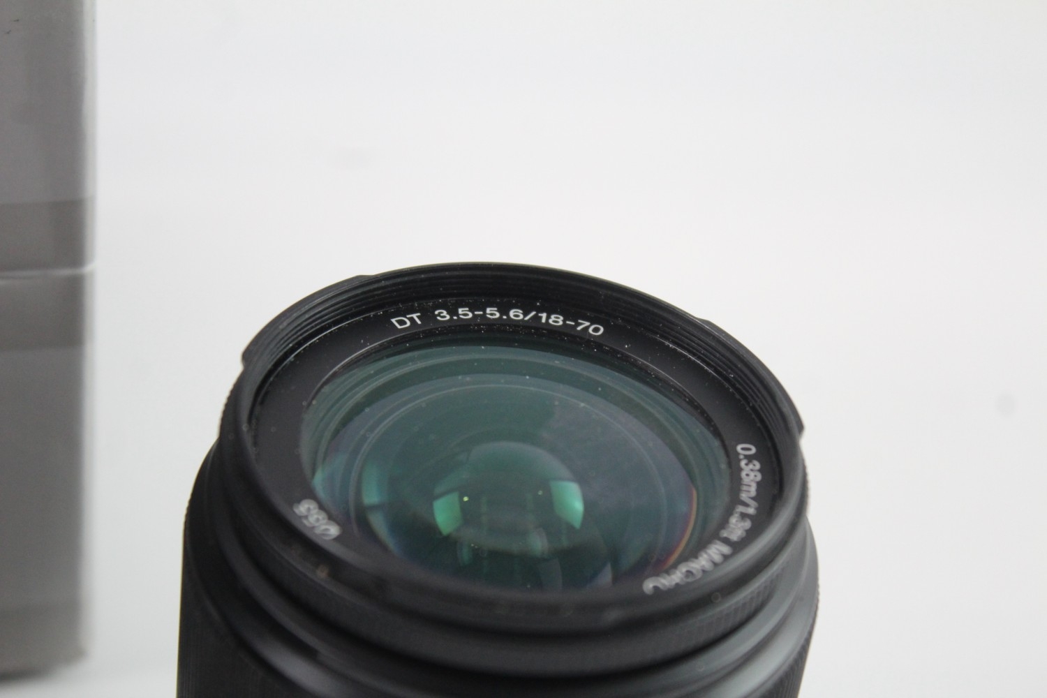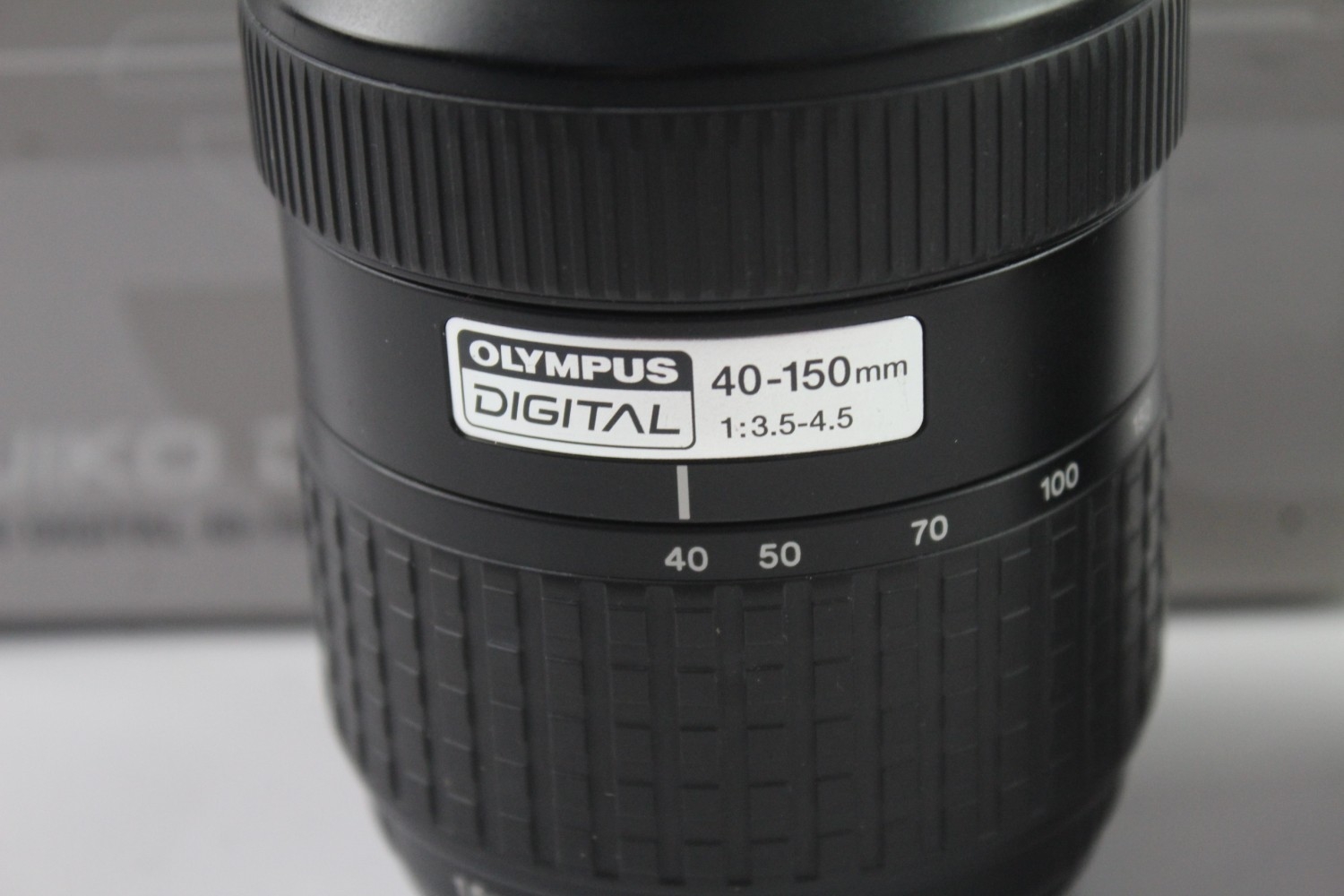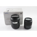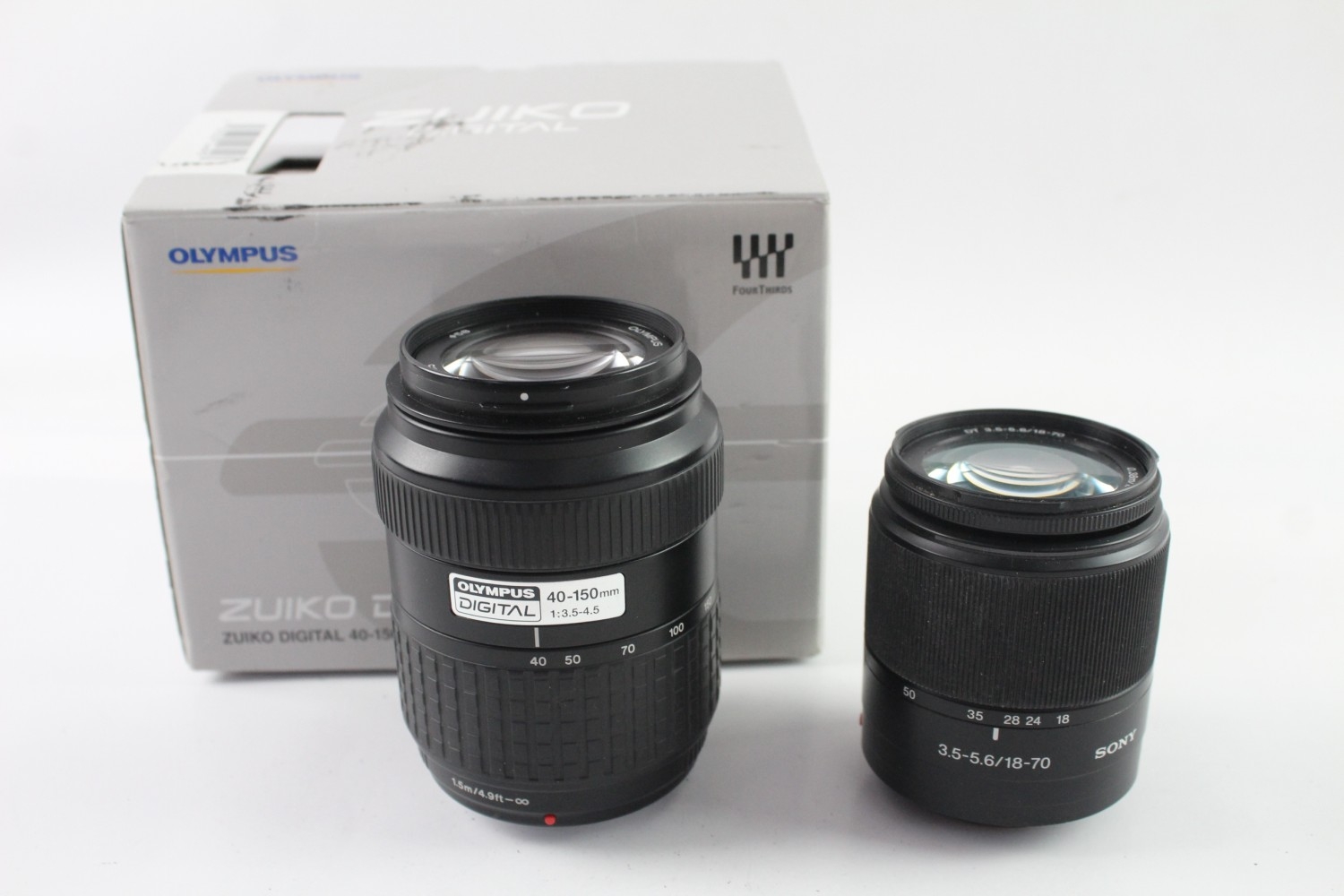 Two autofocus camera lenses, one boxed Olympus Zuiko Digital 1:3.5-4.5 40-150mm with shade and one Sony DT 1:3.5-5.6 18-70mm