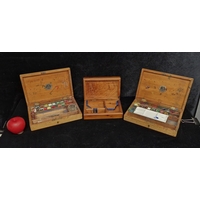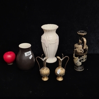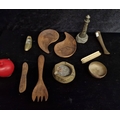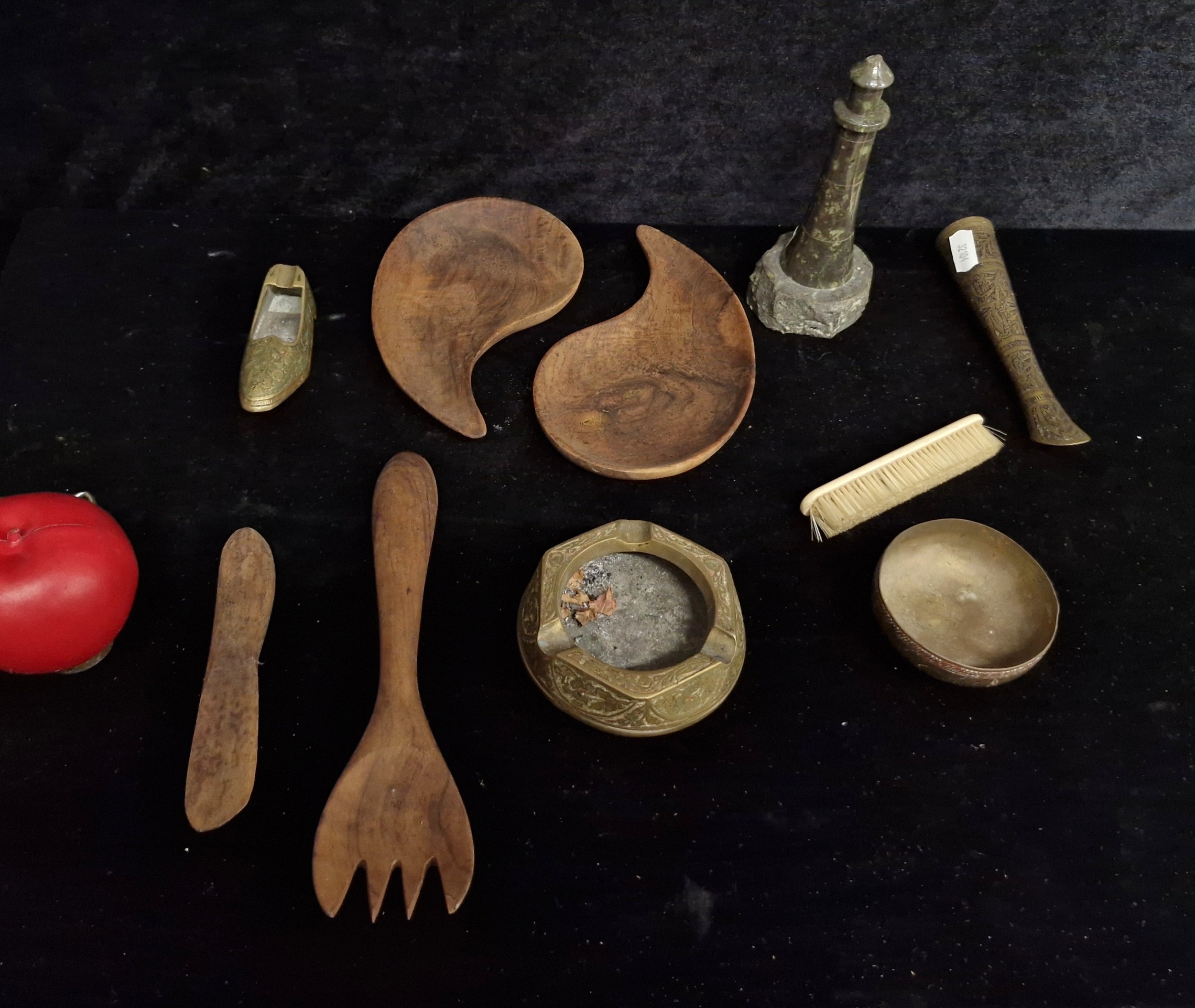 A nice mixed array of miniature items including a bone handled brush, two brass ashtray's including one in the form of a shoe and a marble figure of a lighthouse.