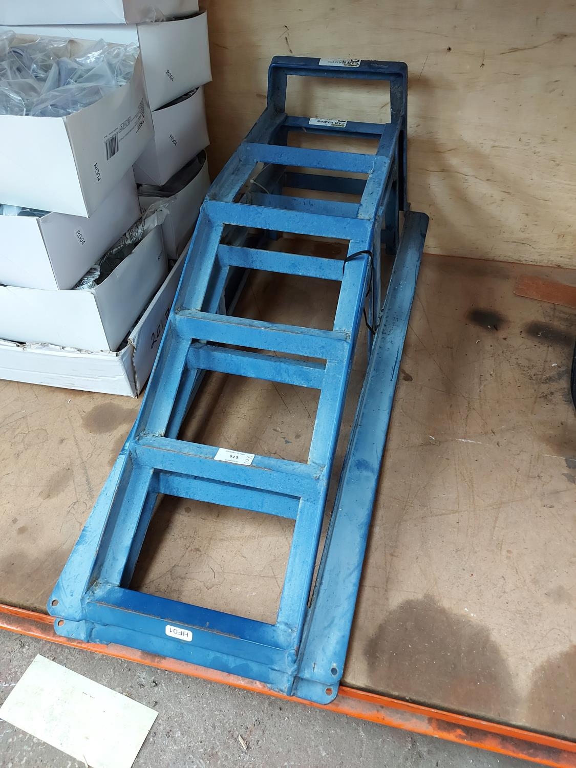 A pair of blue metal car work ramps