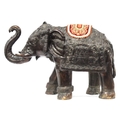 A Large Bronzed Model of an Elephant, in a standing pose, trunk aloft, with an elaborate saddle cloth across the animal's back, 53cm high, 76cm long.