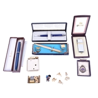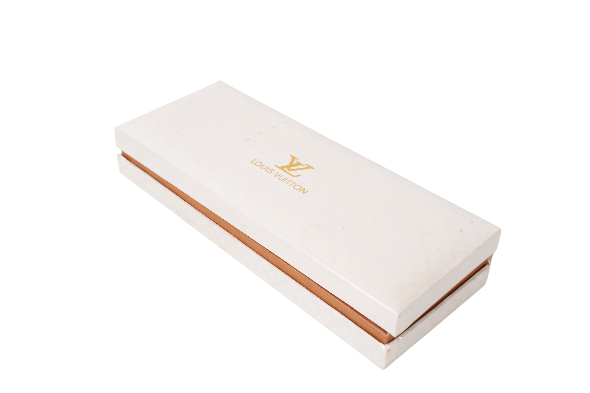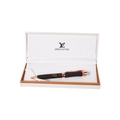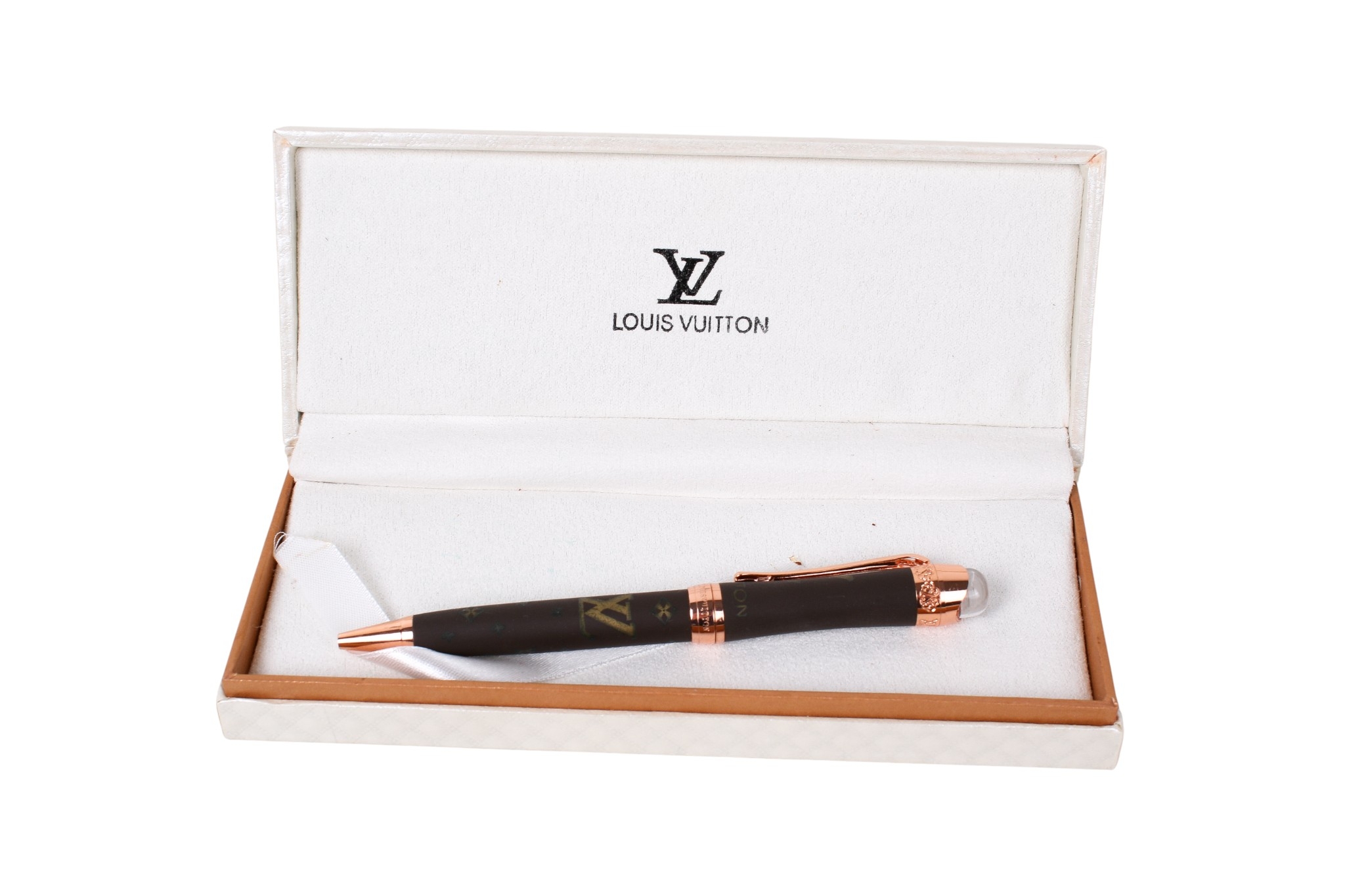A Louis Vuitton style ballpoint pen. Decorated with the trademark monogram with rose coloured metal hardware, boxed, with the outer case.