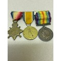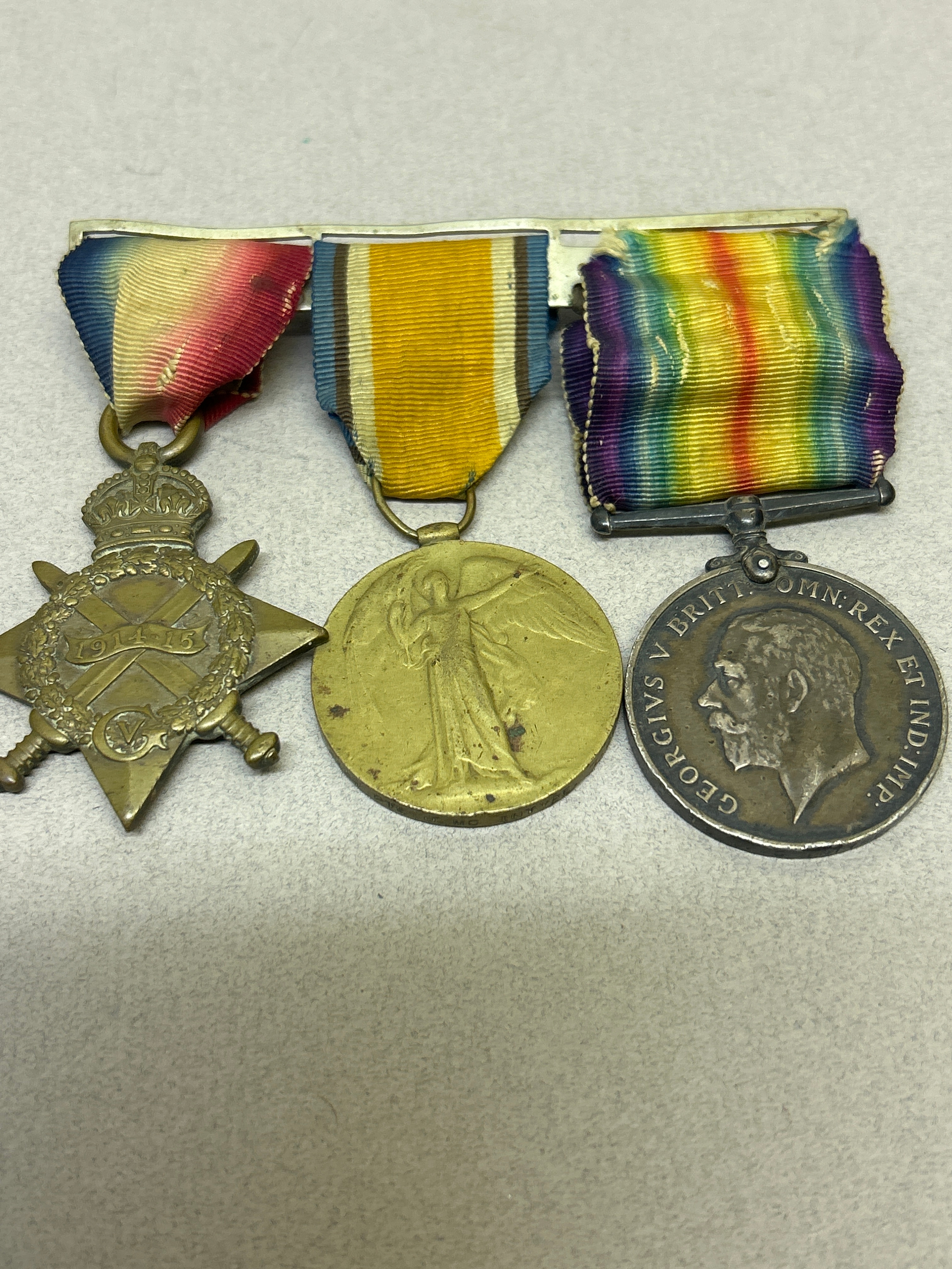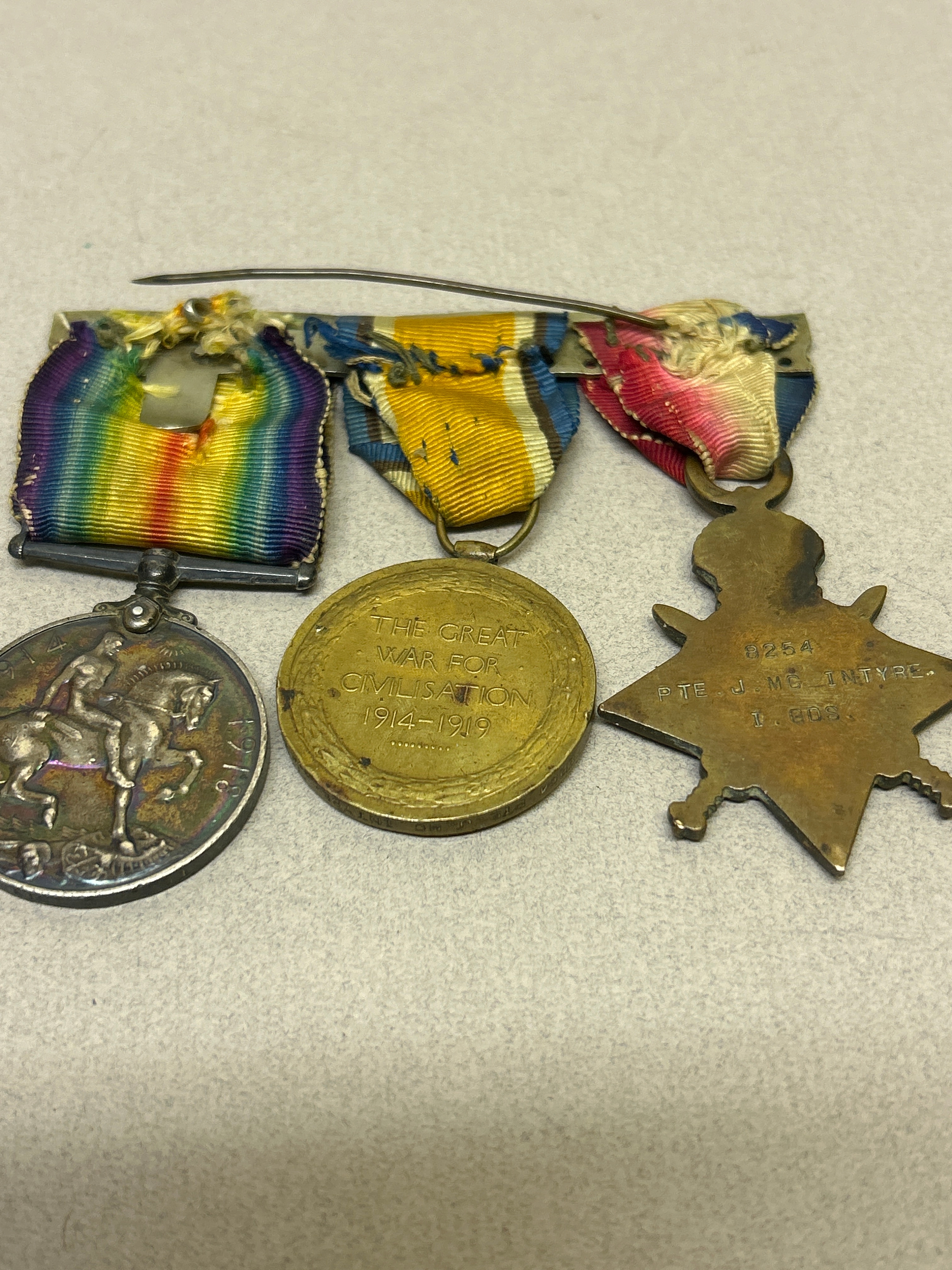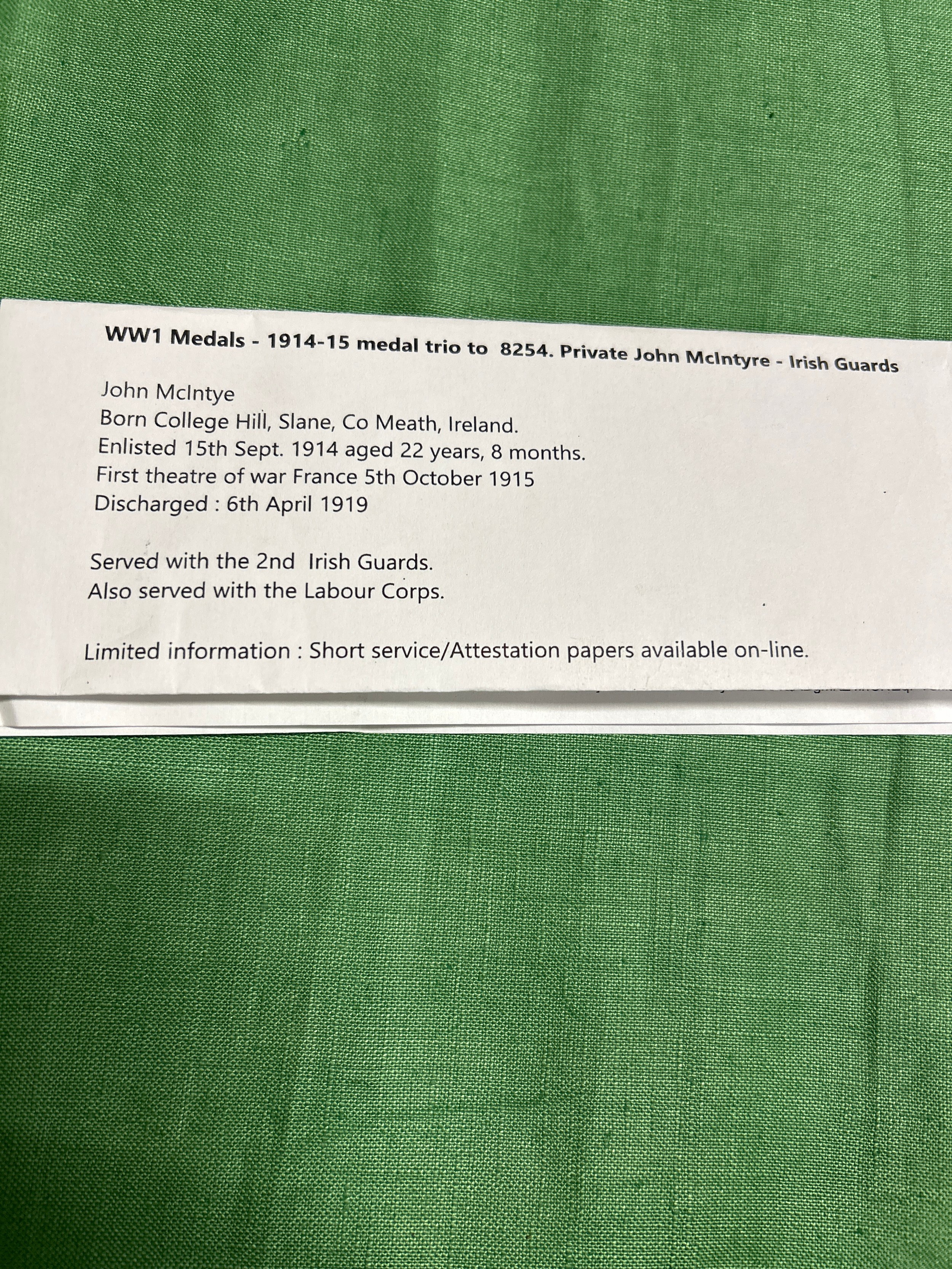 WW1 medal group of 3 including Mons Star 1914-15, War medal and Victory medal awarded to Pte J Mc Intyre I. GDS, 8254. He was born in Co Meath Ireland, enlisted 15 Sept 1914 aged 22, was in France in 1915 and was discharged 1919. He served with the 2nd Irish Guards & Labour Corps.