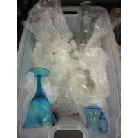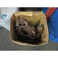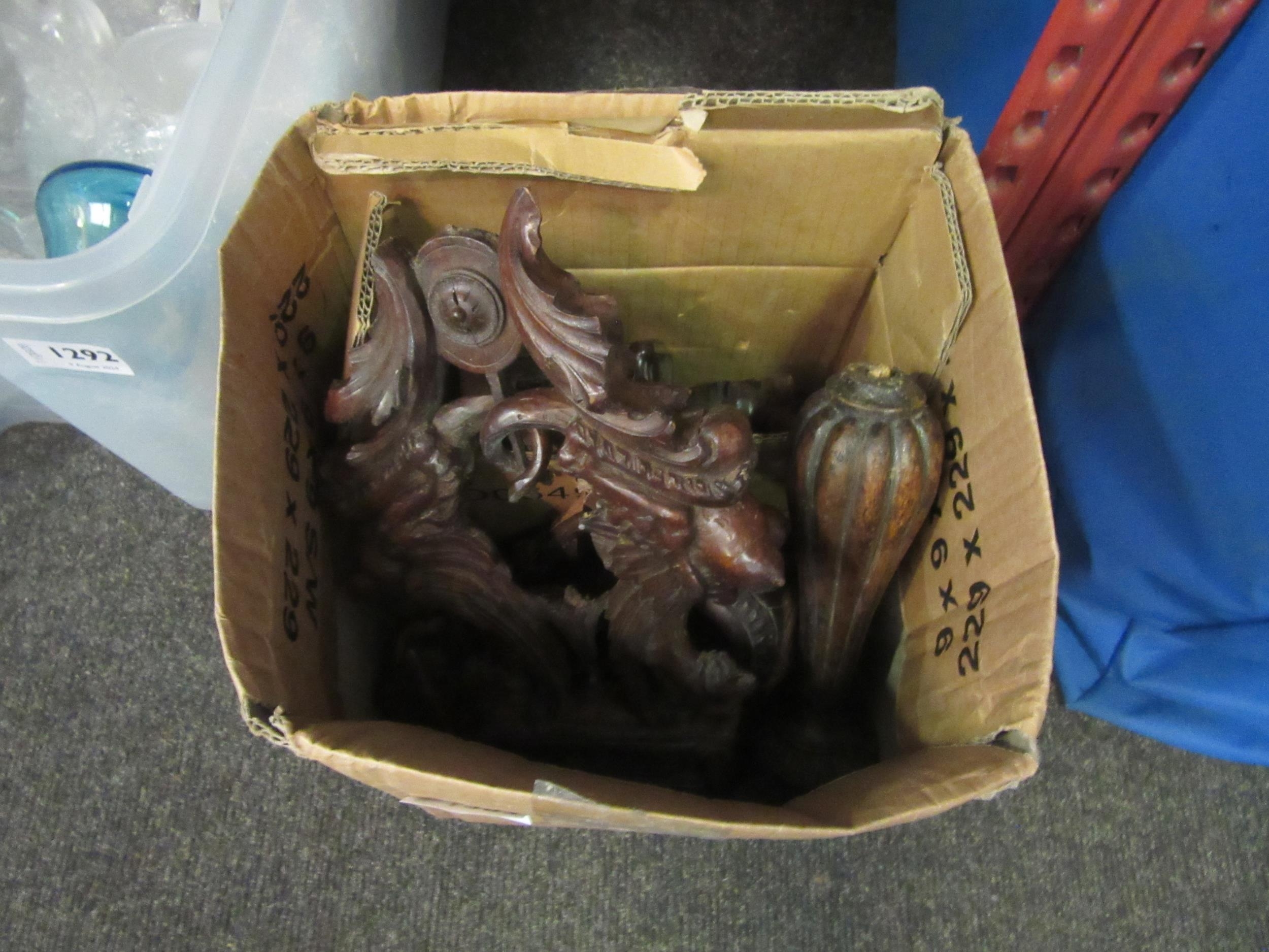A box of treen to include carved clock finials, carved lidded pot, pencil case