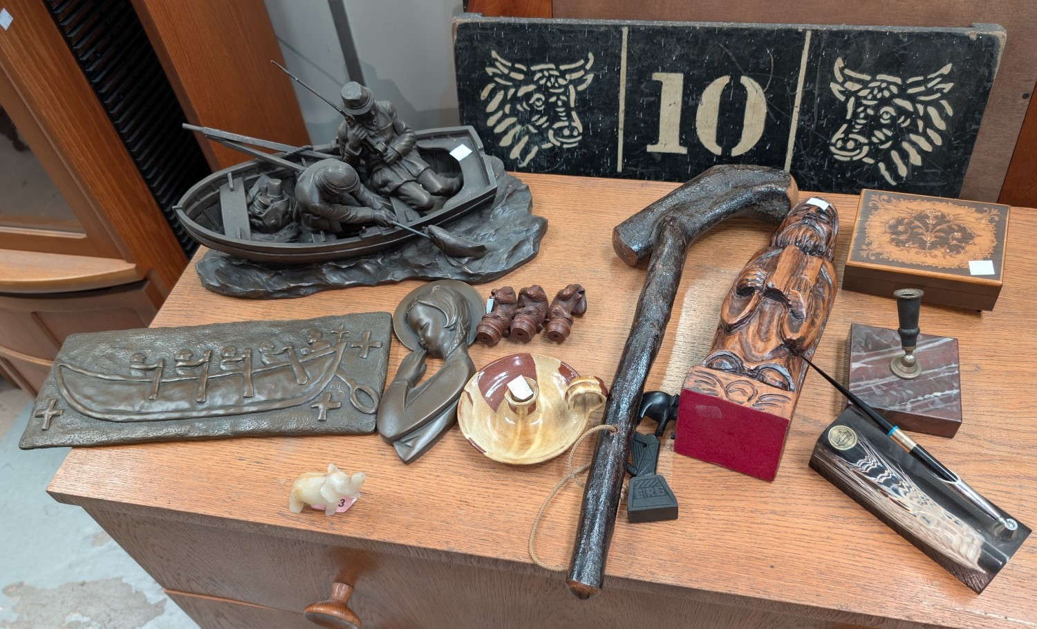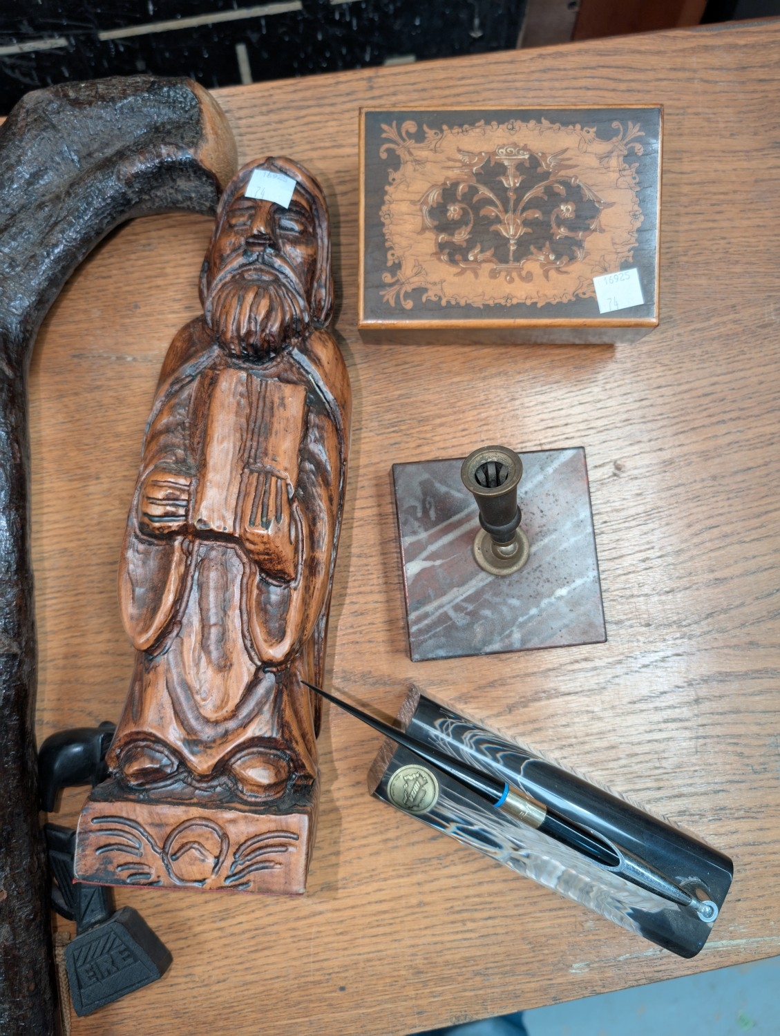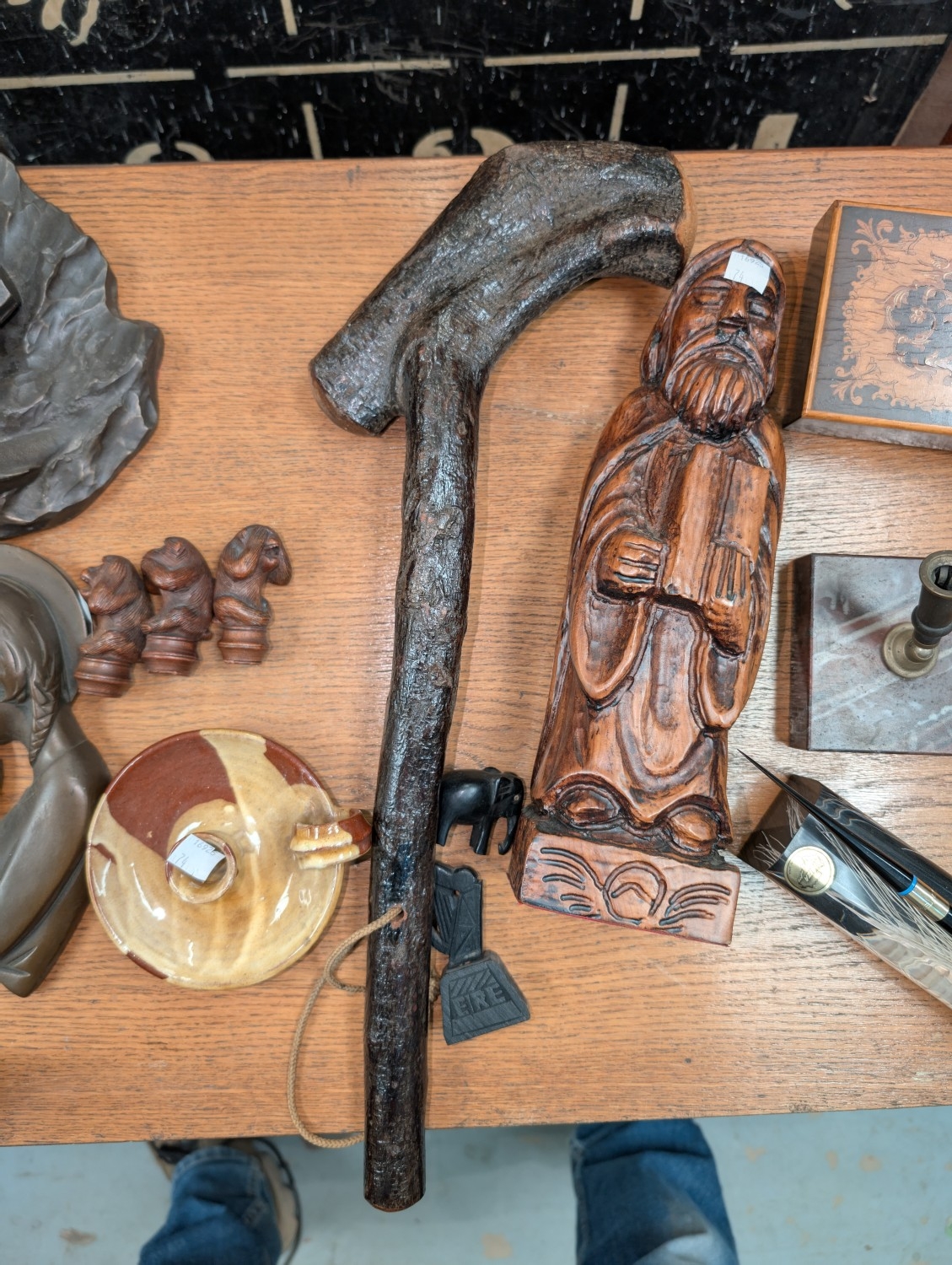 An Irish club, wooden figure and other small collectables.
