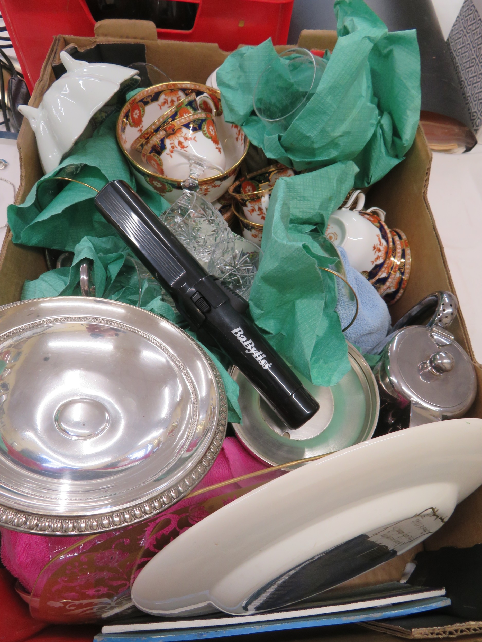 Box of teaset, glassware, metalware etc
