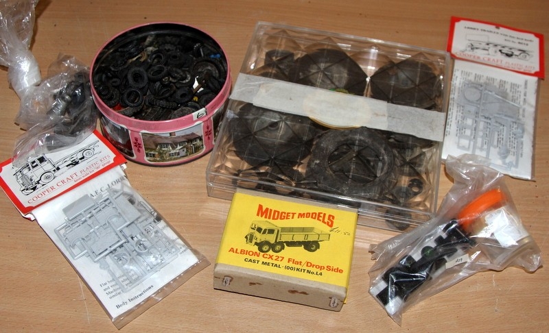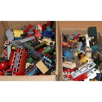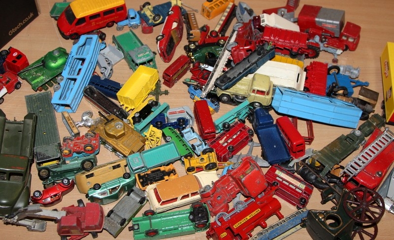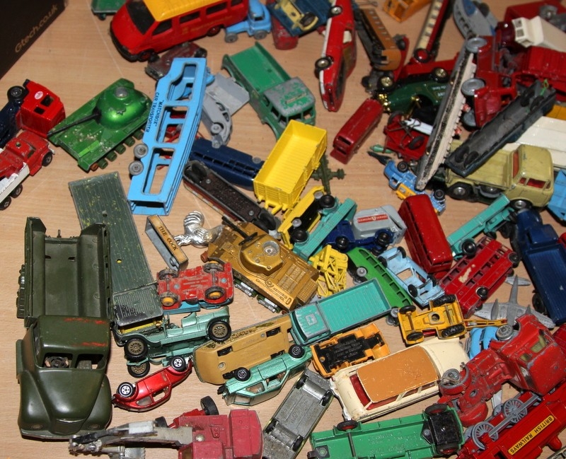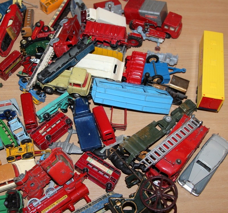 A large collection of playworn die-cast model vehicles, good to sort through, includes vintage and scarce models. Lot also includes a few model kits and spare tyres and wheels for restoration projects