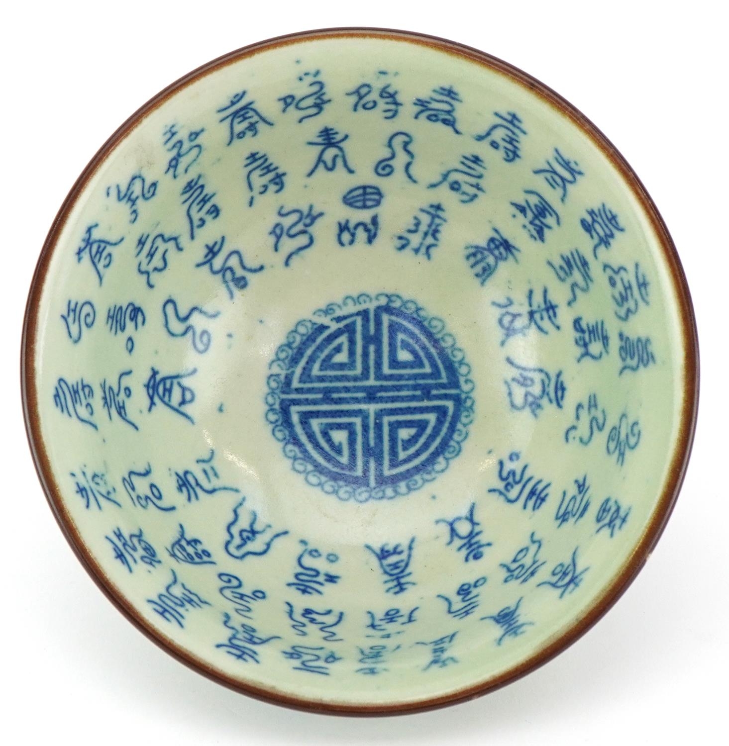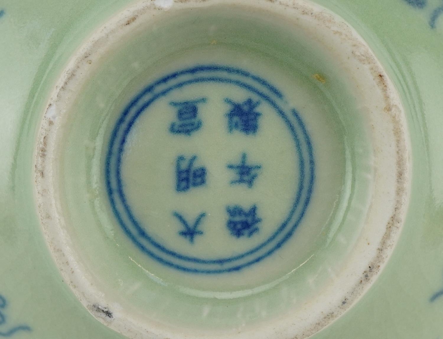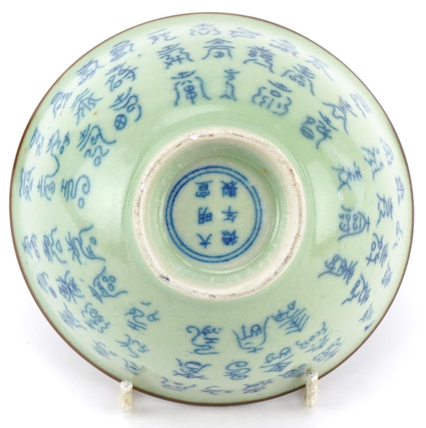 A Chinese celadon crackle glazed stoneware bowl, 20th century, bearing six character mark to base, 6cm high x 13cm in diameter.