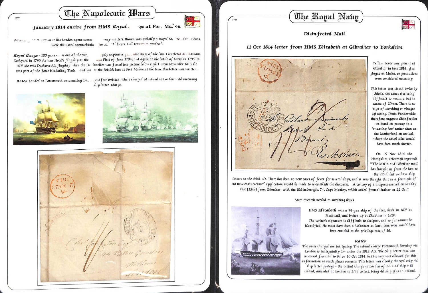 1814 Entire letters from Lt. I. Brown on H.M.S "Royal George" at Port Mahon, or from H.M.S "Elizabeth" at Gibraltar, both with oval "SHIP LETTER / (crown) / PORTSMOUTH", the Gibraltar letter unusually disinfected with two chisel slits, charged 1/4 to Yorkshire (1/- inland + 4d ship letter, a late use of the 4d rate). (2).