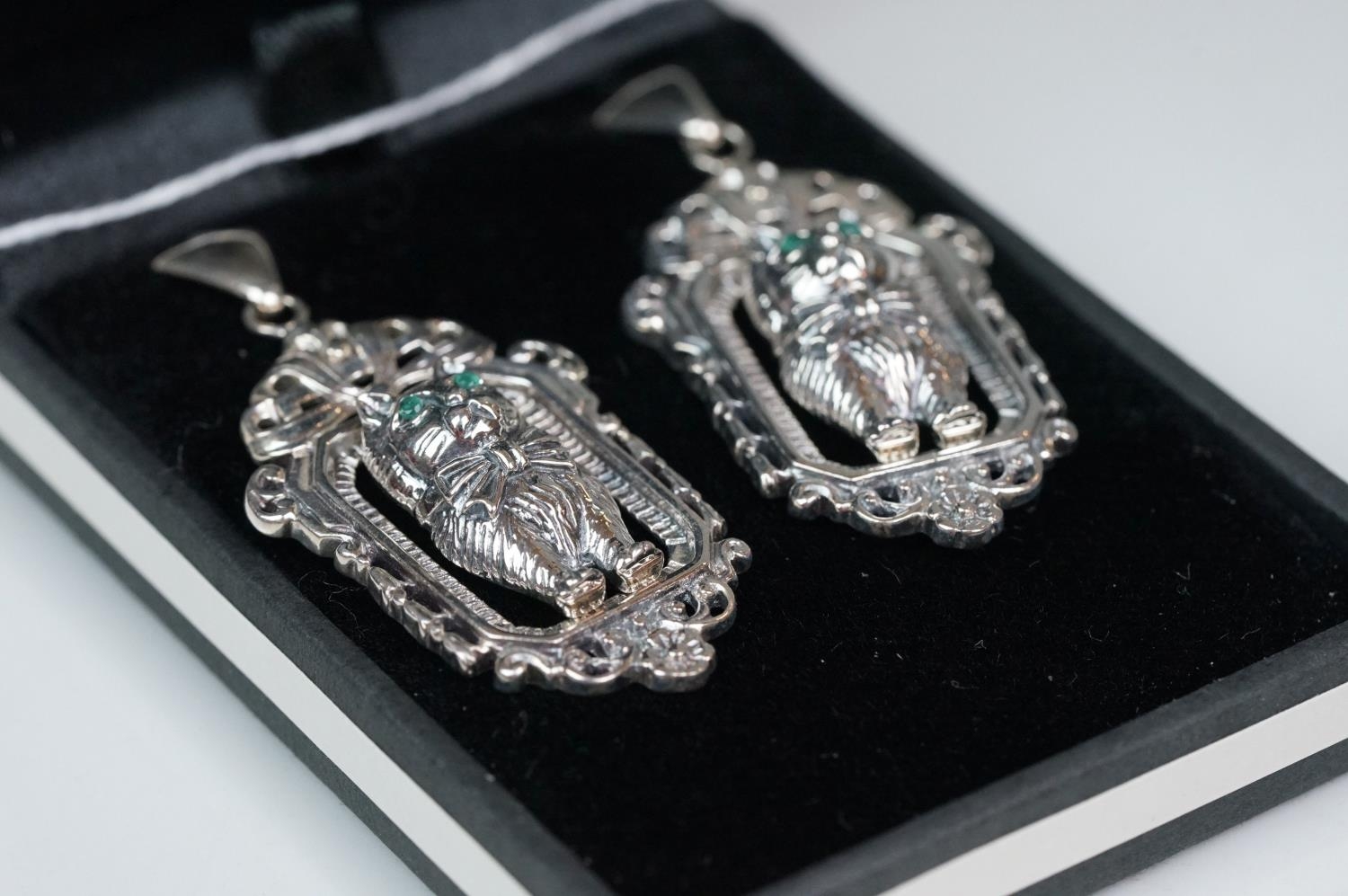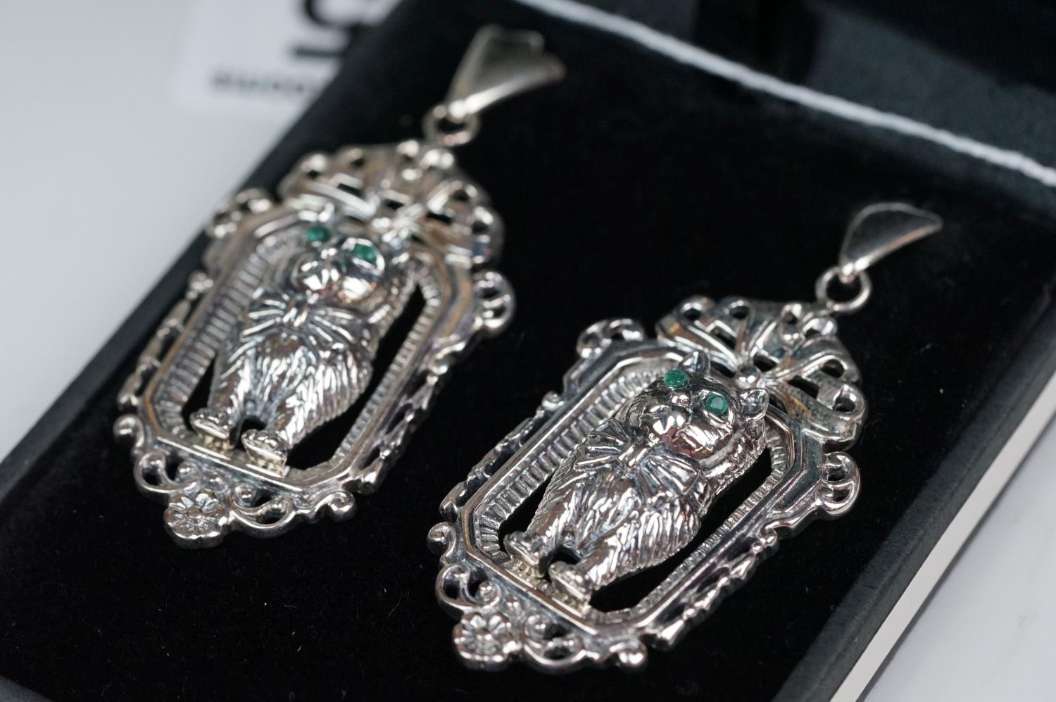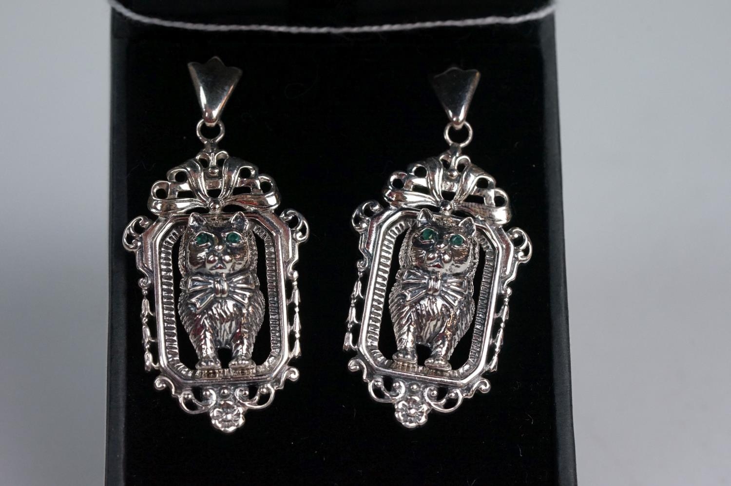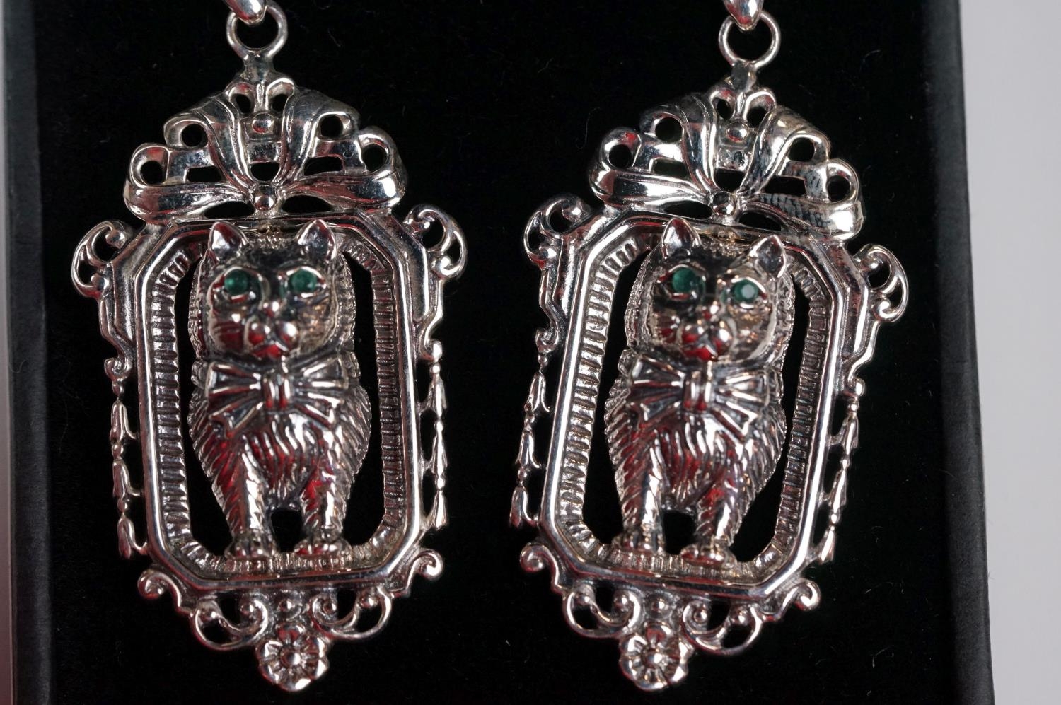 Pair of silver Art Deco style drop earrings, in the form of cats