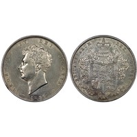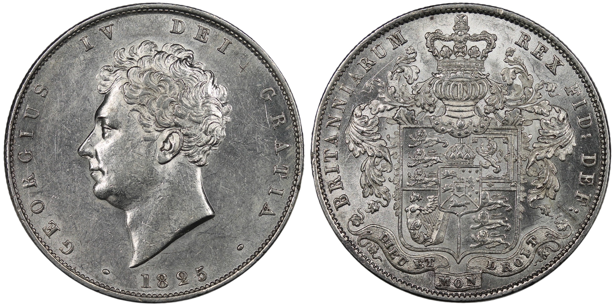 1825 Halfcrown, George IV. Obv. Bare bust, Rev. square topped garnished shield surmounted by crowned helmet with lambrequins. A vibrant example the reverse with considerable mint lustre and oozing eye appeal. Obverse lightly cleaned with some resulting hairlines; a real Jekyll & Hyde coin. aEF/gEF. [ESC 642, Bull 2371, S.3809]