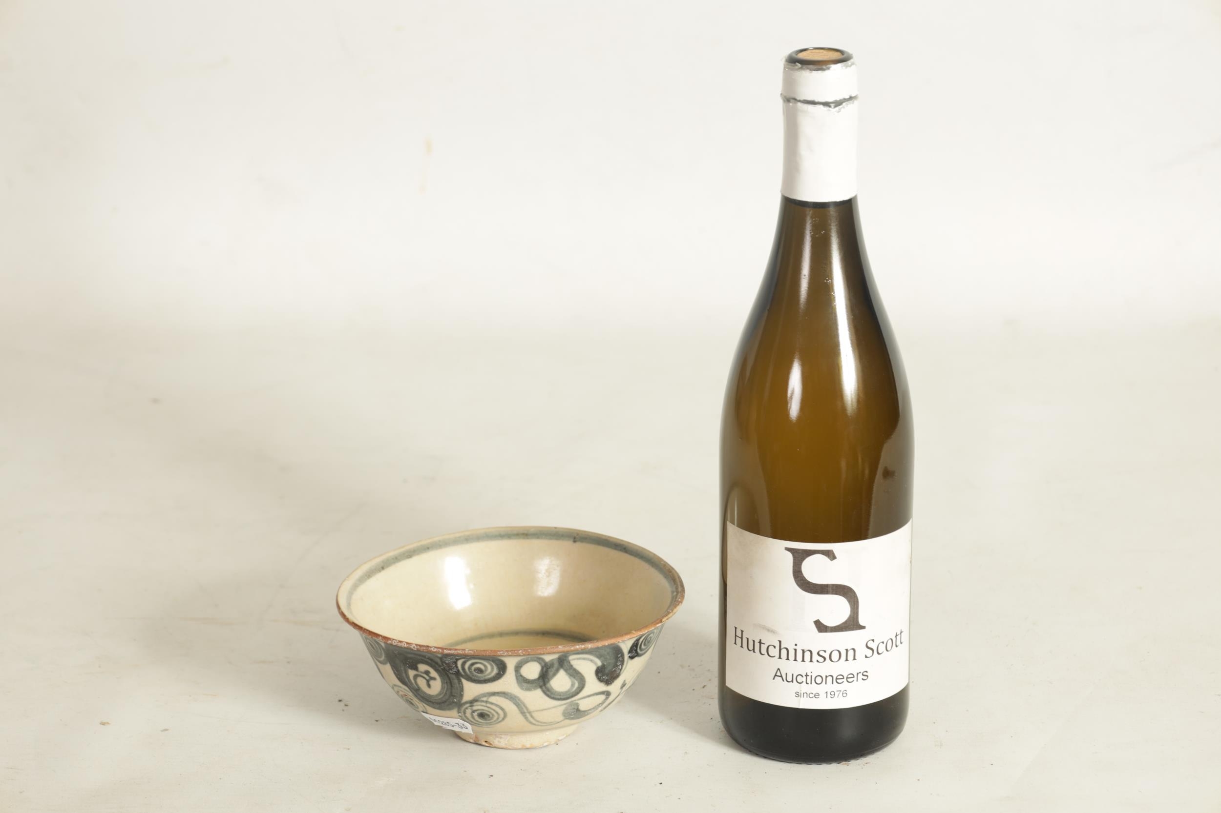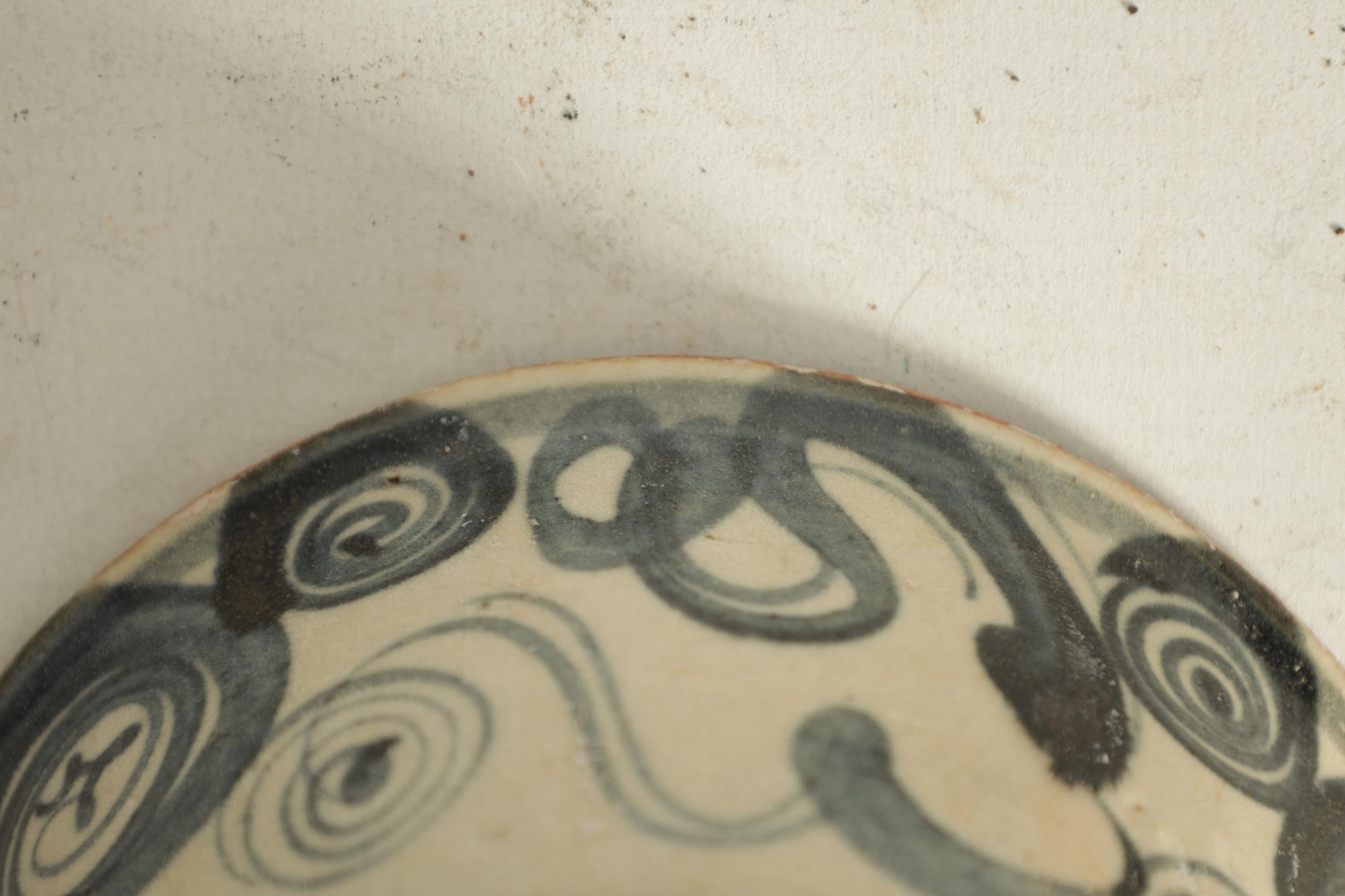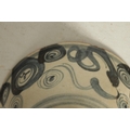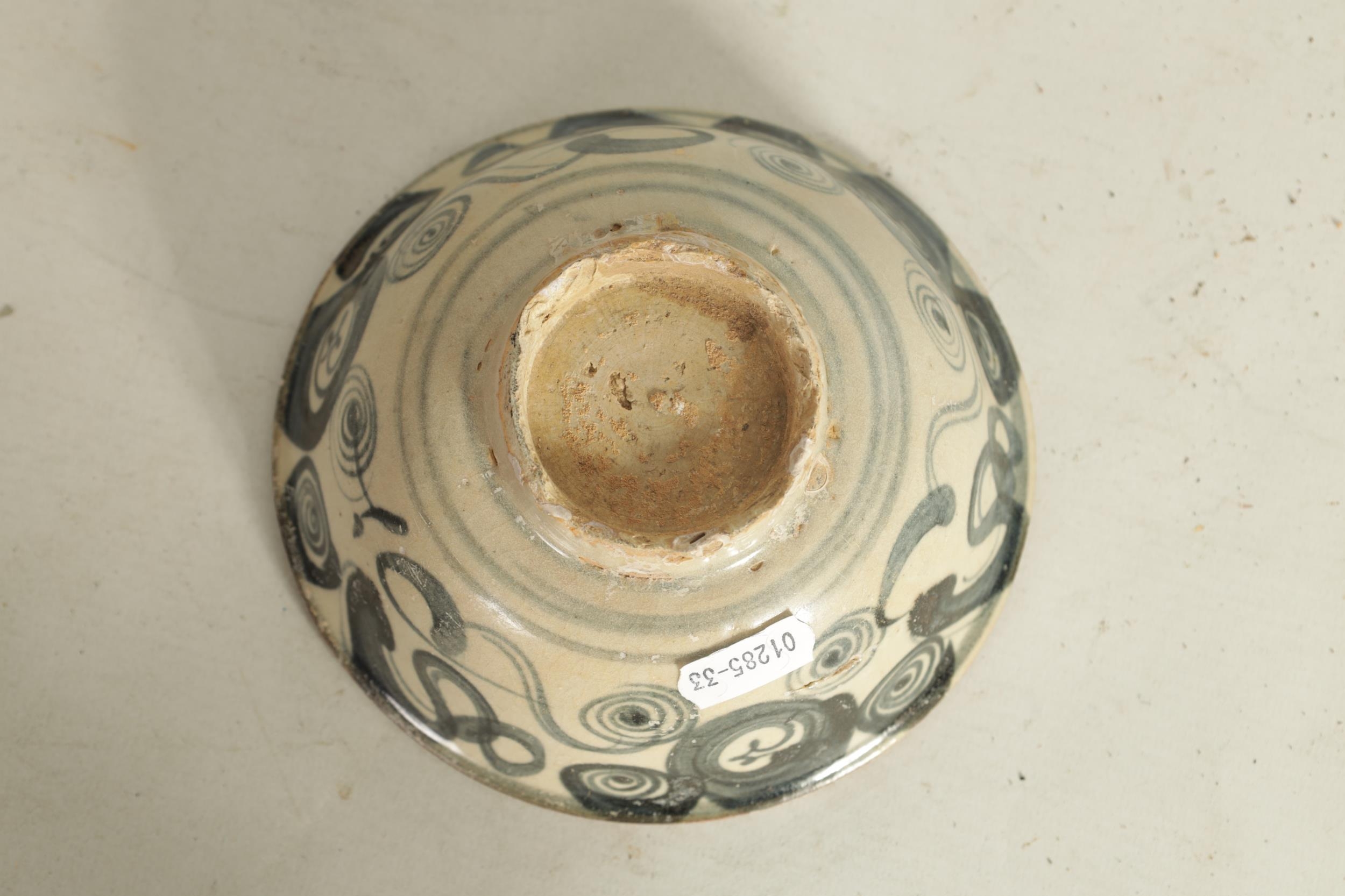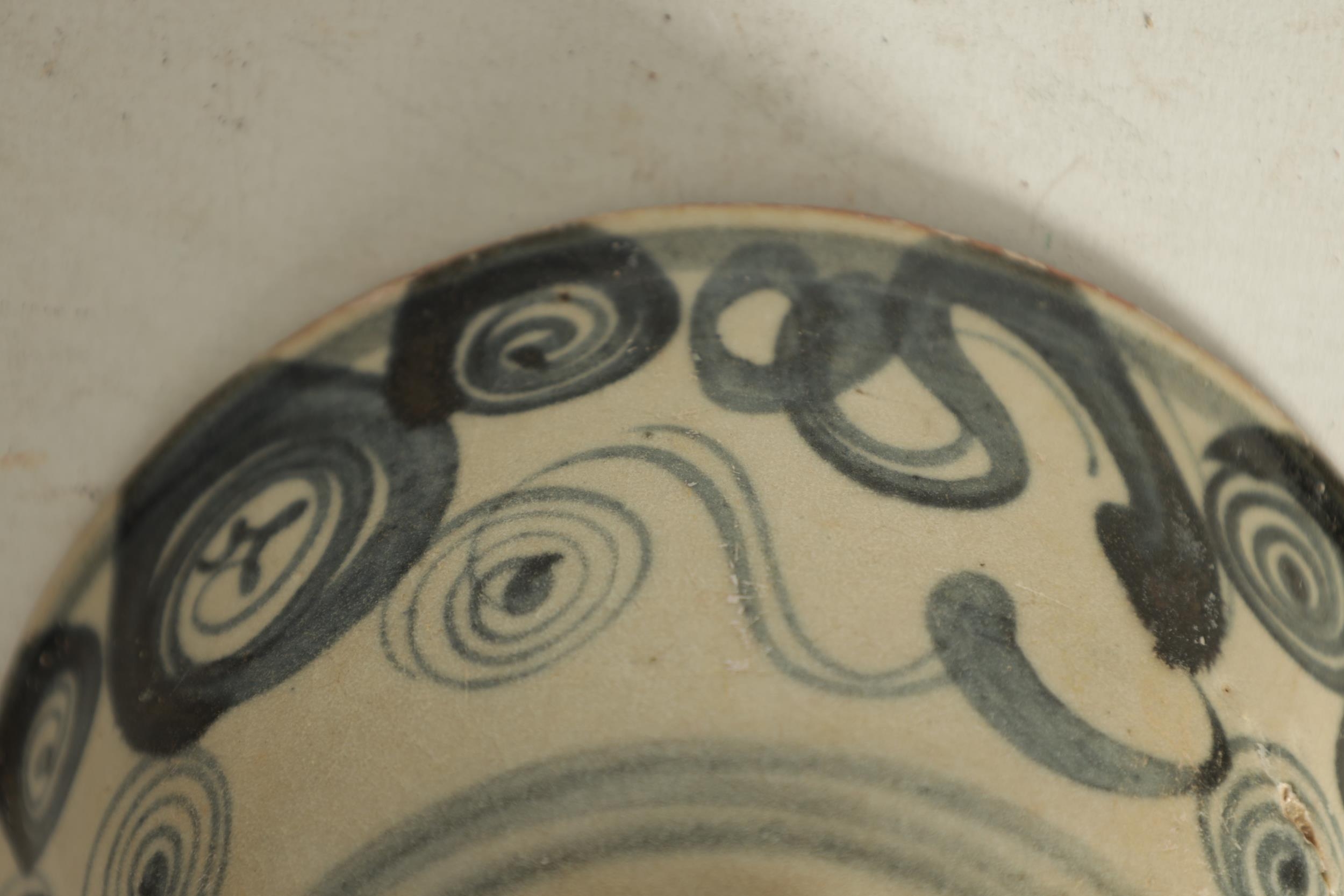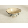 A CHINESE MING SLIPWARE BOWL with blue scrollwork decoration on tapering foot (14.6cm diameter)