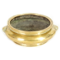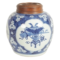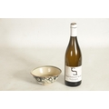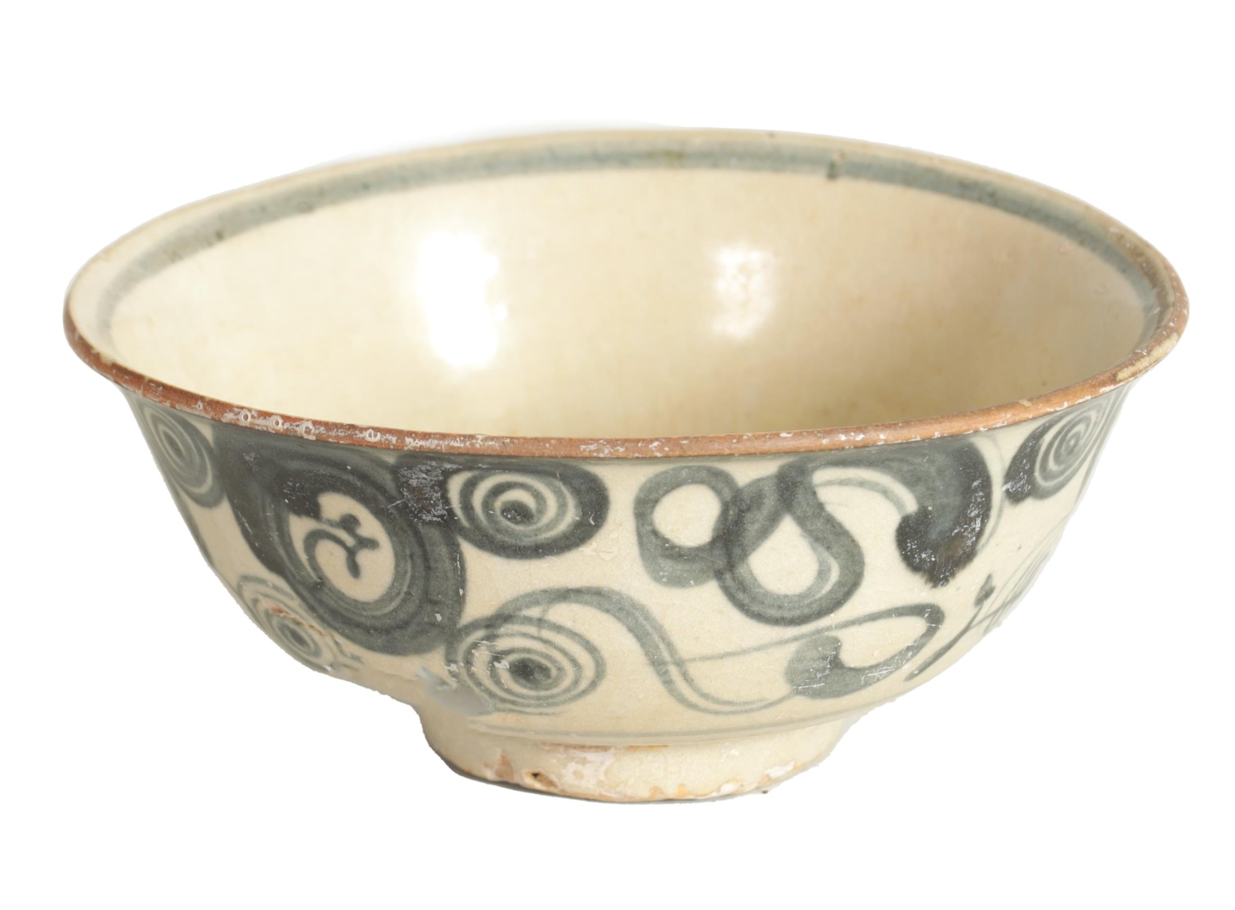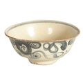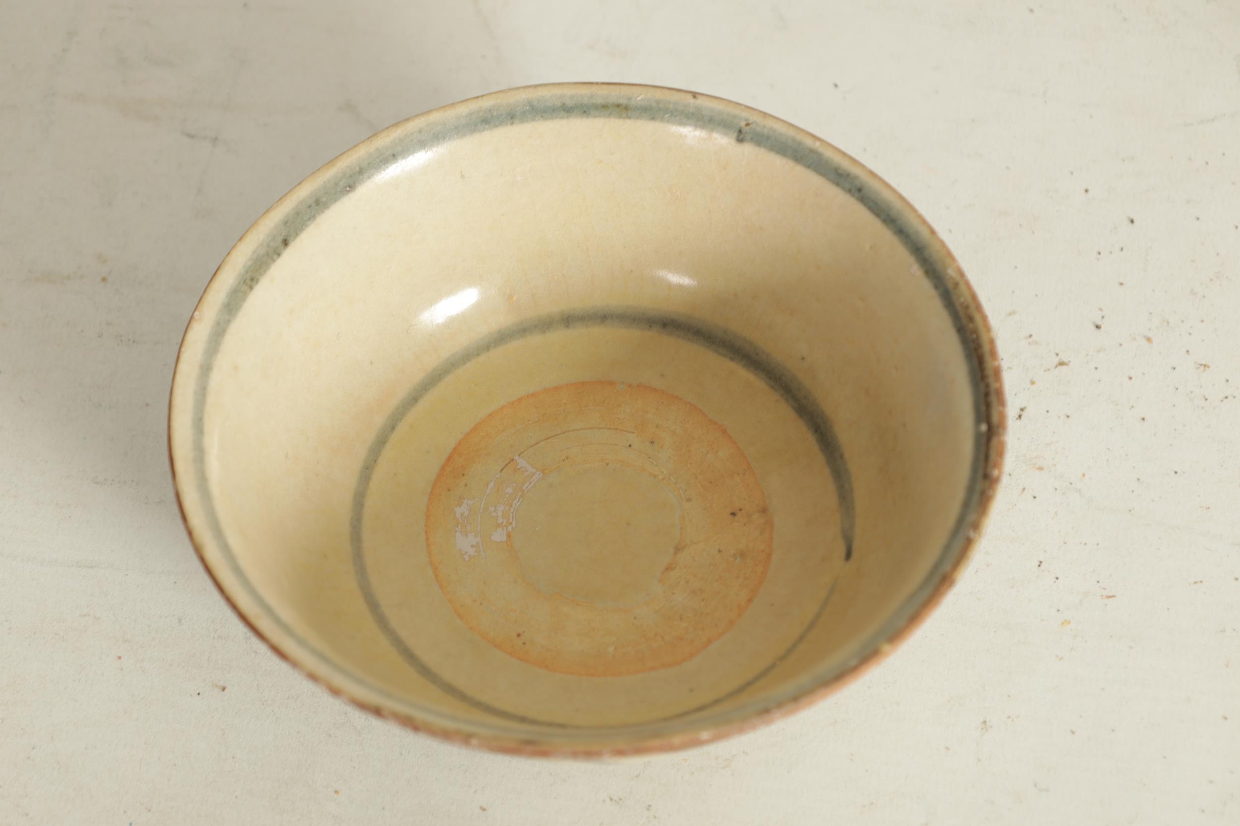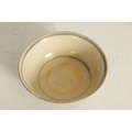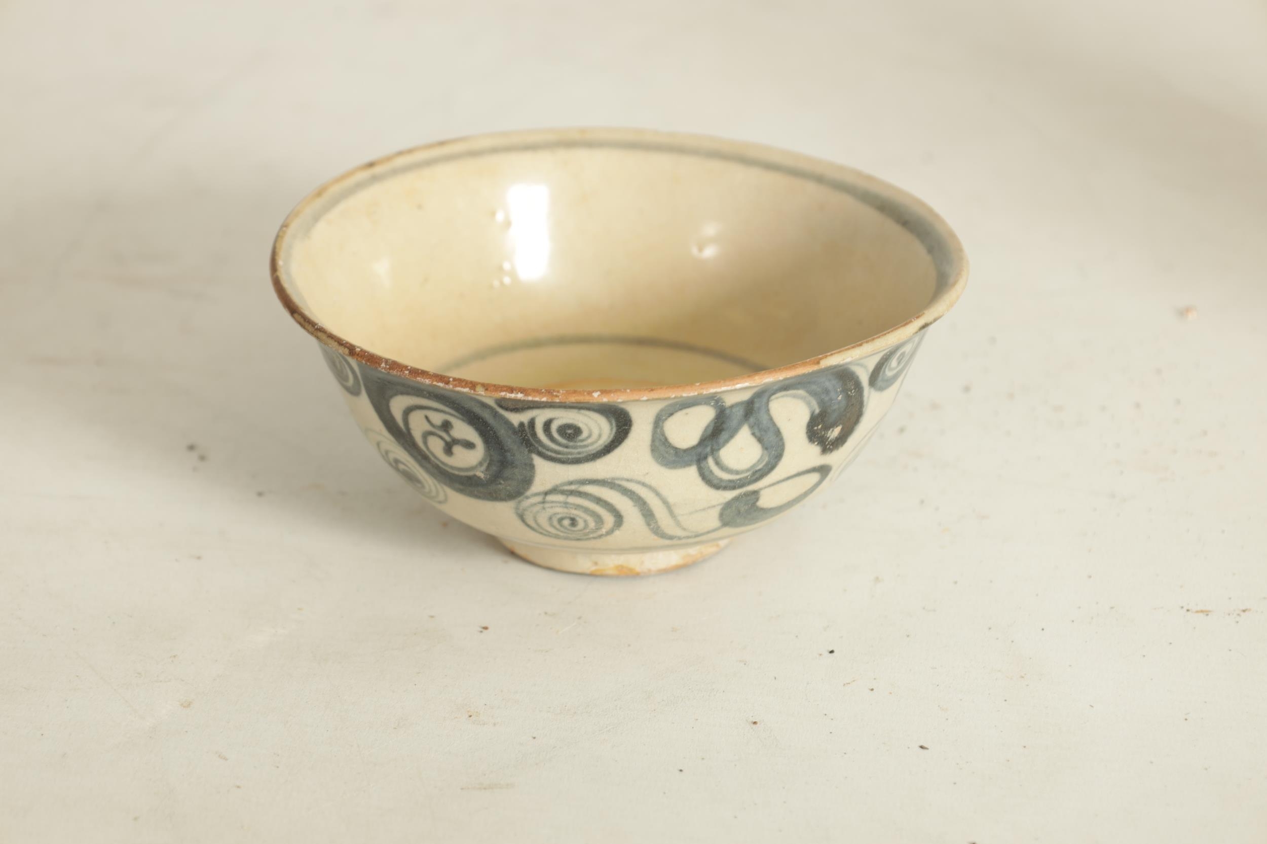 A CHINESE MING SLIPWARE BOWL with blue scrollwork decoration on tapering foot (14.6cm diameter)