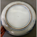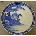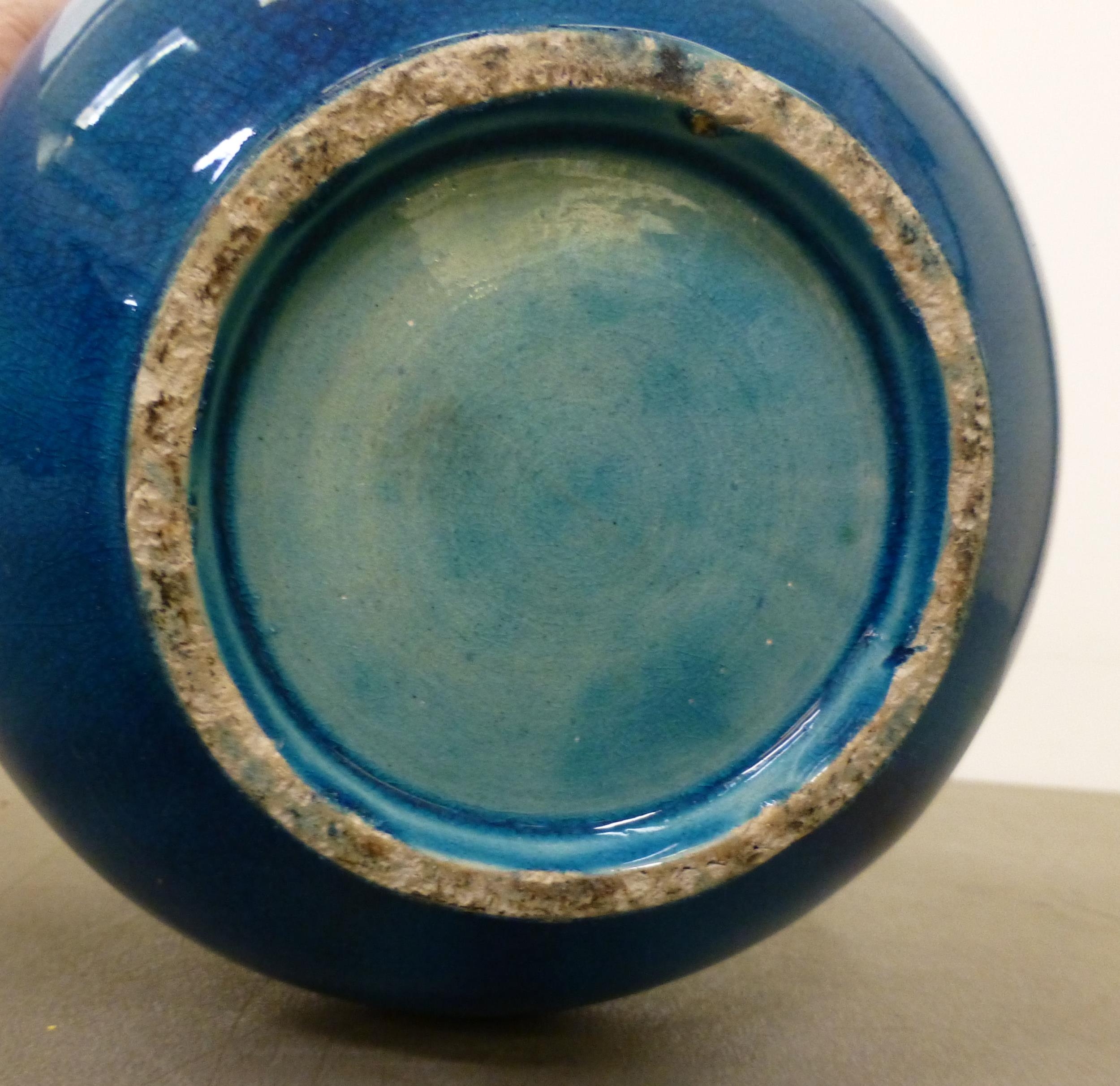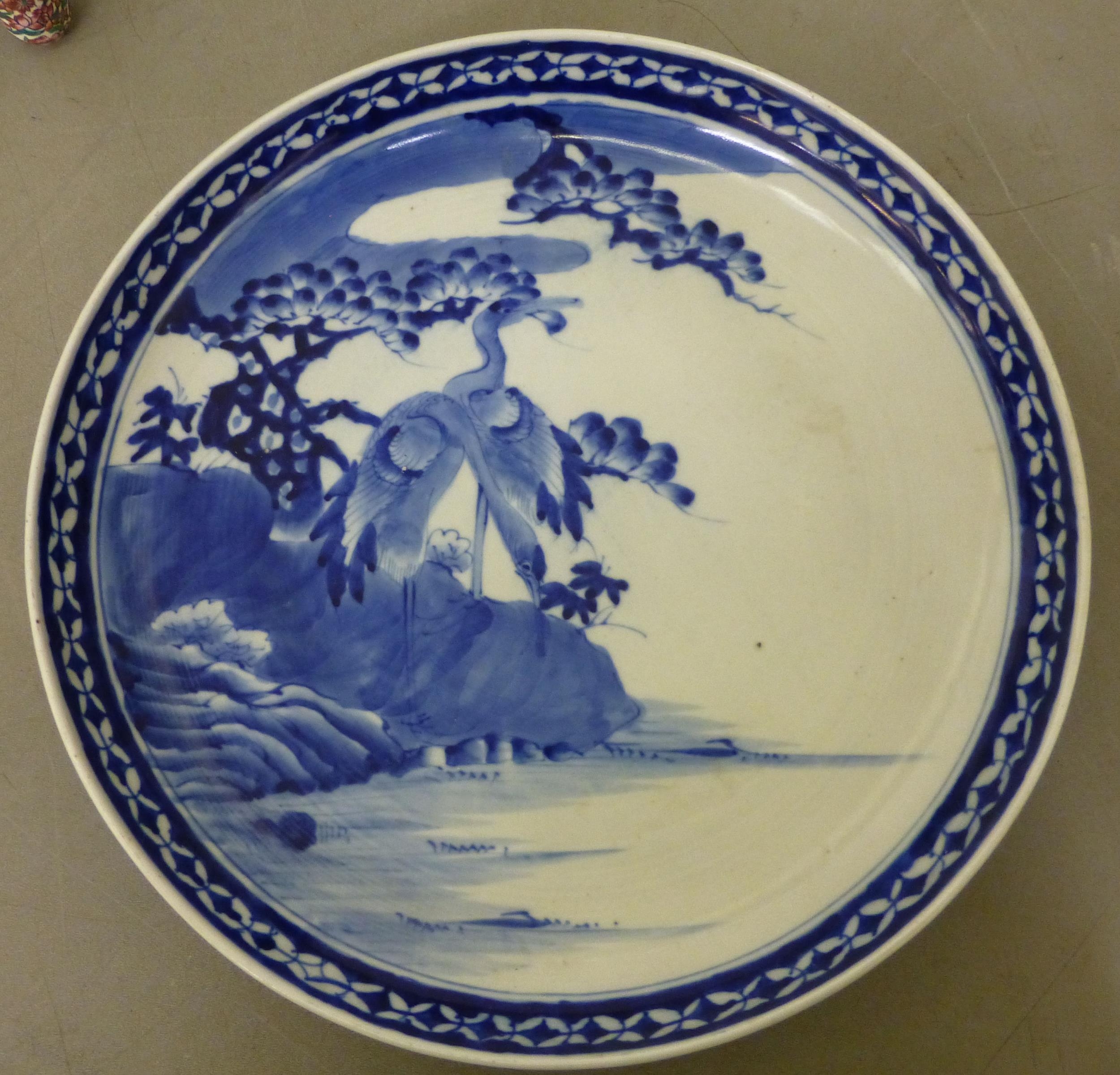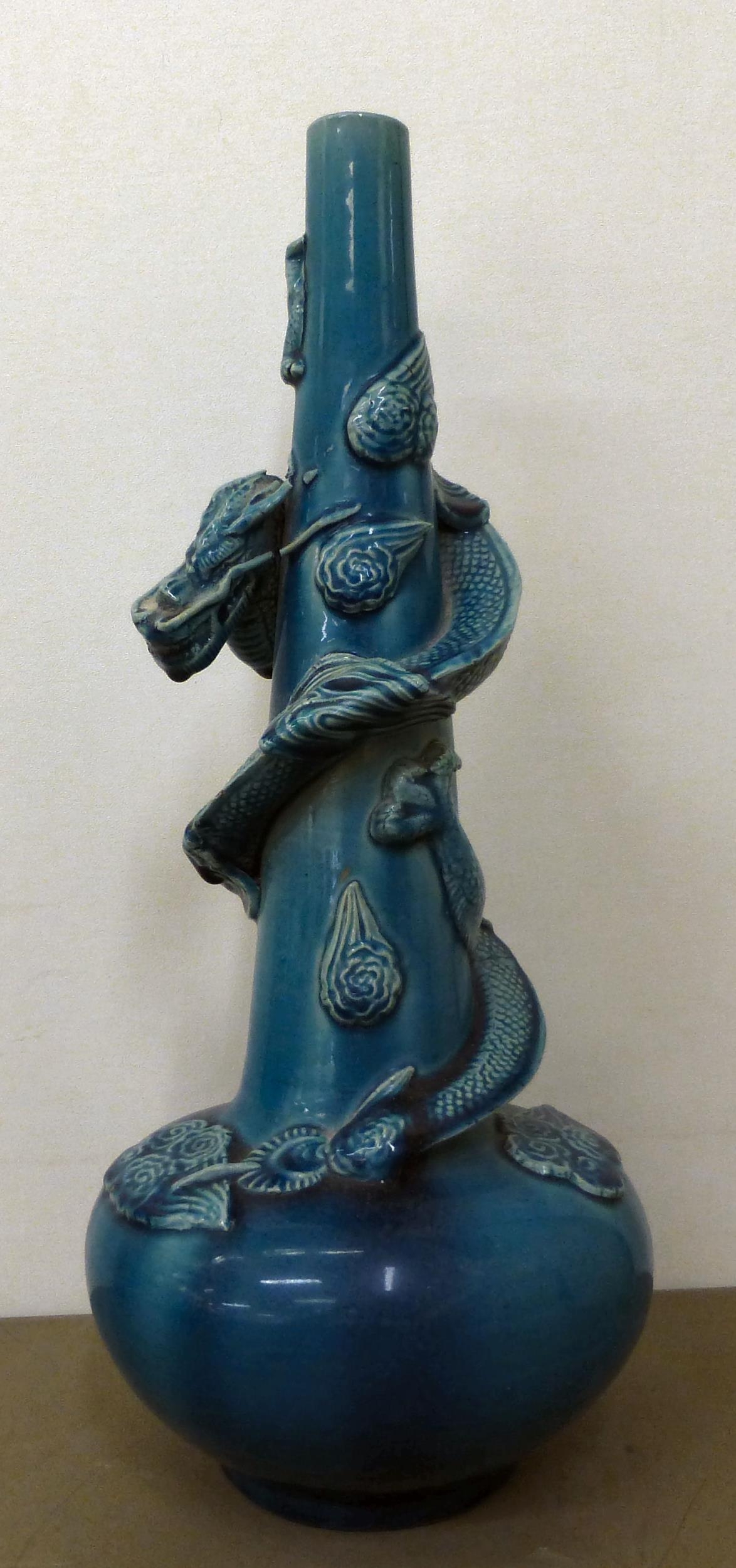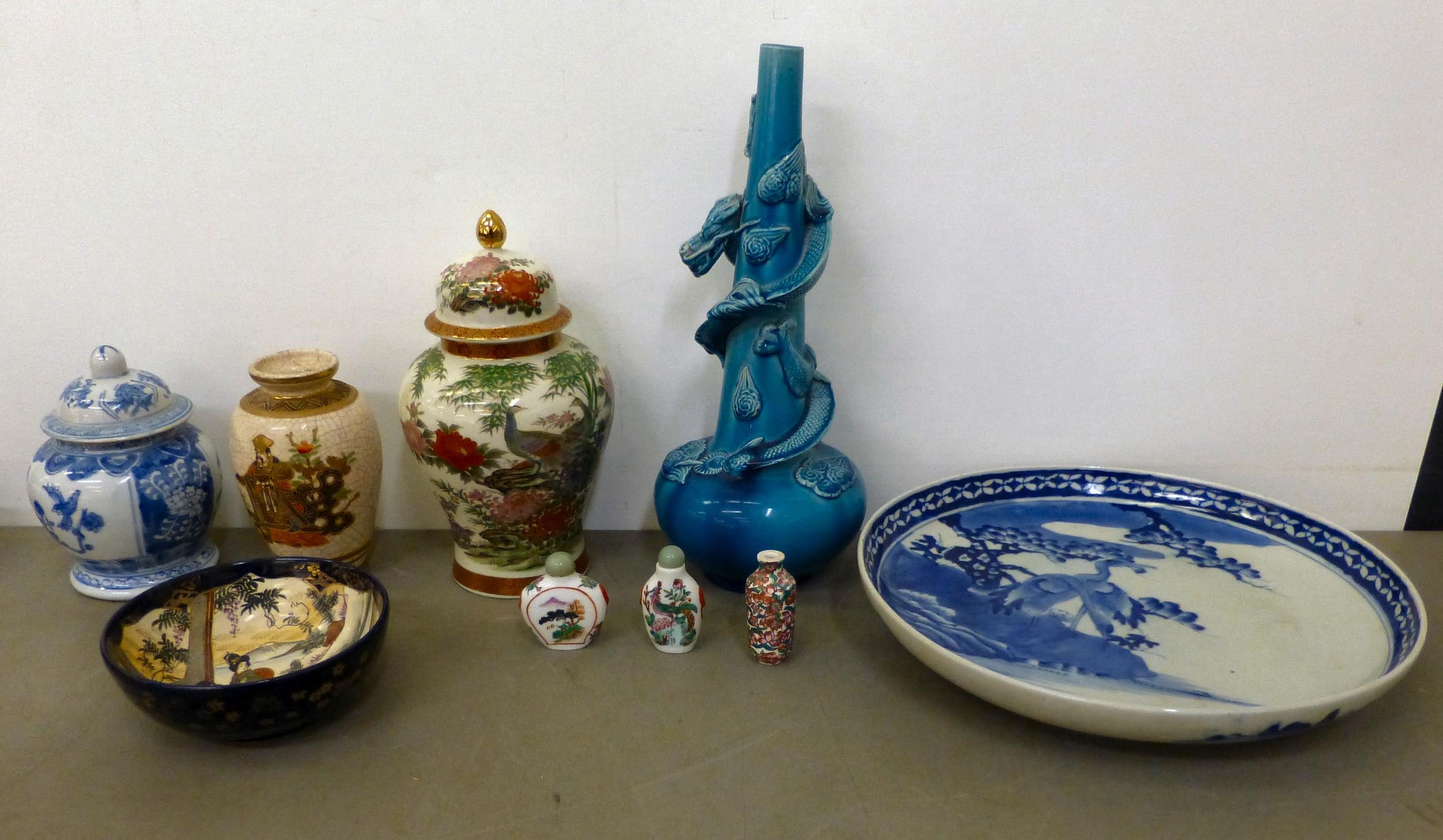 Ceramics: to include a blue glazed earthenware vase, mounted with a coiled dragon 14"h; and a blue and white charger, decorated with wading cranes 13.5"dia