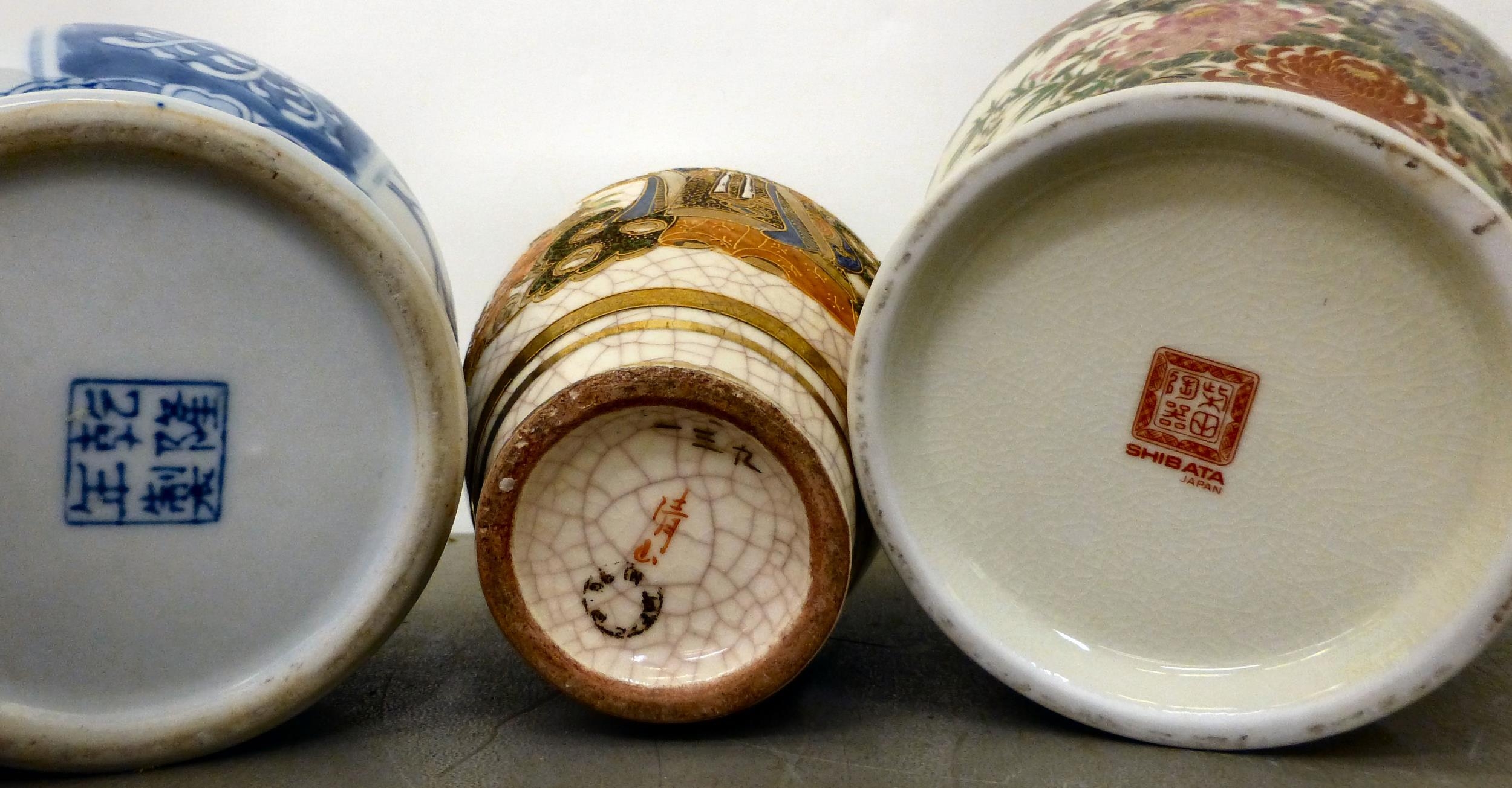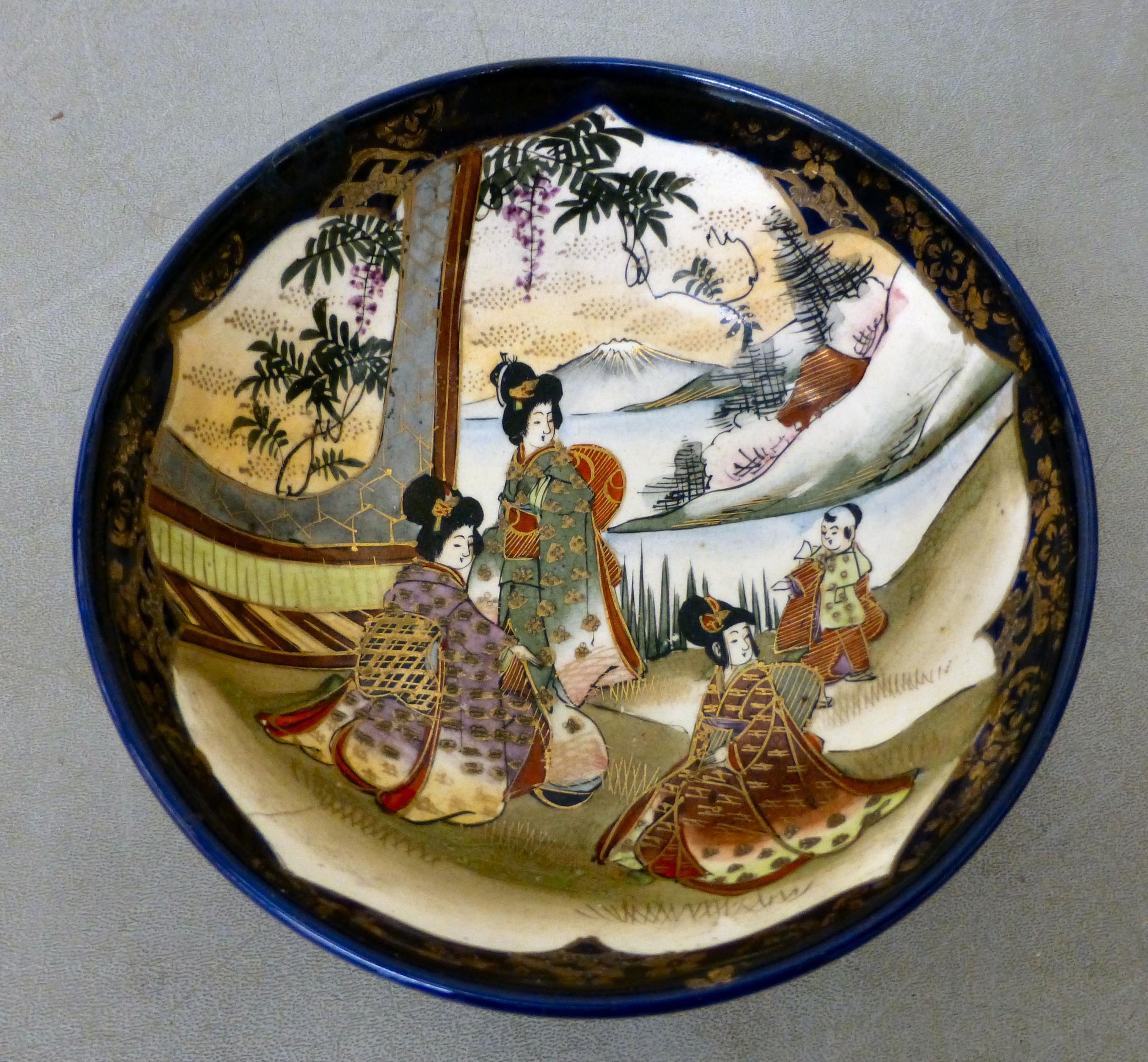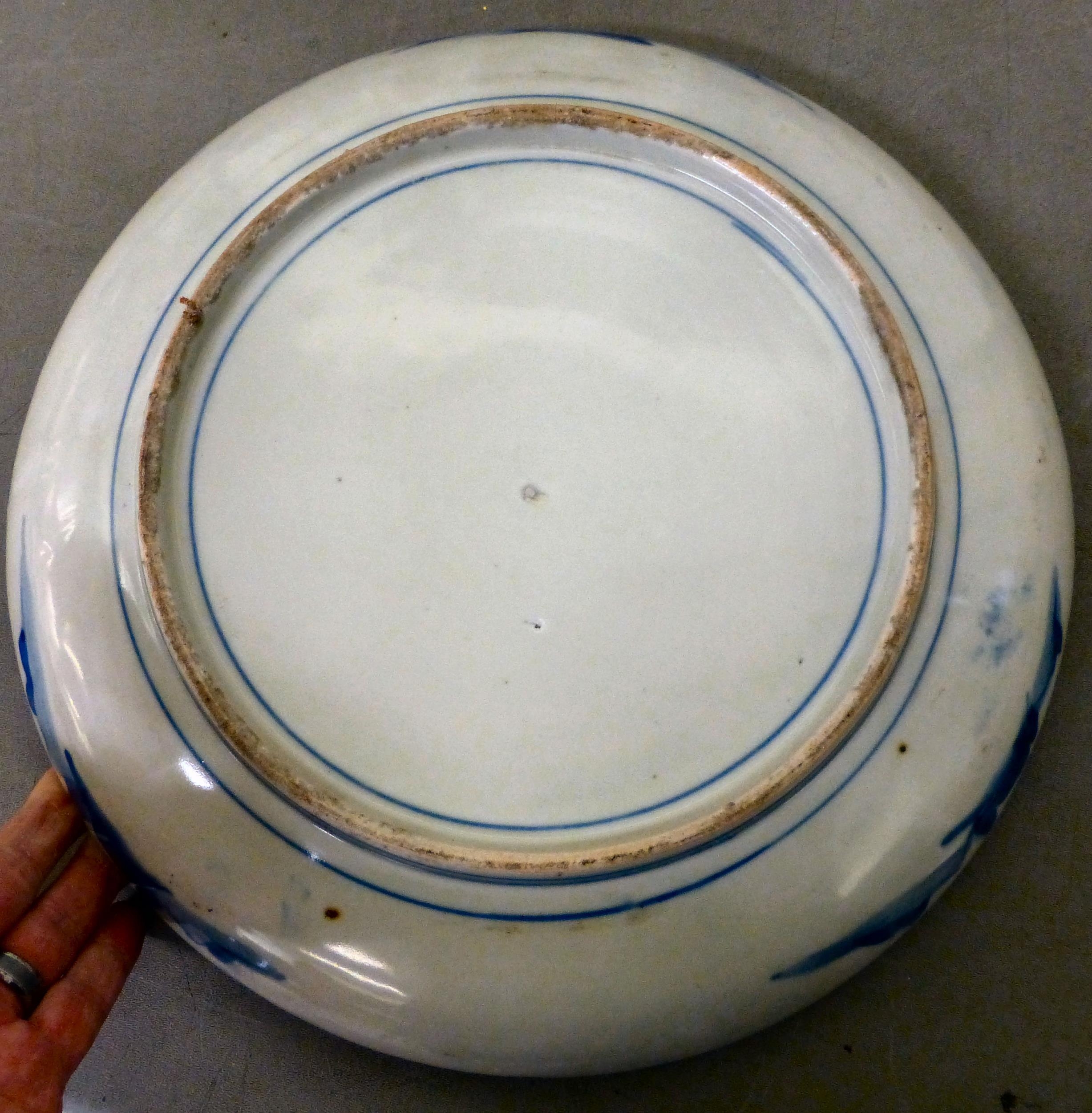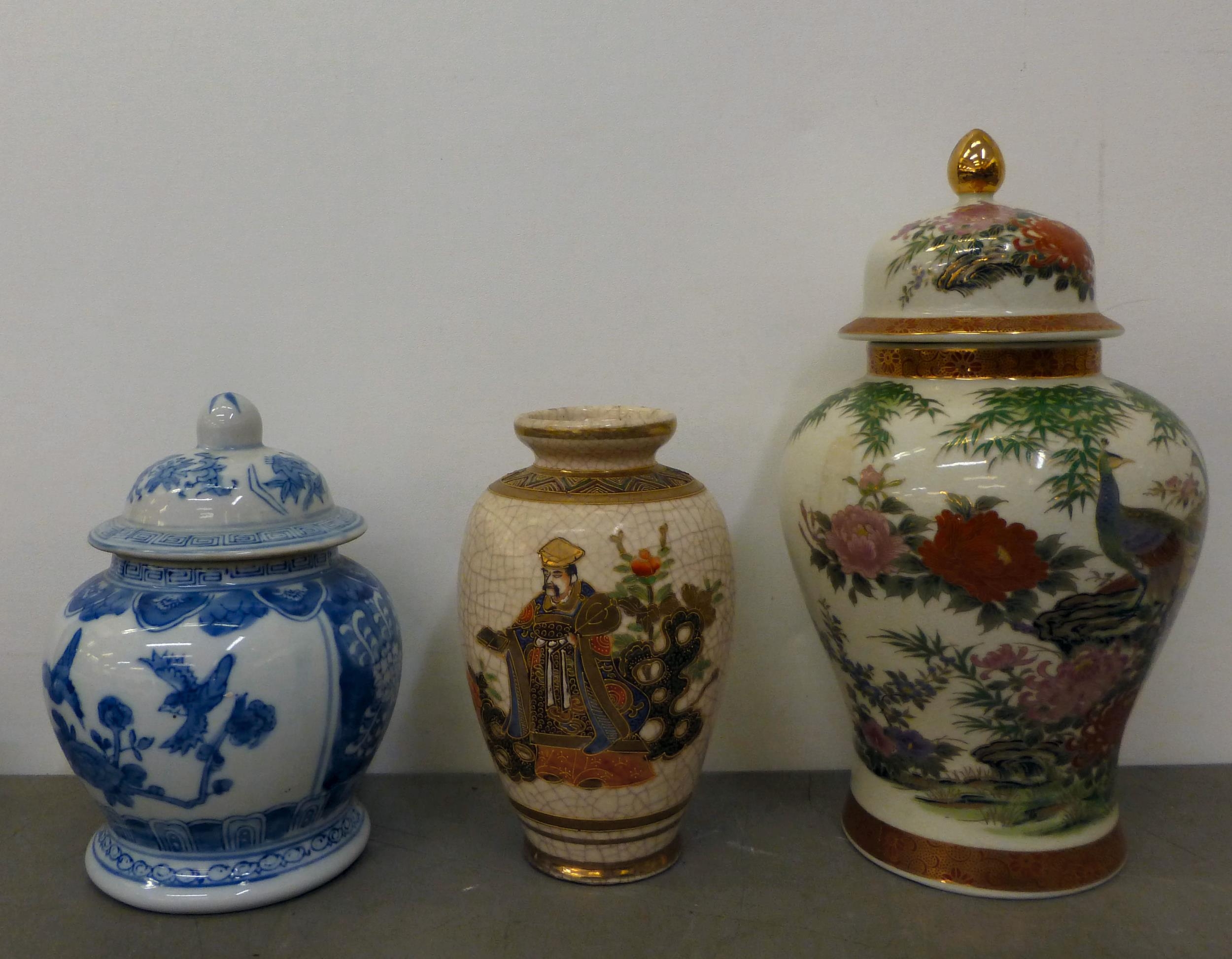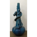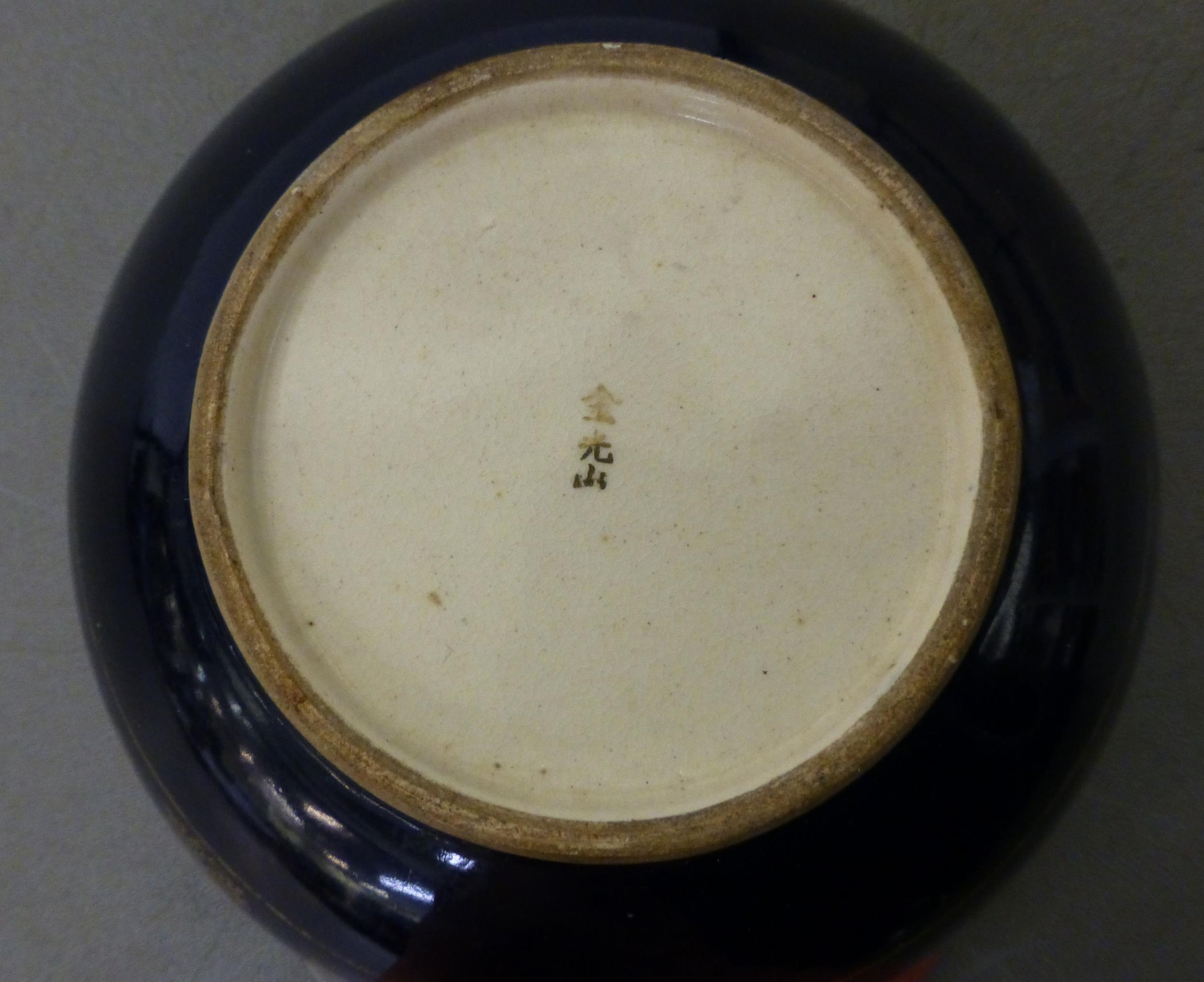 Ceramics: to include a blue glazed earthenware vase, mounted with a coiled dragon 14"h; and a blue and white charger, decorated with wading cranes 13.5"dia