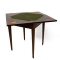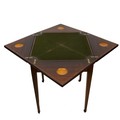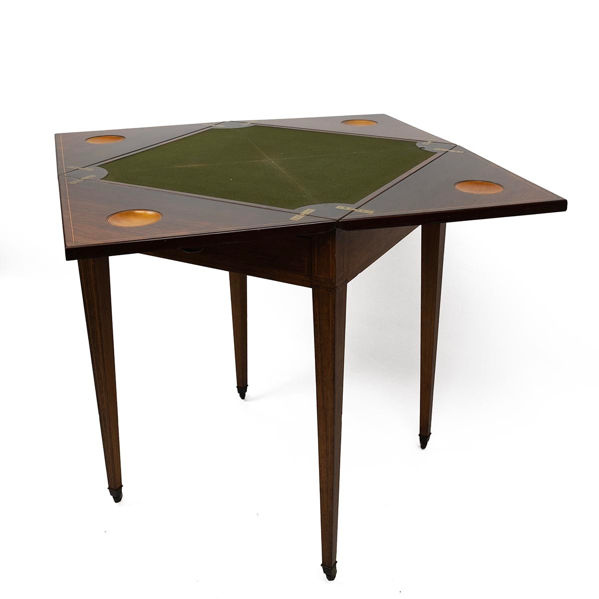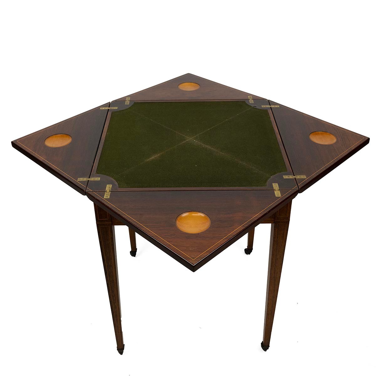 An Edwardian MAPLE & Co inlaid Rosewood square envelope games table. The segmented top with near match wood grain with swivel sprung loaded flap, opening to reveille four bur maple gaming cups above a single drawer with makers stamp raised on square tapering supports to cup casters. L55.5cm x D55.5cm x H74cm.