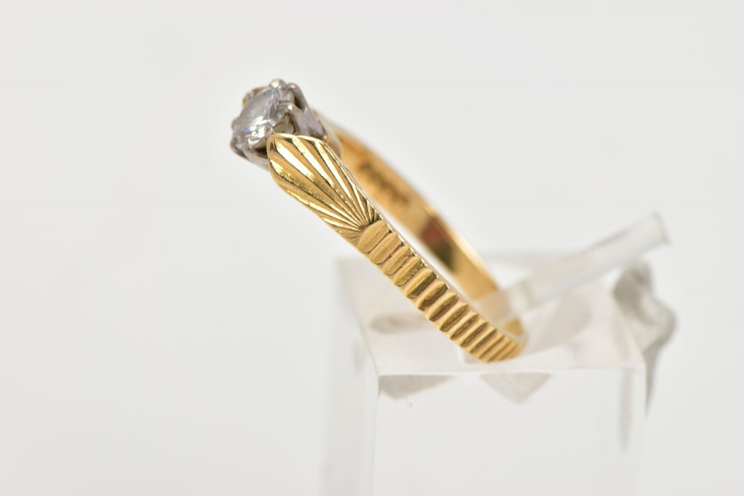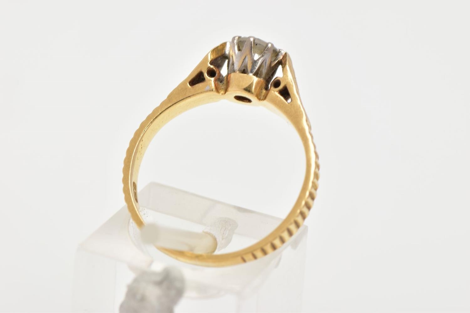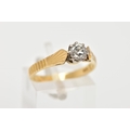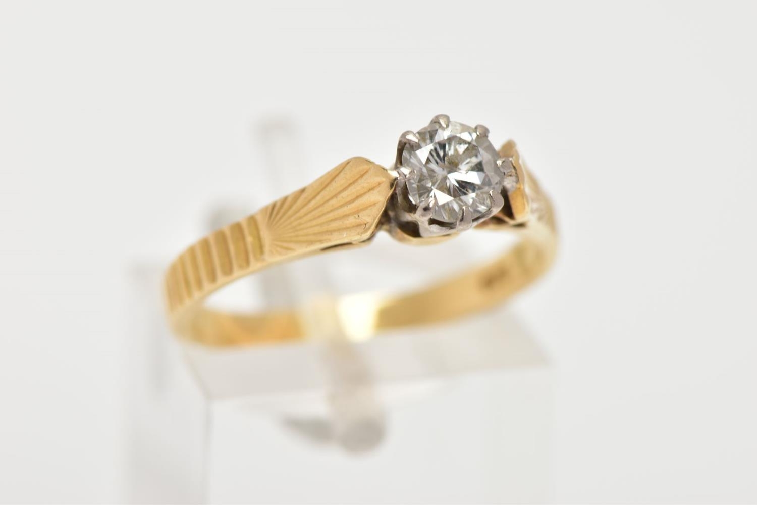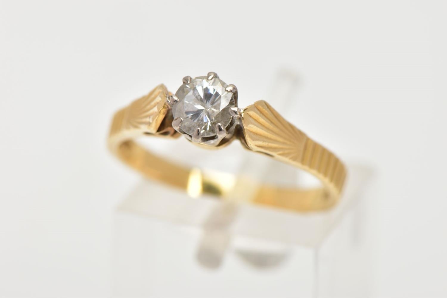 AN 18CT GOLD SINGLE STONE DIAMOND RING, designed with an eight claw set round brilliant cut diamond, estimated diamond weight 0.50cts, colour assessed as G/H, clarity assessed as I1, to the textured shoulders and band, ring size M, hallmarked 18ct gold London, approximate gross weight 3.4 grams (condition report: general light wear, nice bright diamond in good condition, overall condition good)