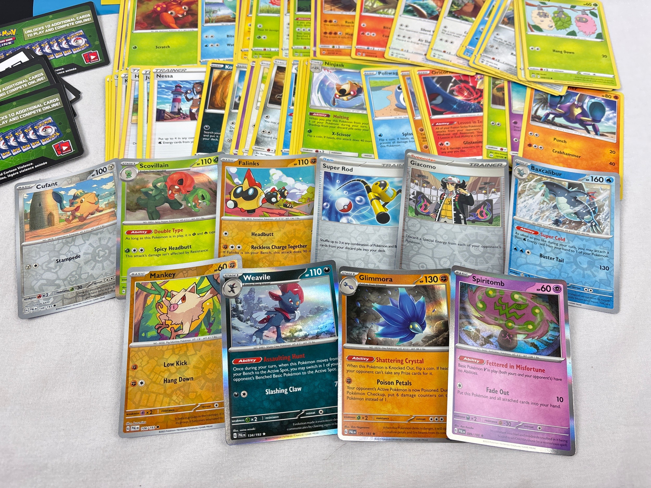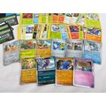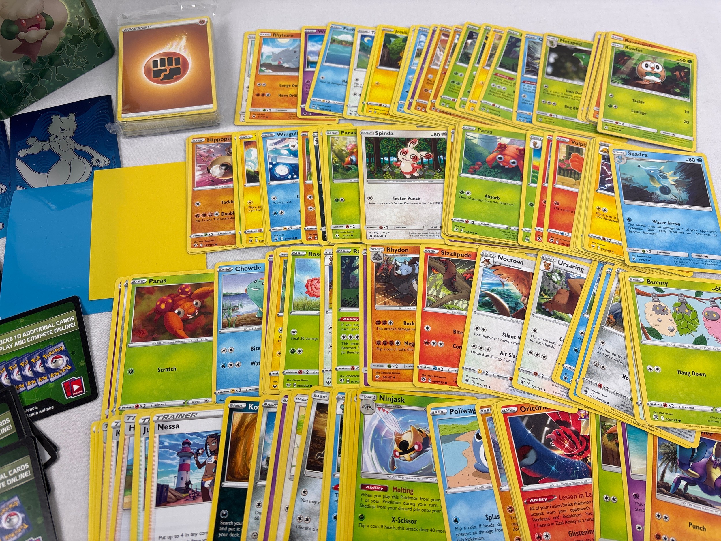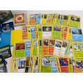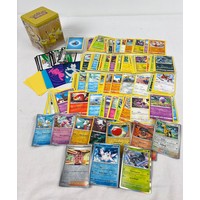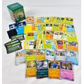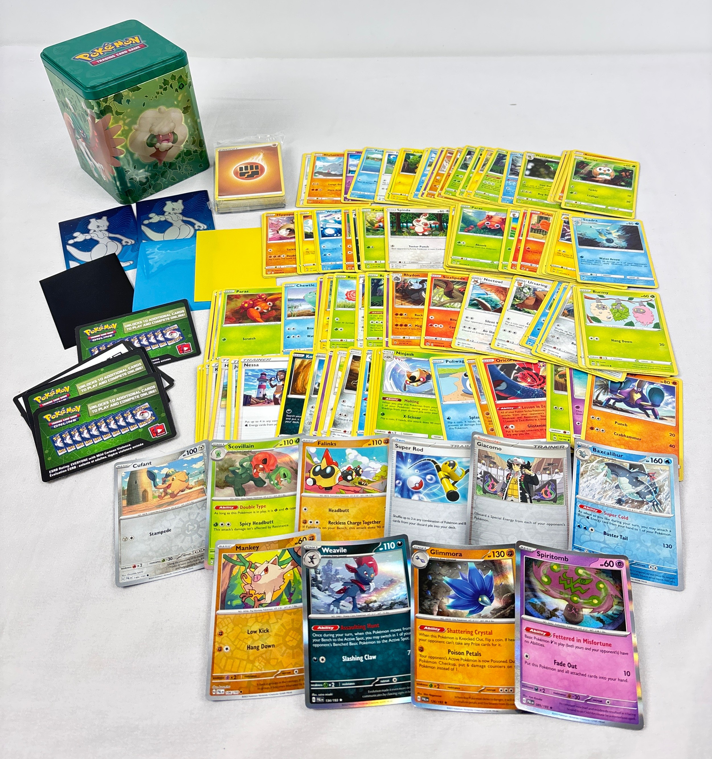 A grass (green) Pokémon stacking tin containing 200 assorted Pokémon cards & 5 card sleeves. Cards include 120 character cards, 10 Trainer cards, 10 holo's & reverse holo's, a sealed pack of energy cards and TCG online code cards.