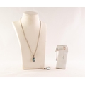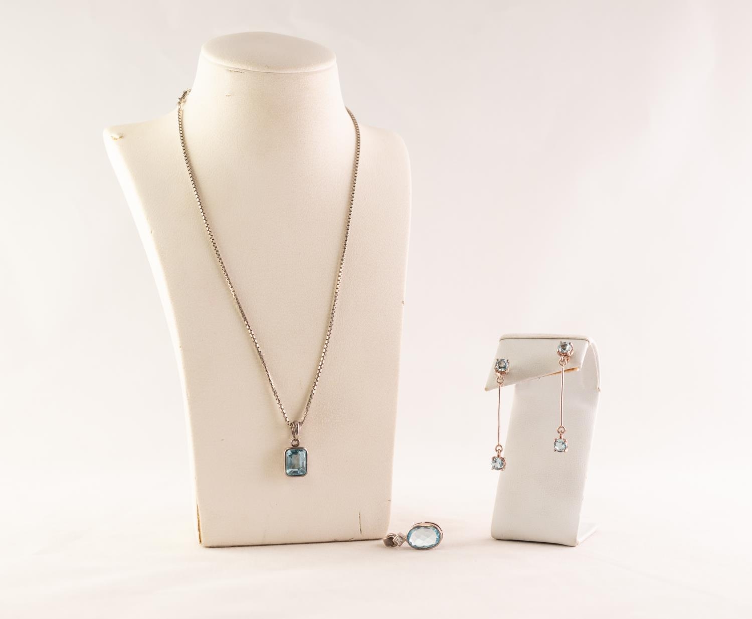 SILVER AQUAMARINE SET OBLONG PENDANT, on silver fine chain necklace; an oval facet cut aquamarine PENDANT (no chain) and a pair of silver and aquamarine set DROP EARRINGS (4)