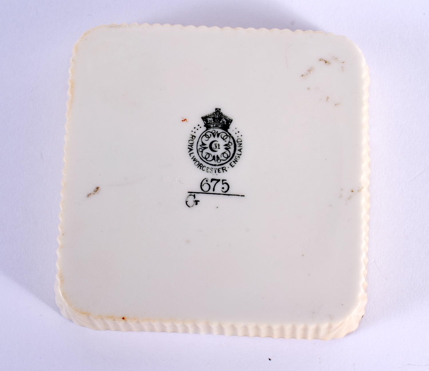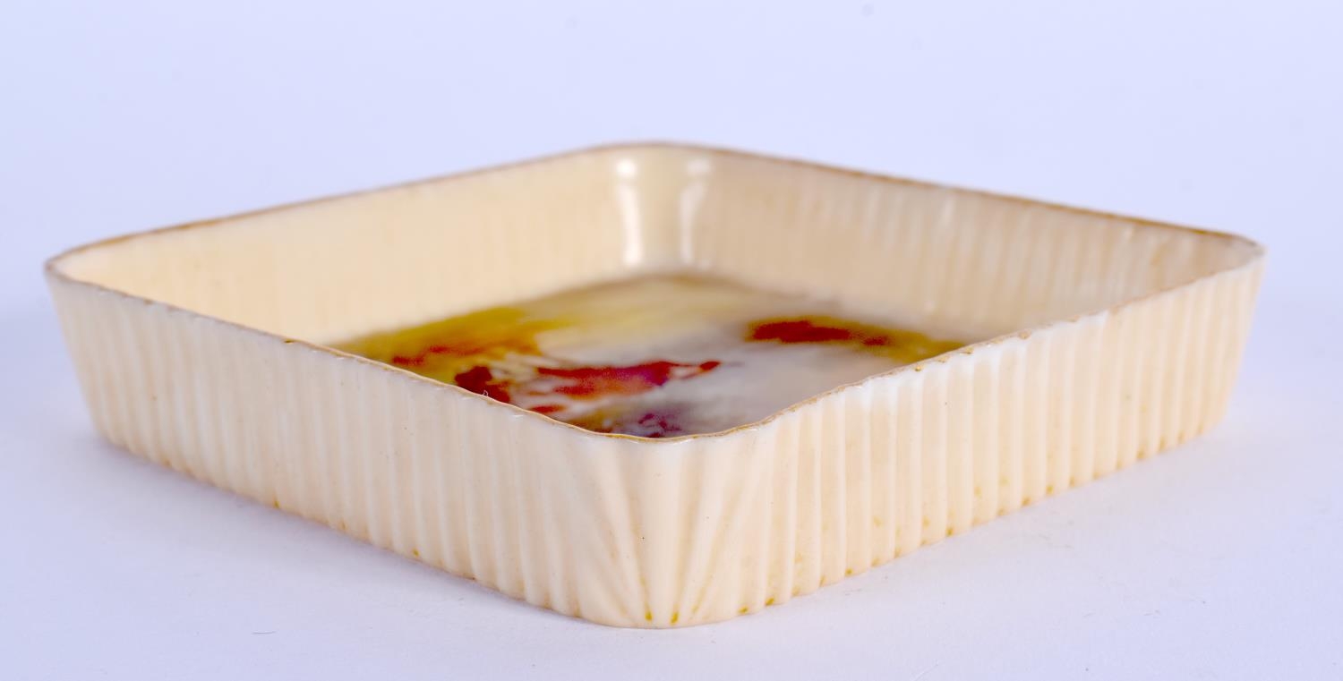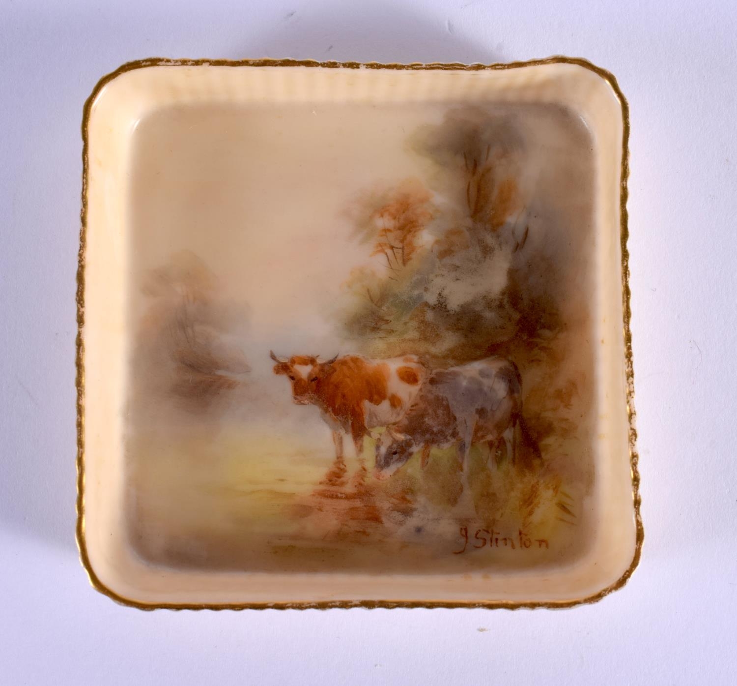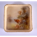 A SMALL ROYAL WORCESTER PIN TRAY by James Stinton, painted with highland cattle. 8 cm square.