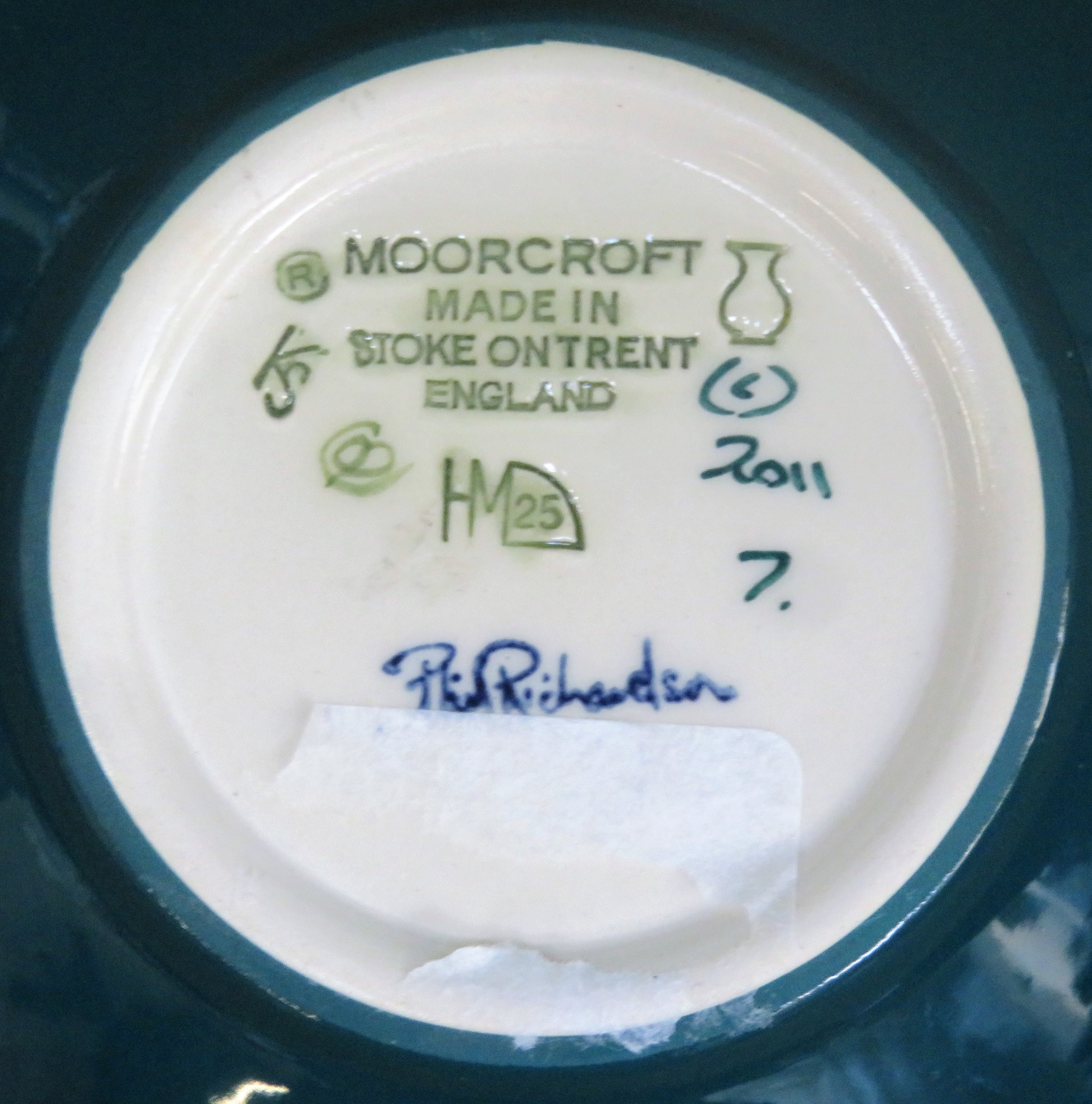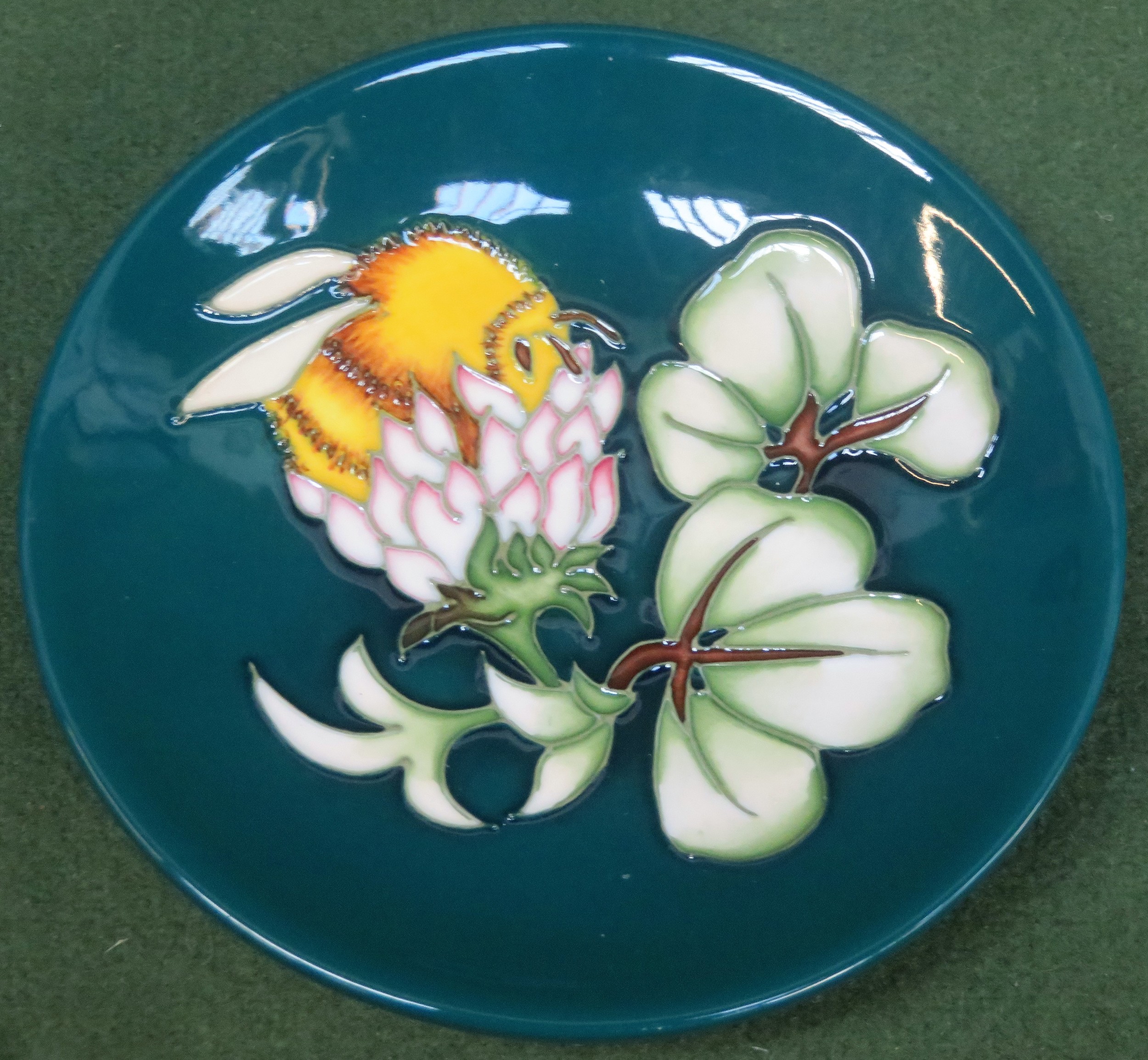 Moorcroft tube lined and glazed ceramic 'Bumble Bee' circular shallow bowl/receiver, signed to base by Phil Richardson and dated 2011. Approx. 12cms D