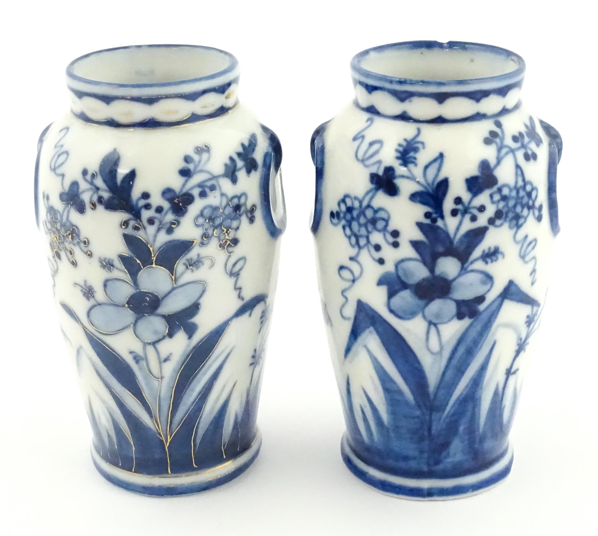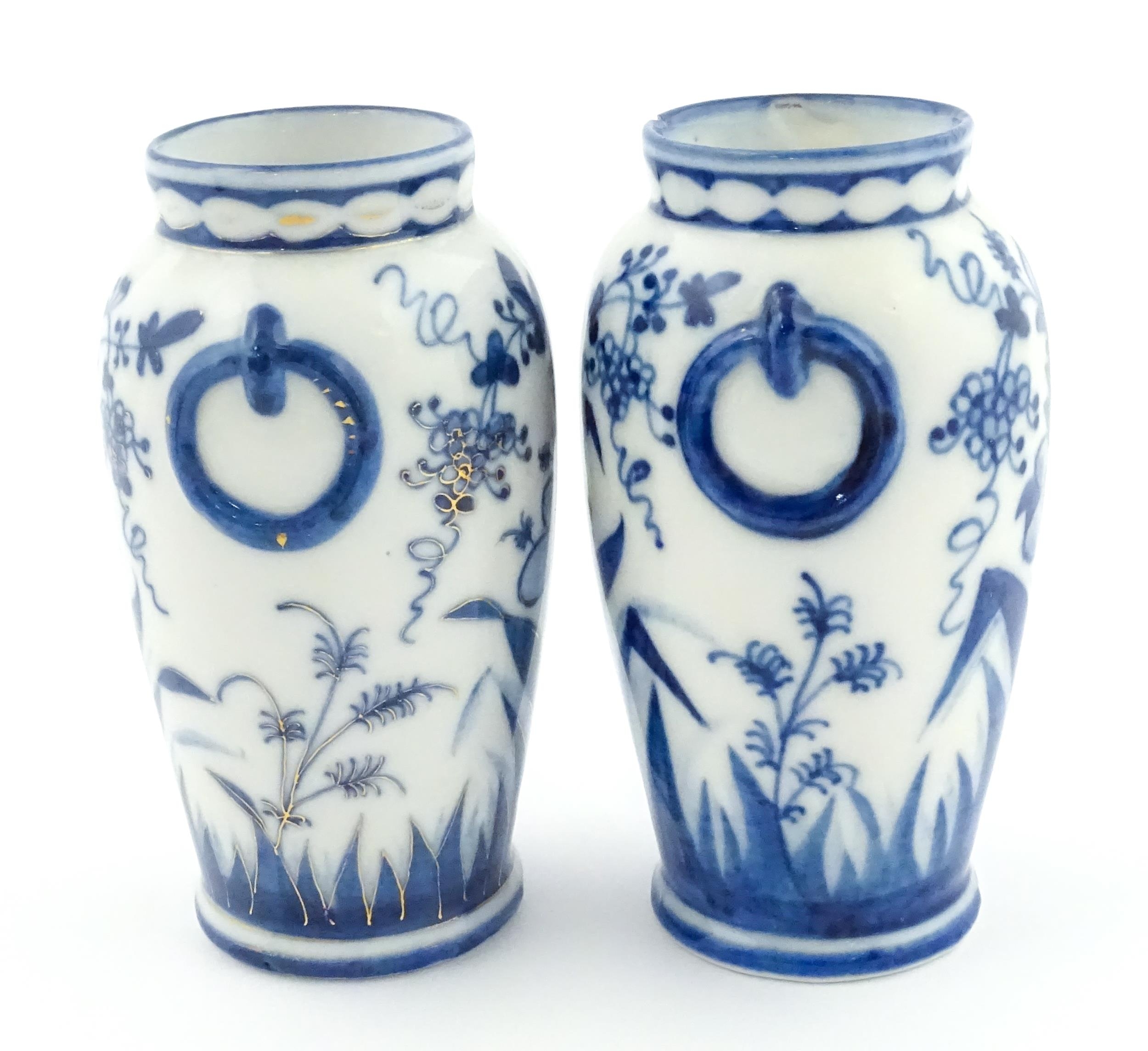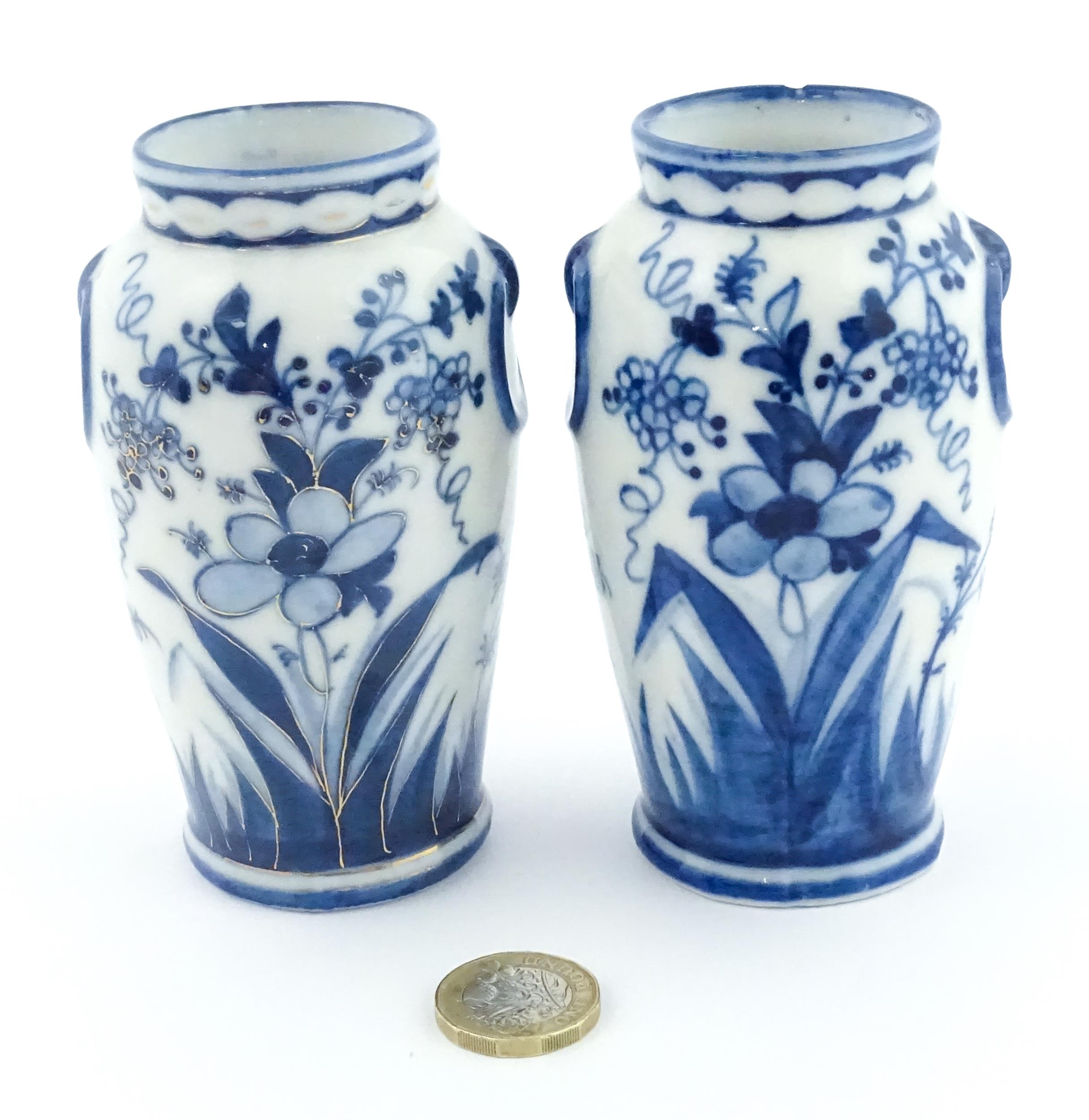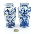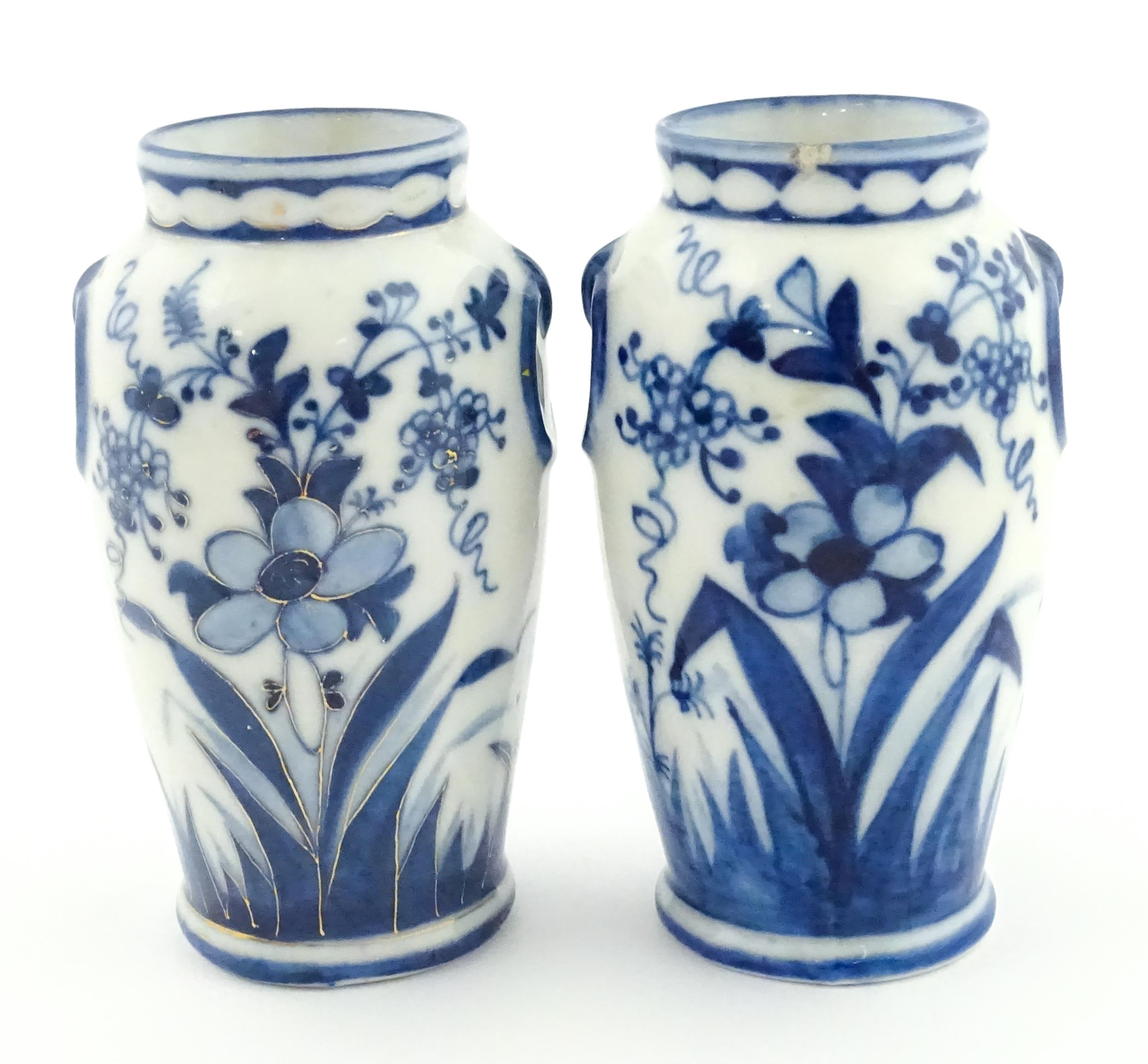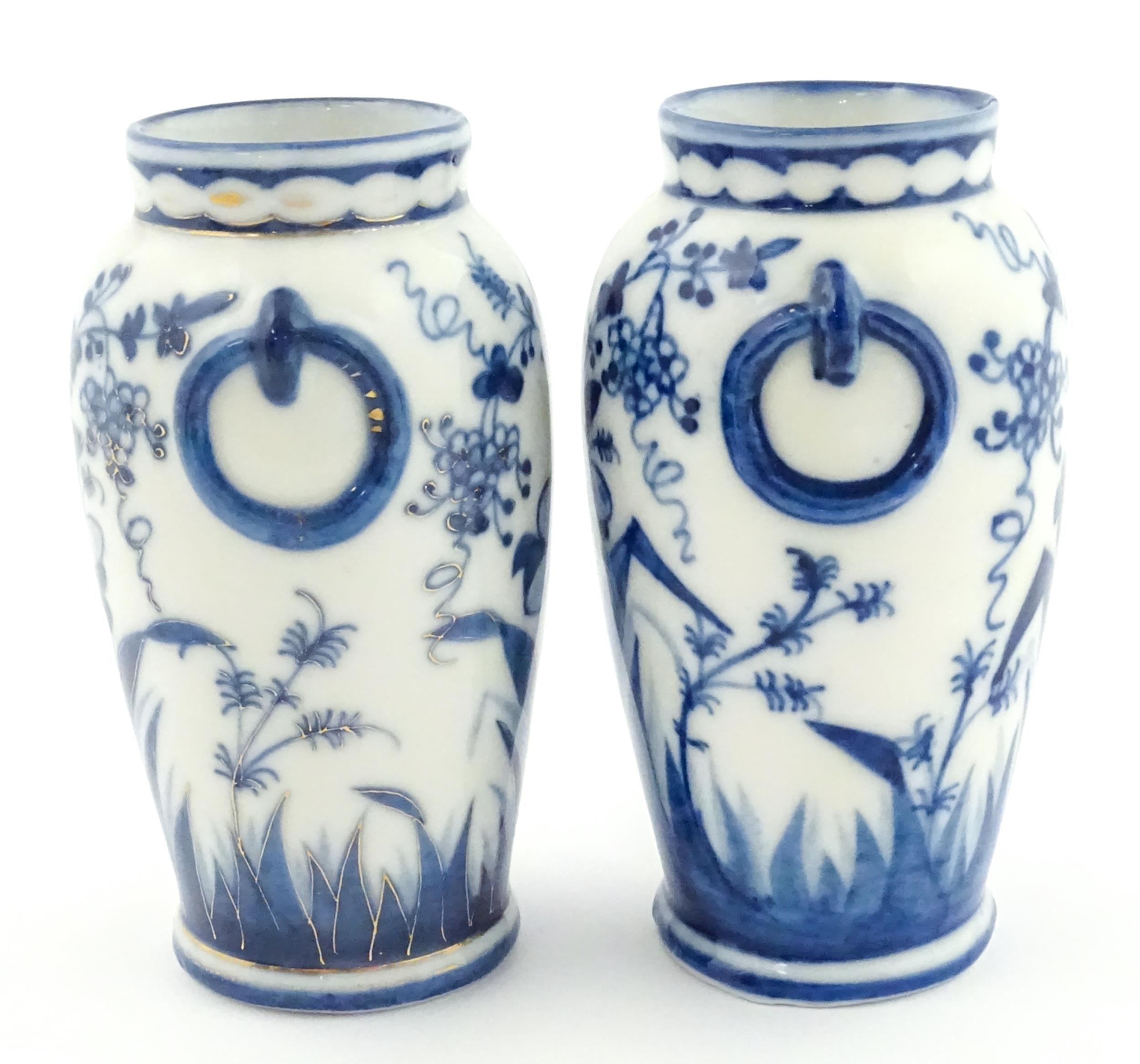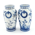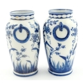 A pair of Chinese blue and white vases with relief ring handles. Marked under. Approx. 4 1/2" high