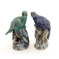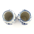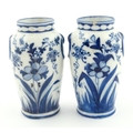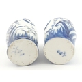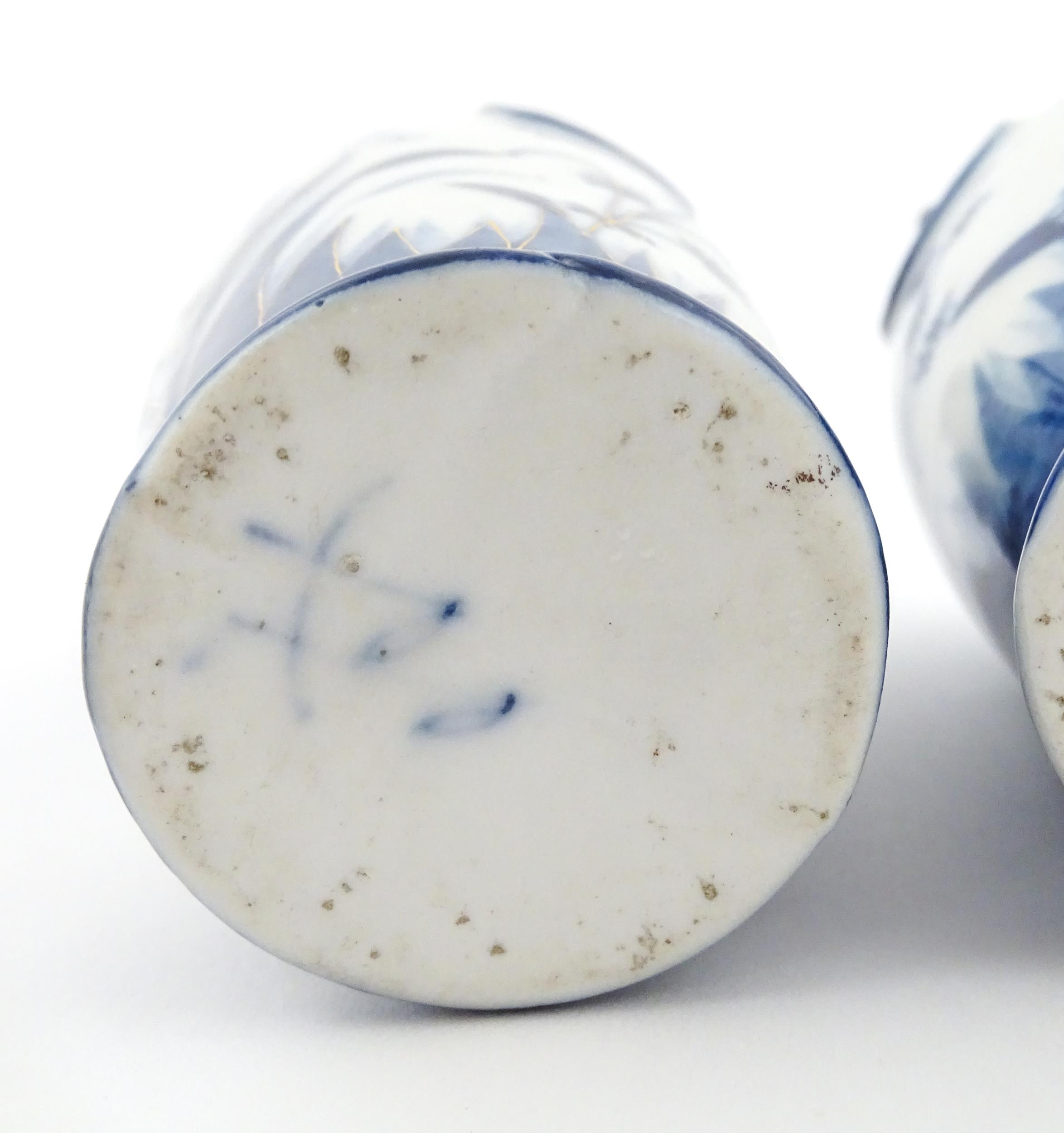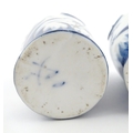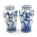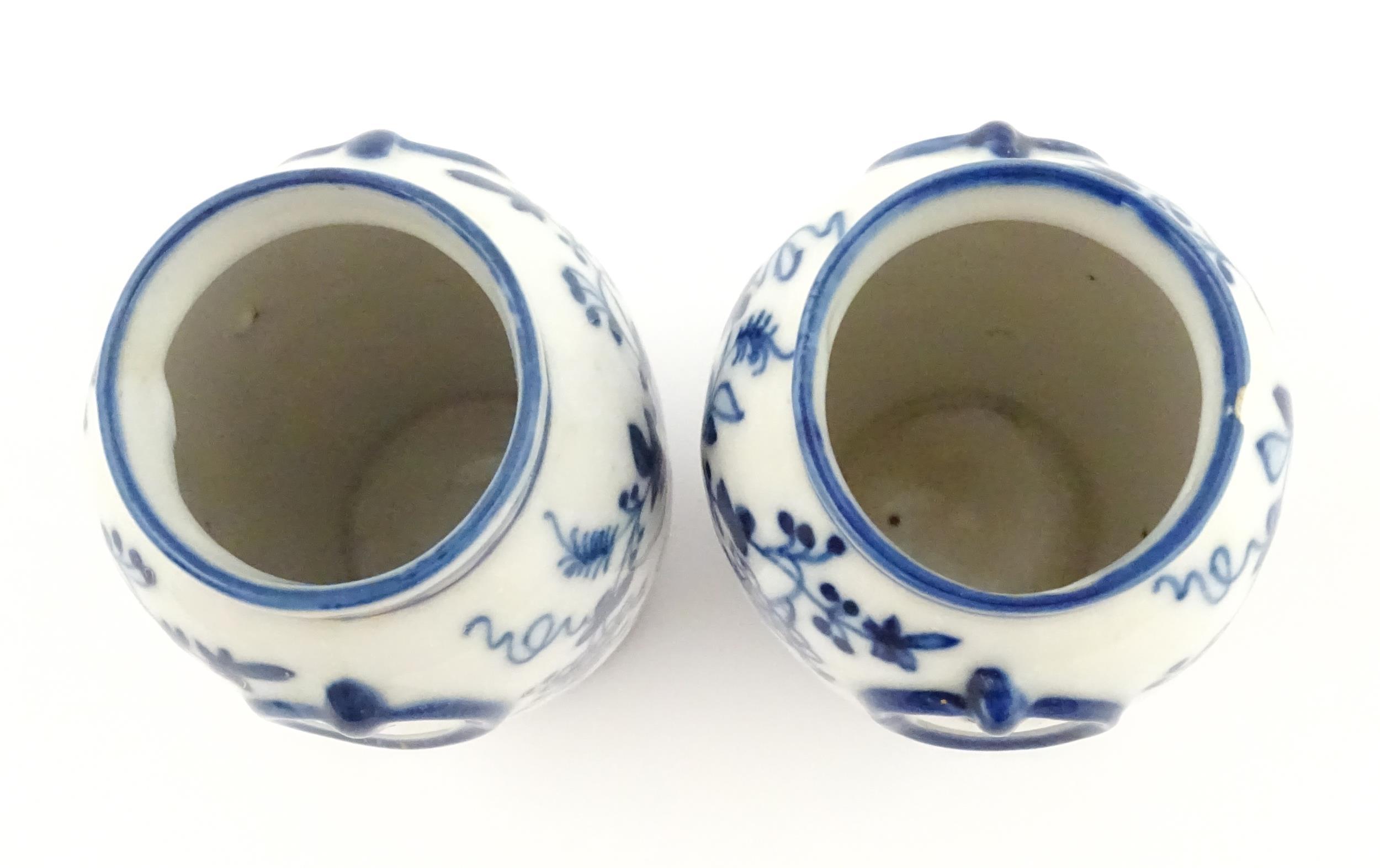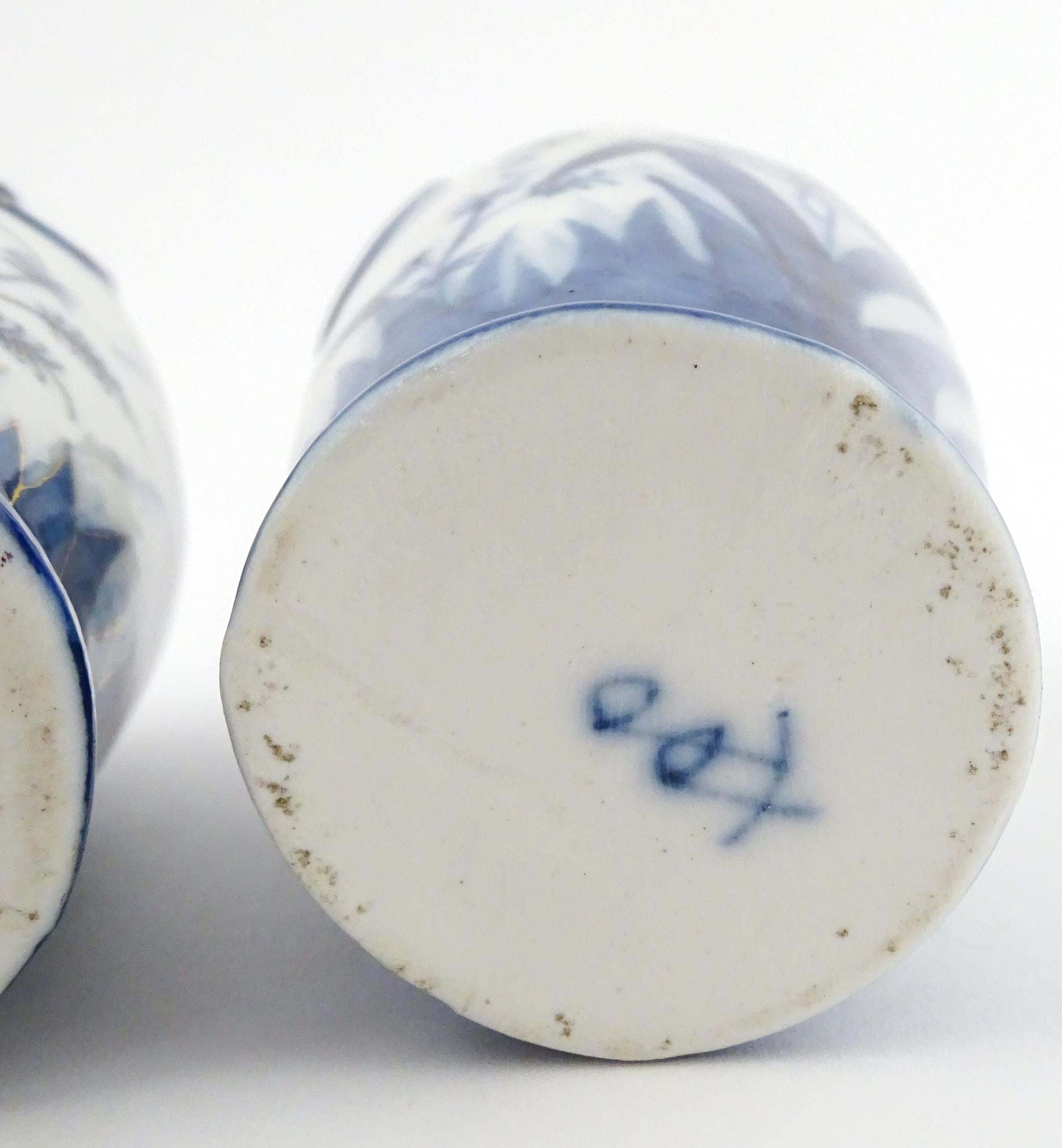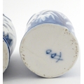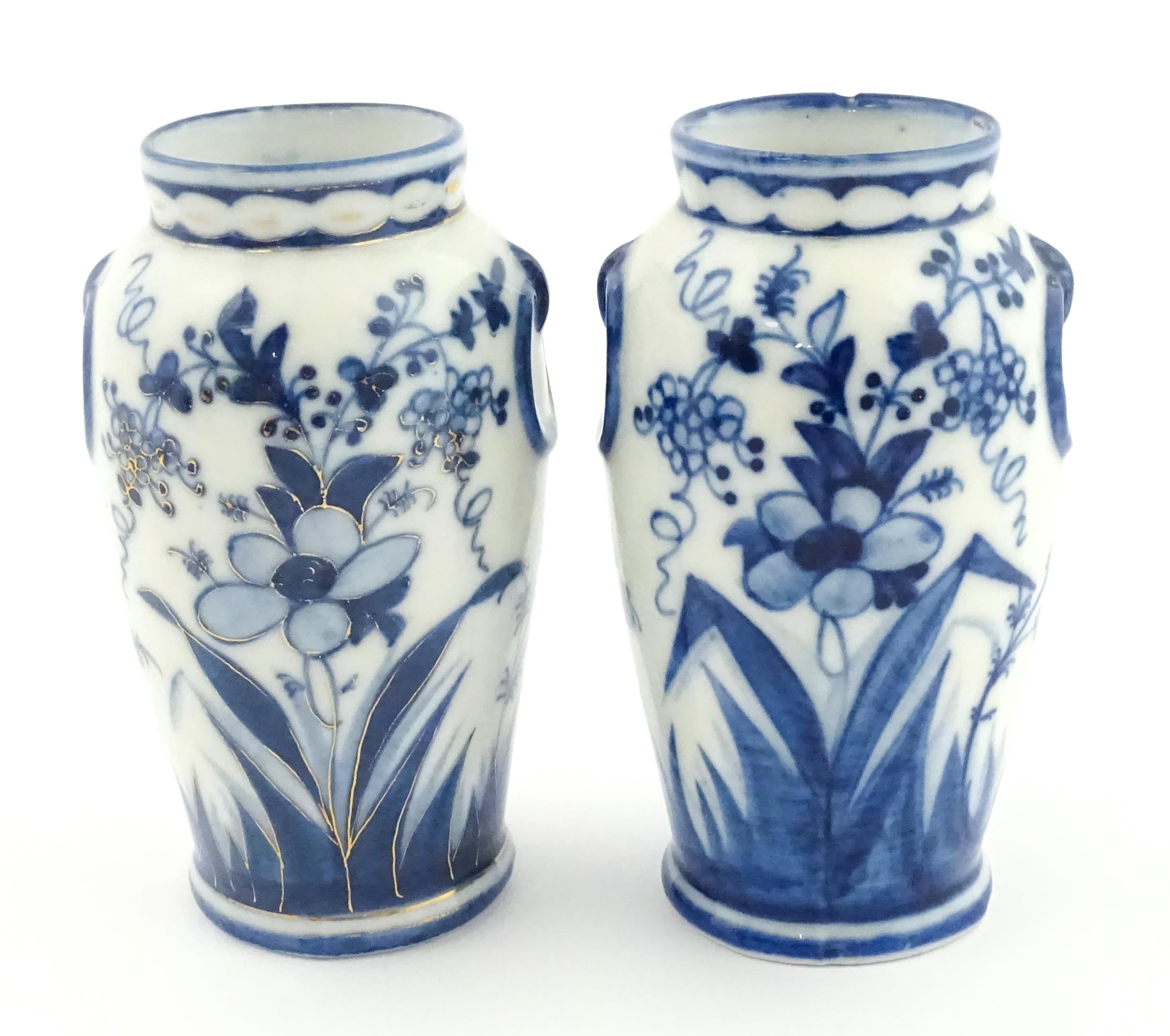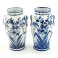 A pair of Chinese blue and white vases with relief ring handles. Marked under. Approx. 4 1/2" high