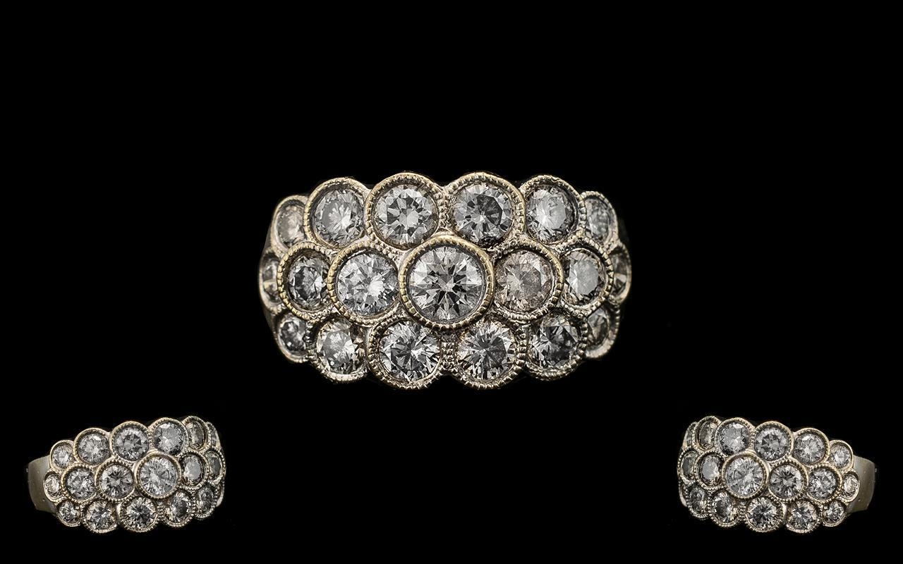 18ct White Gold - Nice Quality Pave Set Diamond Cluster Ring. Fully Hallmarked for 750 - 18ct. The Round Brilliant Cut Diamonds of Good Colour and Clarity. Cal. Diamond Weight 1.46 cts Marked to Interior of Shank. Ring Size ( small ) H - I. Excellent Condition In All Aspects, Including Shank, Stones and Setting. Please Confirm with Photo.