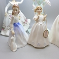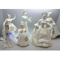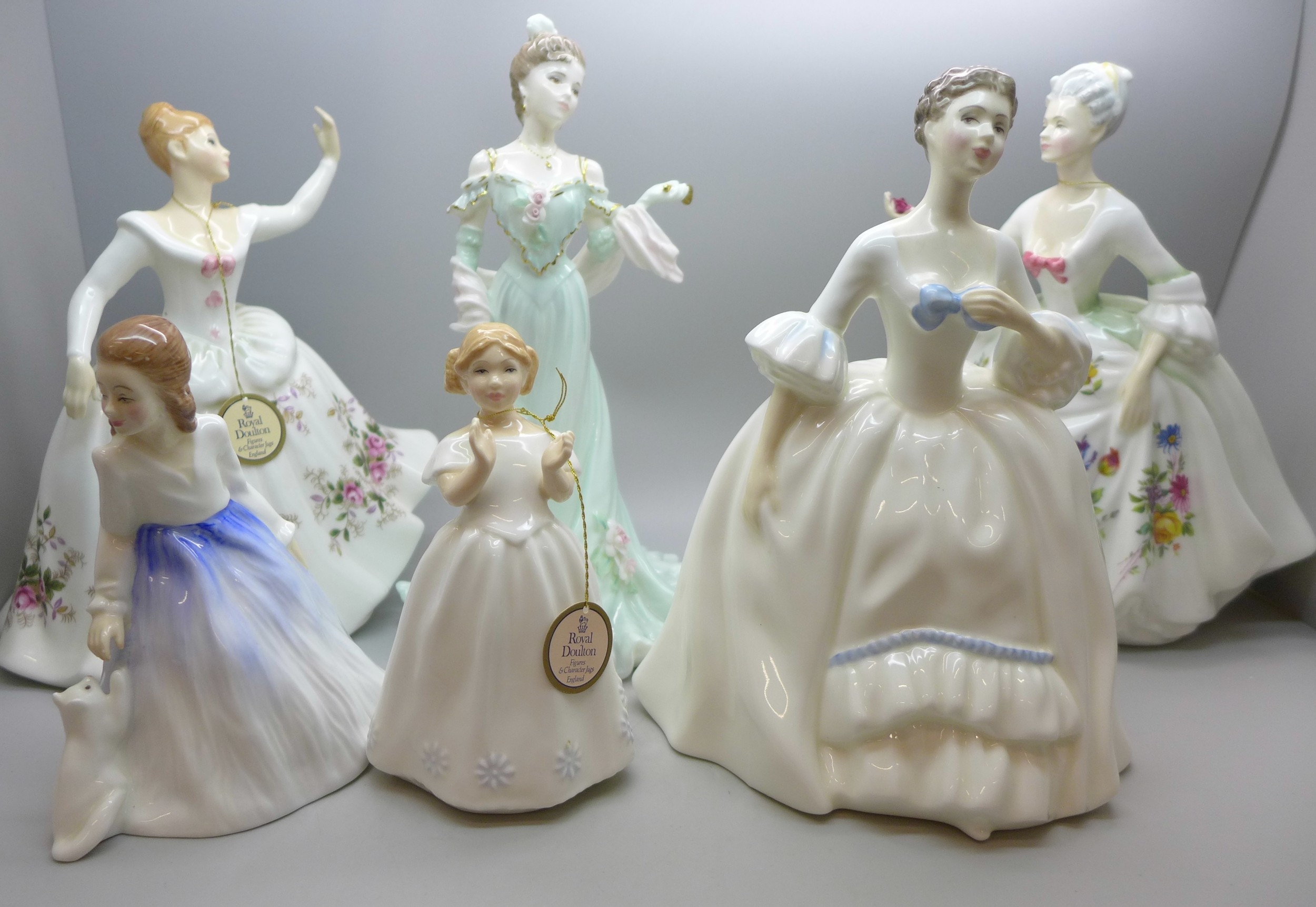 Six figures; five Royal Doulton, Diana, Shirley, Catherine, Andrea and one other, together with a Coalport Belle Epoque Limited Edition figure, 575/12,500 "Clementine" Debut in Paris *Not for Posting and Packing*